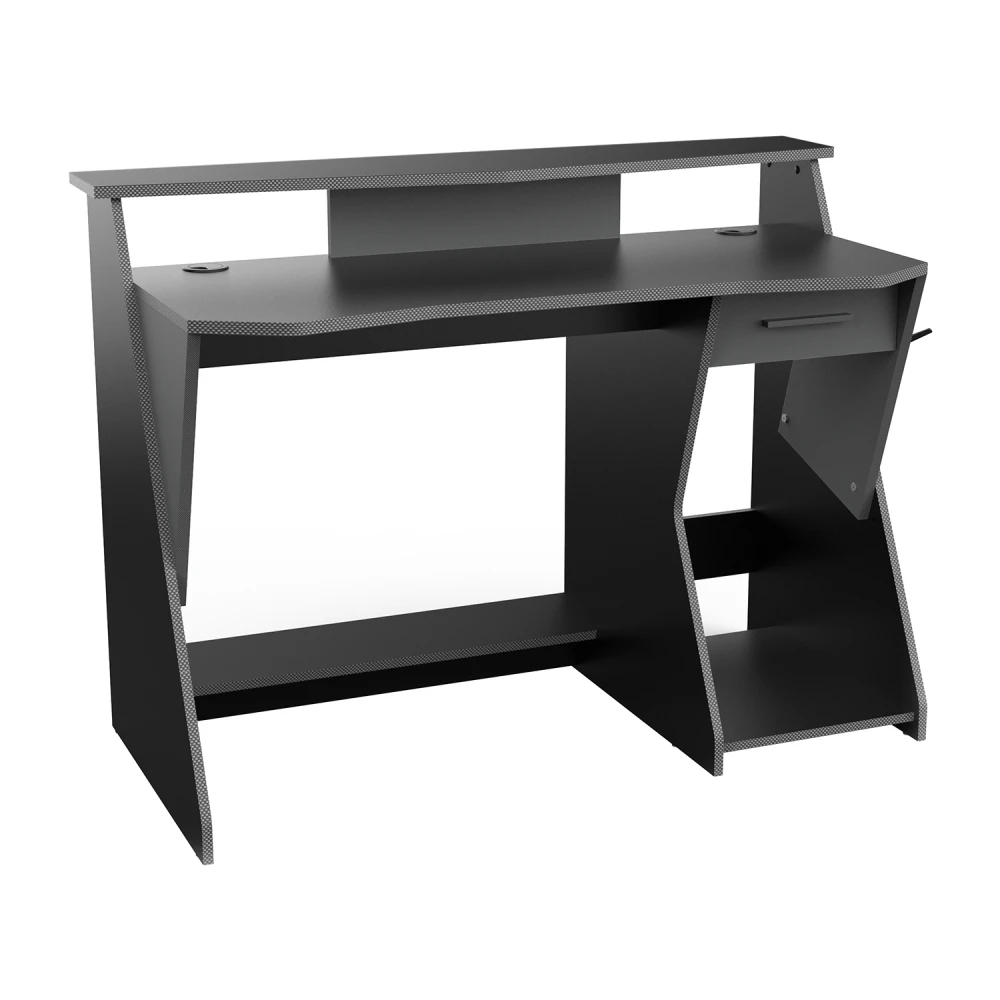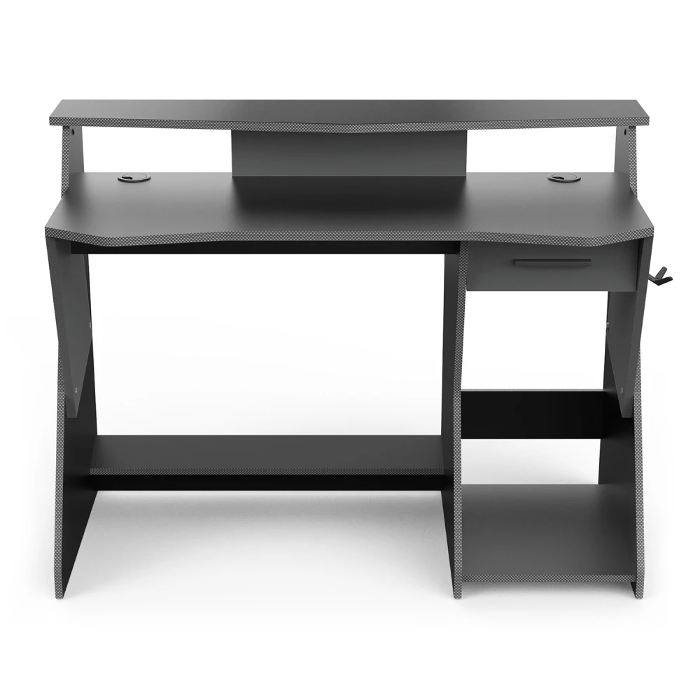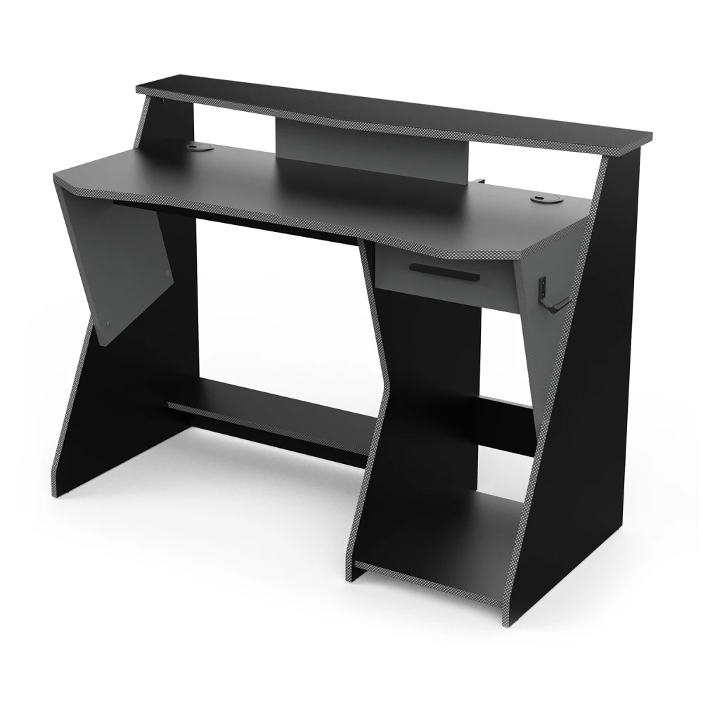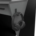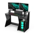 barevné provedení šedá / černá hrany ve vzhledu materiálu z karbonových vláken herní stůl: horní police na 2 velké monitory 1 zásuvka s kovovými pojezdy na příslušenství háček na sluchátka, dvě průchodky na kabely opěrka na nohy, velký prostor pro PC case maximální nosnosti uvedeny v návodu k montáži