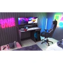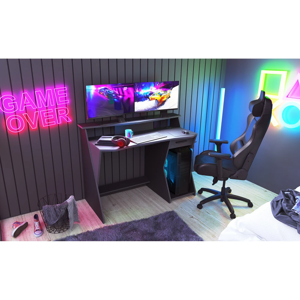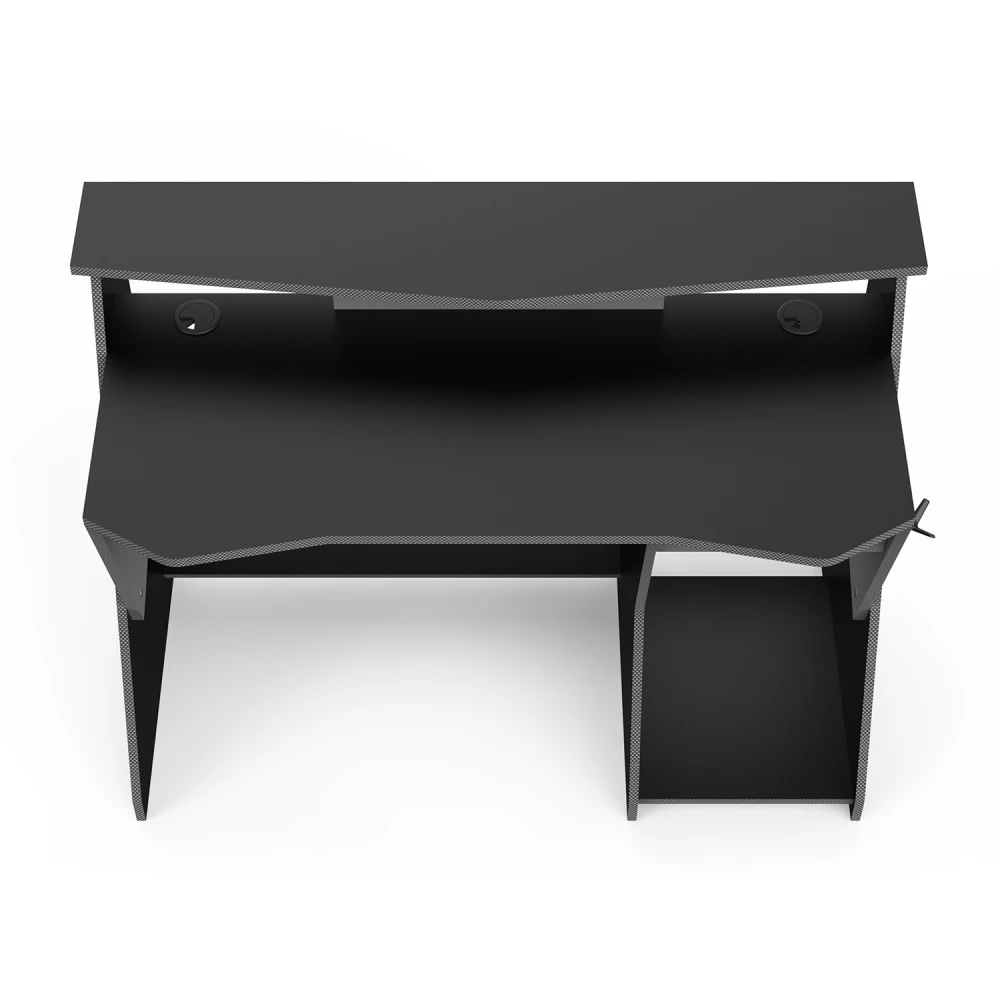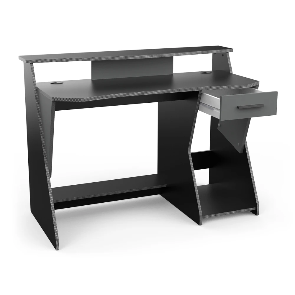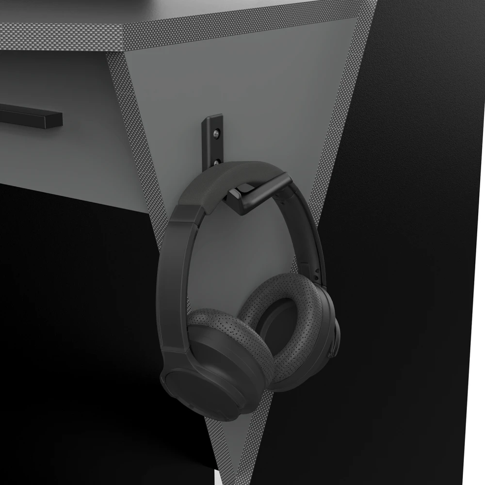 barevné provedení šedá / černá hrany ve vzhledu materiálu z karbonových vláken herní stůl: horní police na 2 velké monitory 1 zásuvka s kovovými pojezdy na příslušenství háček na sluchátka, dvě průchodky na kabely opěrka na nohy, velký prostor pro PC case maximální nosnosti uvedeny v návodu k montáži