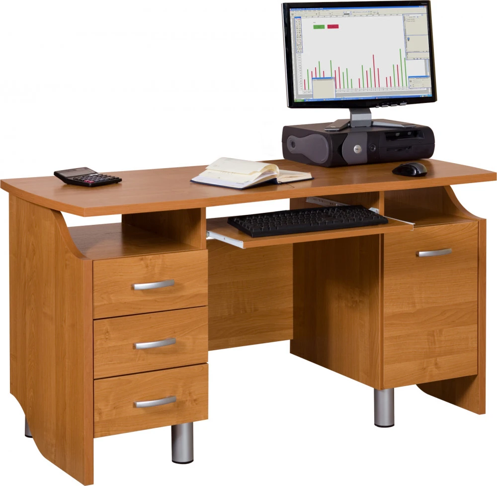 Klasický psací stůl Combi v sobě skrývá praktičnost a skvělý vzhled. Tři zásuvky doplňuje velký úložný prostor a výsuv na klávesnici. Celkový vzhled doplňují stříbrné nohy. Stůl je vyrobený z 16 mm lamina s 0,6 mm ABS hranou, na výběr z několika barevných variant. Dodáváno v demontu.