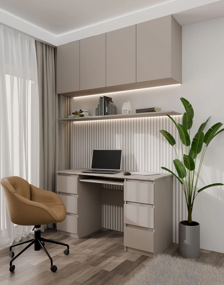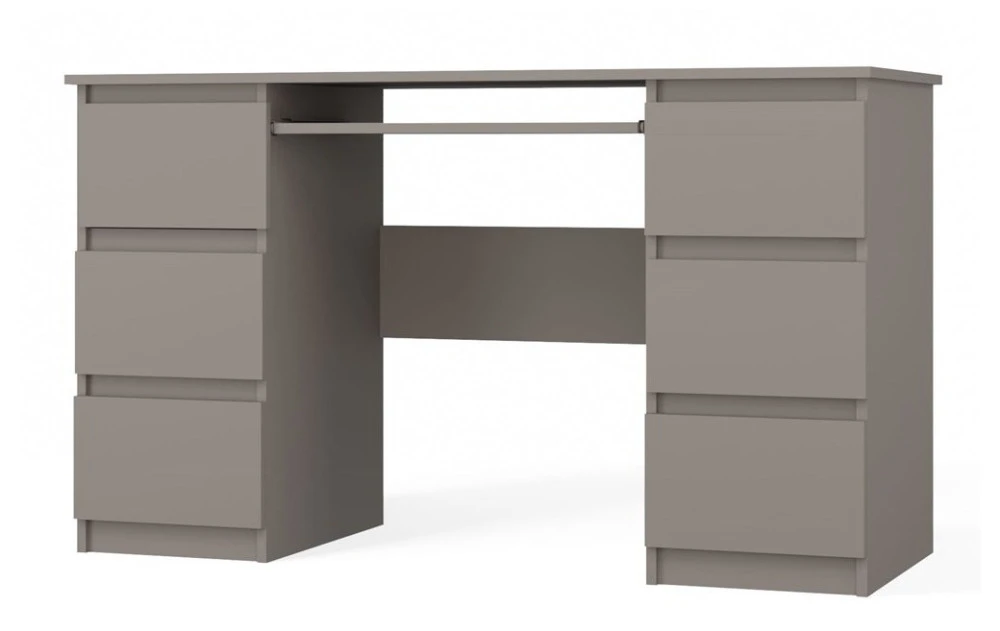 Funkční psací stůl Kima v jednoduchém a moderním designu poskytuje dostatečnou pracovní plochu a díky prostorným zásuvkám také spoustu úložného prostoru. Bezúchytková čela zásuvek zajistí pohodlné používání. Stůl je vyrobený ze snadno udržovatelného lamina, hrany jsou zakončené vysoce odolným ABS materiálem.