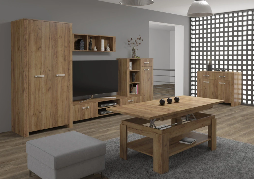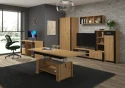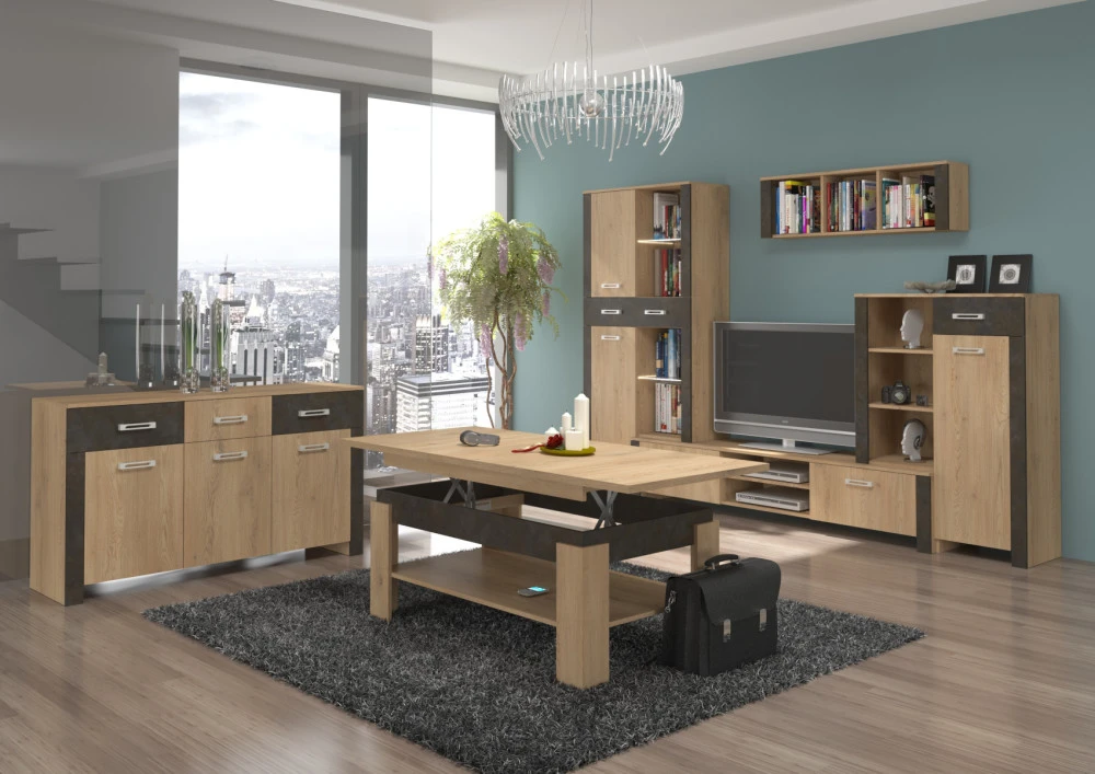 Nízký regál z kolekce Hugo je modulovým komponentem k sestavení vlastní obývací stěny, připojením k televiznímu stolku. Disponuje na pravé straně jednou zásuvkou, skříňkou a na levé straně policovým regálem.
