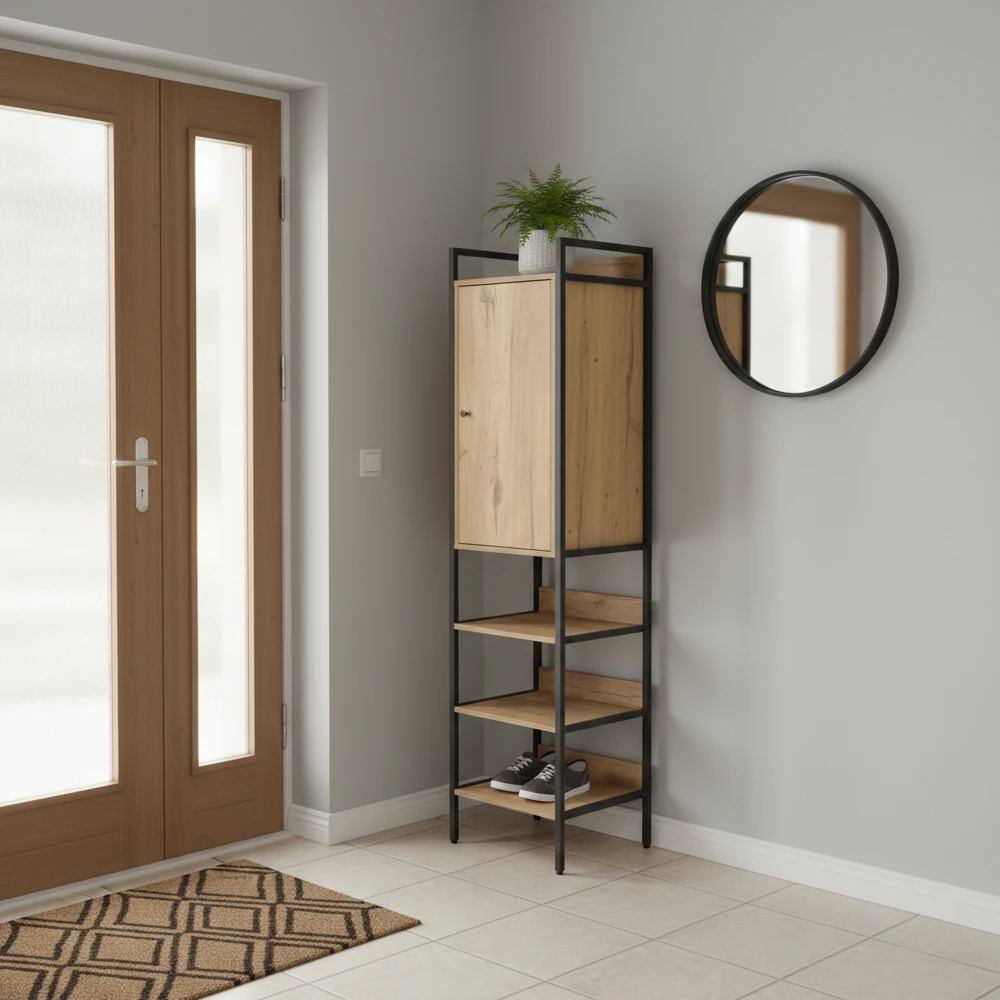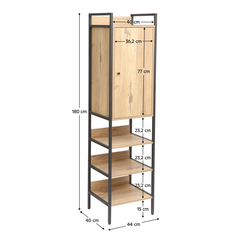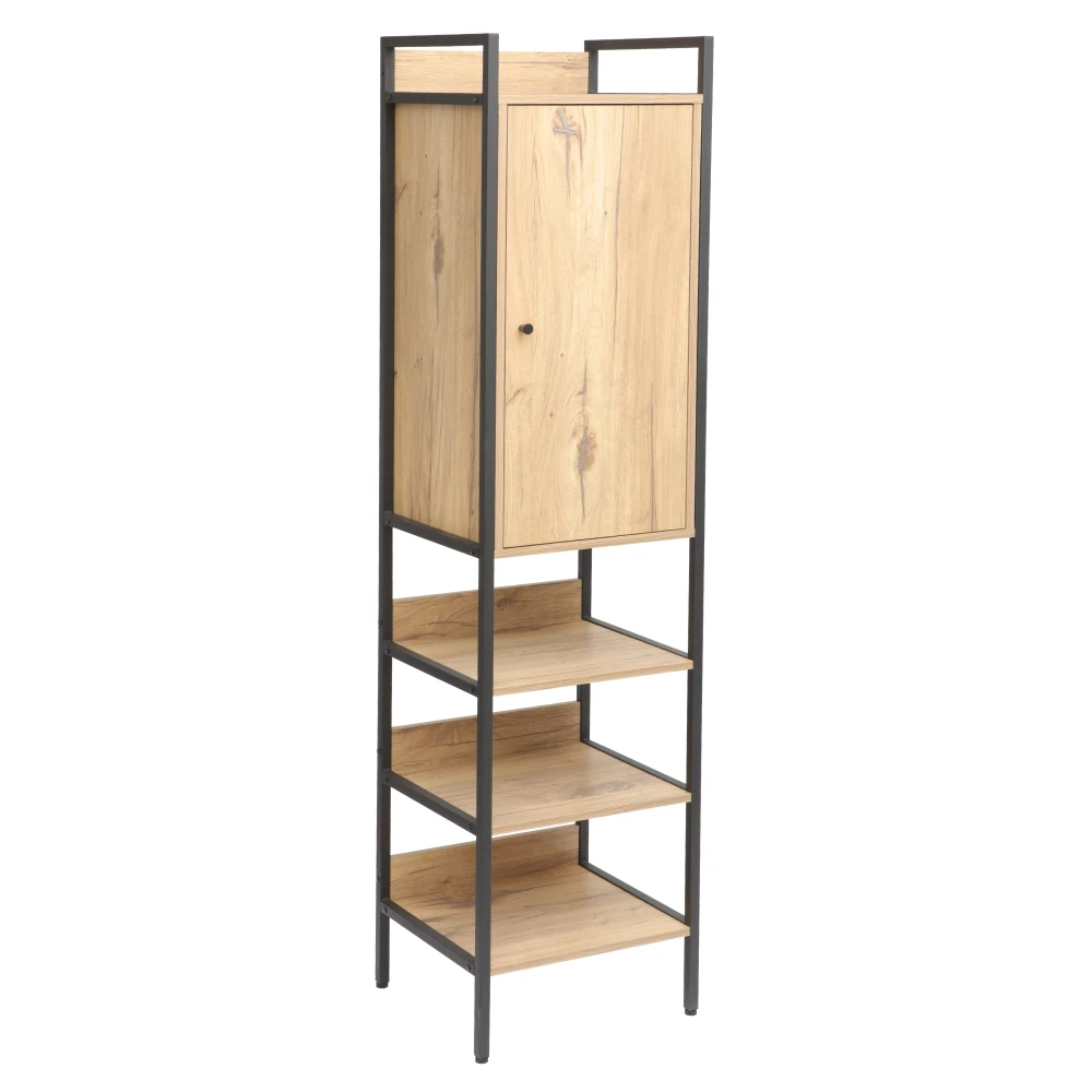 Moderní regál se skříňkou v kombinaci dekoru dubu a černé konstrukce přináší do interiéru oblíbený industriální vzhled a zároveň praktické úložné řešení. Díky úzkému provedení je ideální i do menších prostor, kde efektivně využije výšku místnosti.