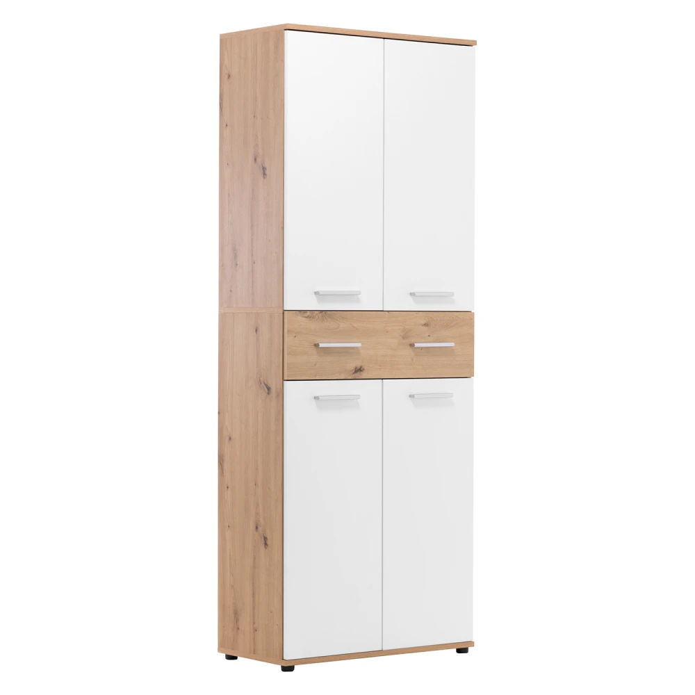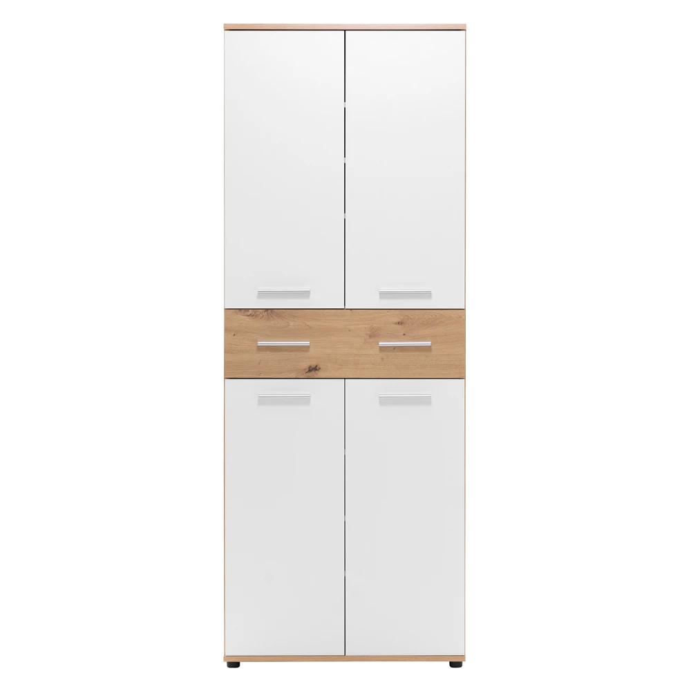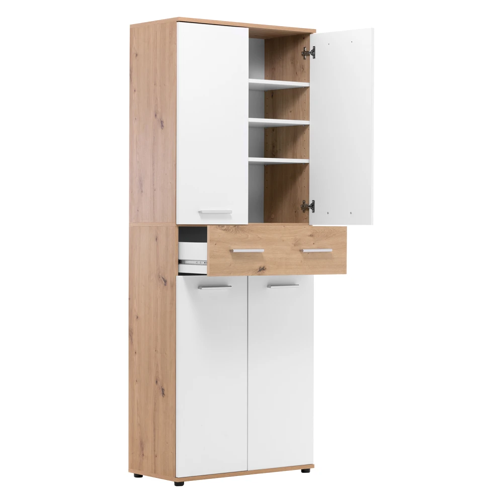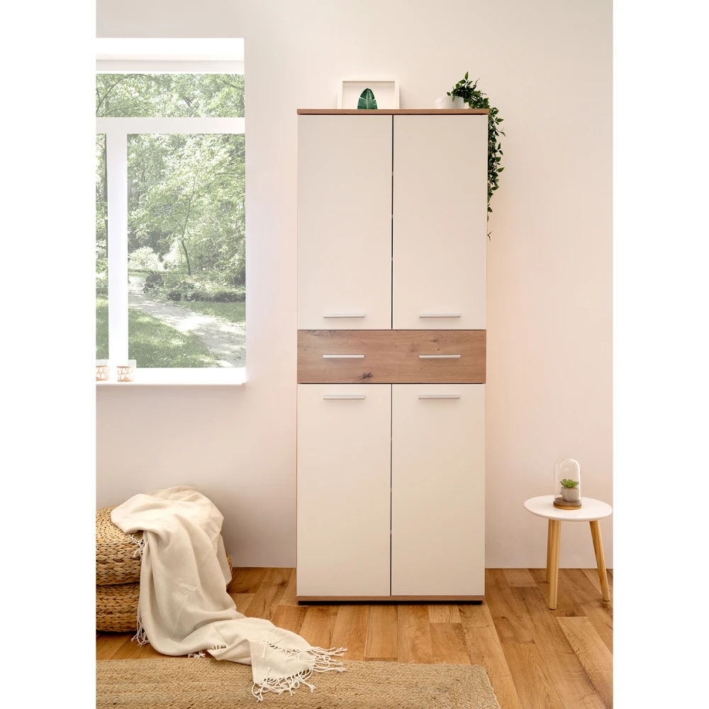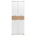 barevné provedení bílá / zlatý dub v horní části 3 variabilní police, v dolní části 3 variabilní police ve střední části zásuvka rozměry některých prvků jsou uvedeny v návodu k montáži