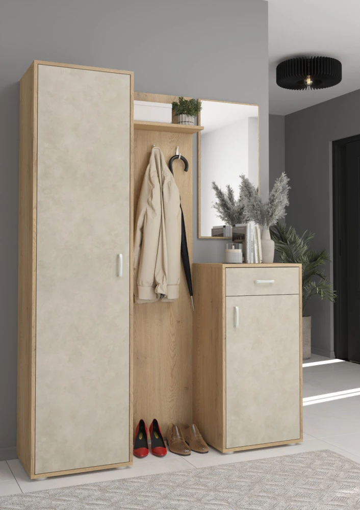 Jednoduchá, ale elegantní předsíňová stěna 4 je díky svým rozměrům vhodná do menších prostorů. Ve skříni je šatní tyč k uložení vašich oděvů. Předsíň je vyrobena z lamina síly 16 mm, na výběr z několika barevných variant. Dodáváme v demontu.