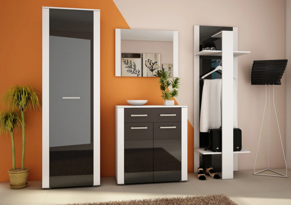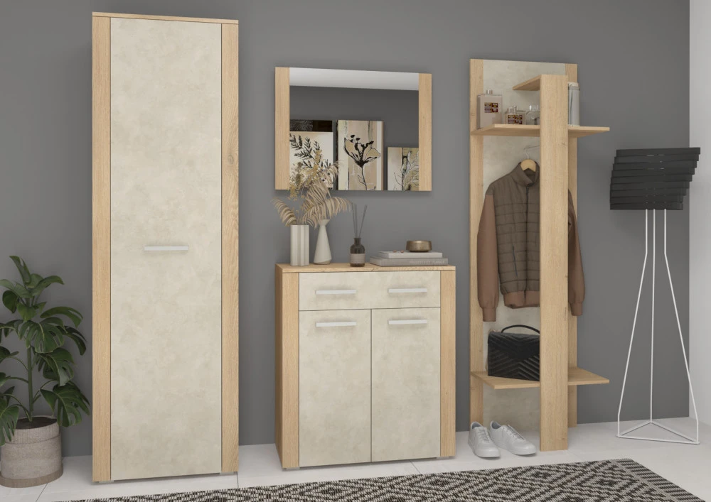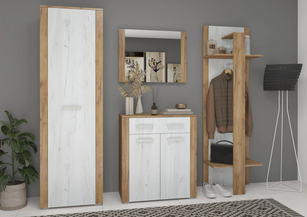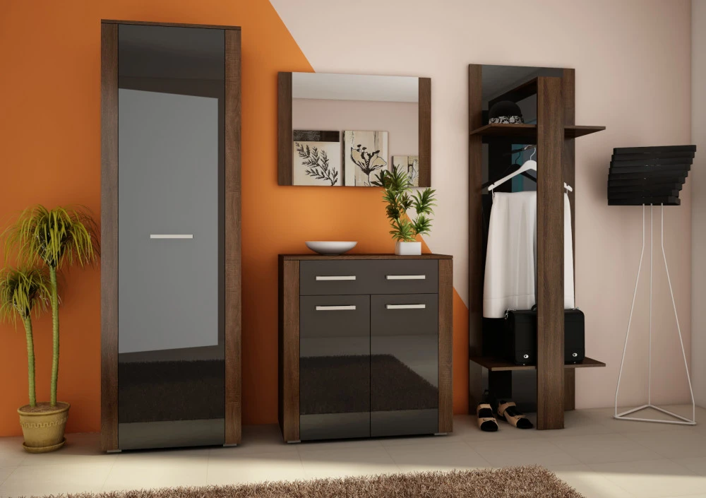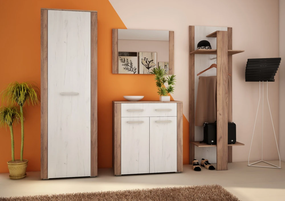 Designová předsíň Cezar je vyrobena z velmi kvalitních LTD materiálů 16 mm. Madla zásuvek a skříněk jsou vyrobeny z odolného tvrzeného plastu. Zařiďte, aby na Vás i na Vaše hosty dýchlo kouzlo domova vždy hned po příchodu. Udělejte první dojem příjemnou atmosférou již v předsíni. Krásná kombinace dvou odstínů bude pastvou pro oči každého hosta. Model si u nás můžete pořídit v matném provedení či v lesku za nepatrný příplatek. Dále nabízíme výběr z několika barevných variant. Tato sestava se skládá z komody, skříně a zajímavě řešeného věšáku.