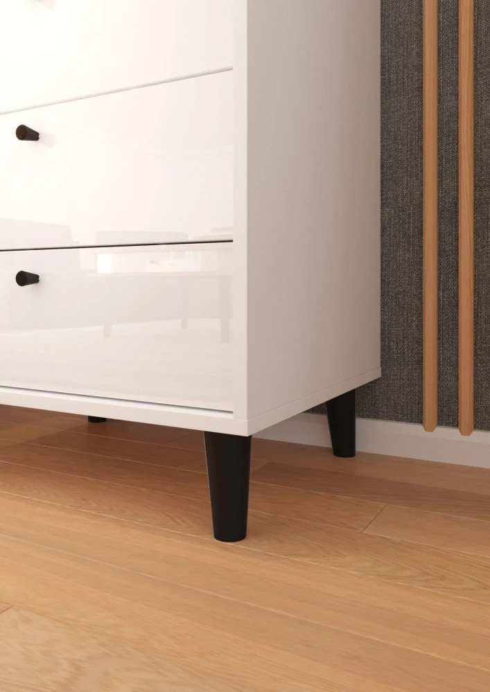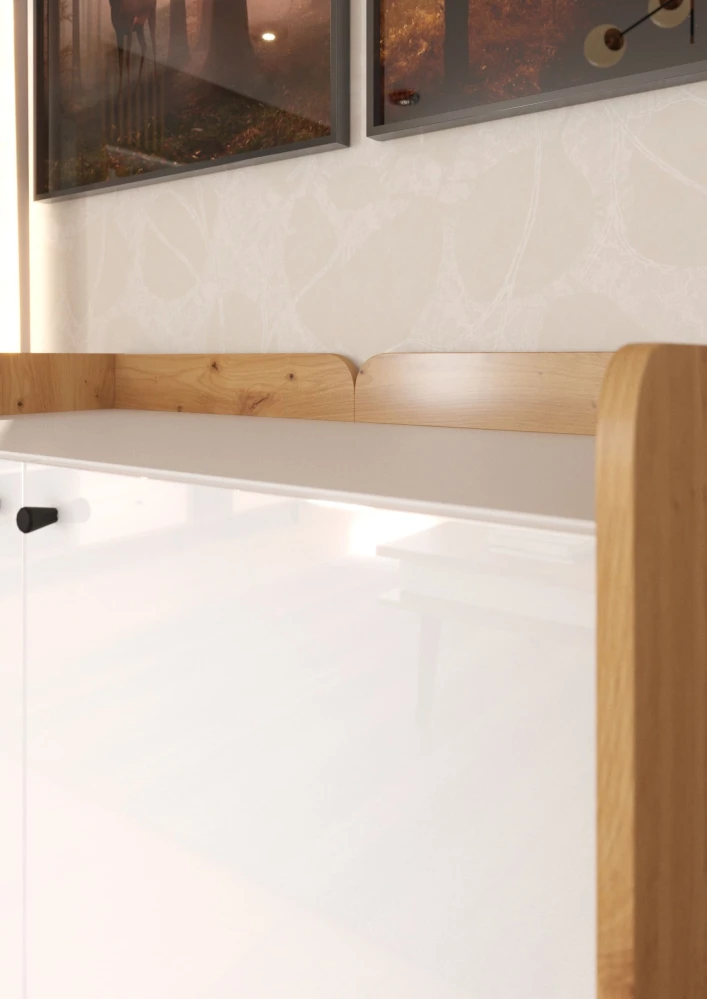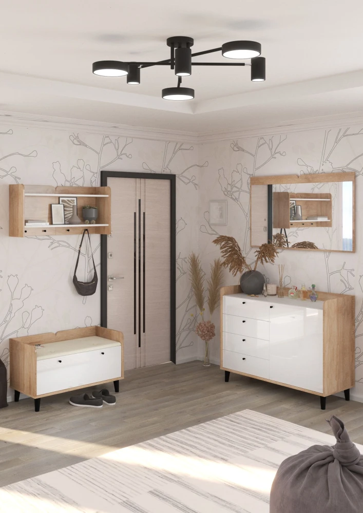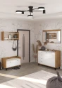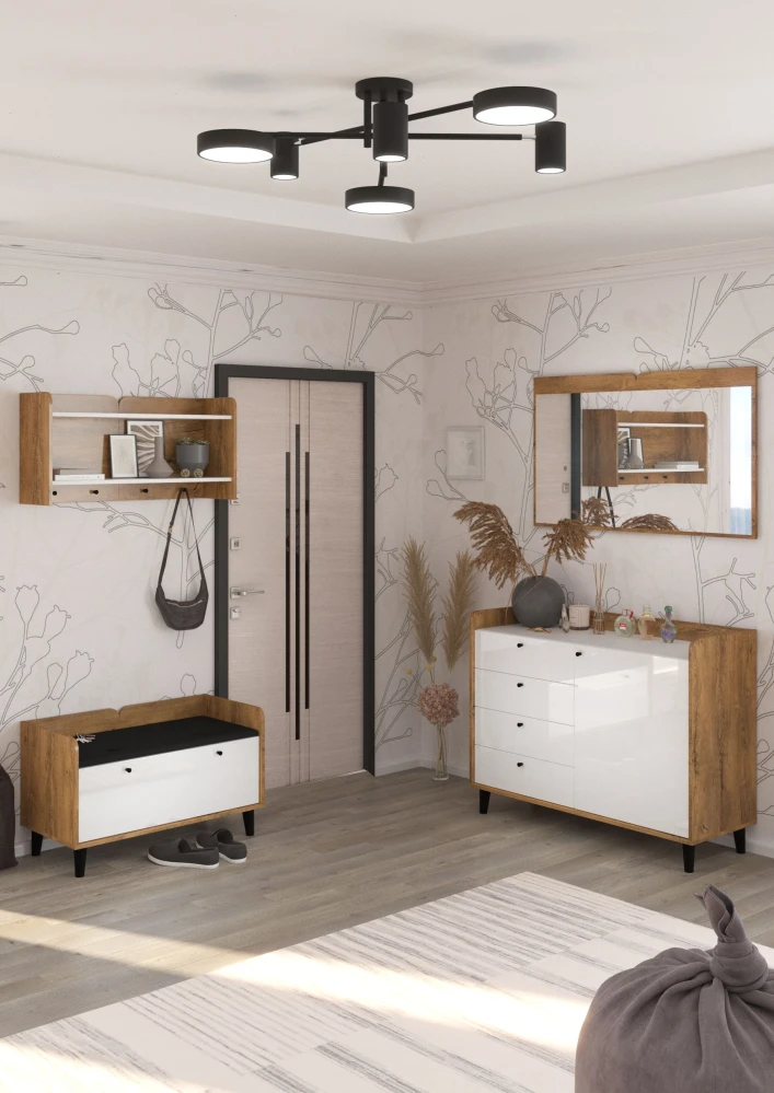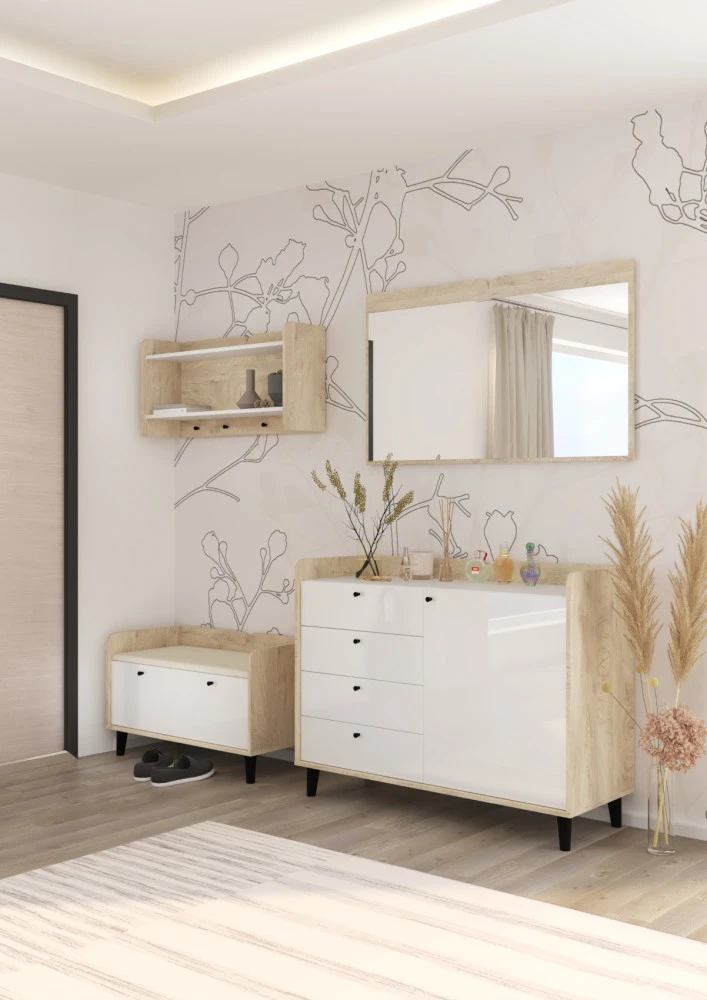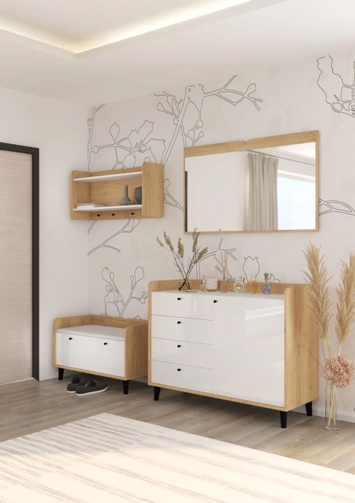 Hledáte funkční, trendový a nadčasový nábytek, který je propracovaný a snadno se udržuje? Systém Dolce uspokojí vaše nároky na design i funkčnost.Kolekce nábytku Dolce vyniká designem, vysokou funkčností a čistými liniemi. Lamino materiál o síle 16 mm a 25 mm doplňují ABS hrany, které chrání nábytek proti mechanickému poškození. Skříňky i zásuvky se systémem tichého dovírání zvýší komfort užívání.Výrazným prvkem jsou černé dřevěné nožky různých výšek, které dodají celé kolekci originální vzhled. A nejen to, vyšší nožky jsou také praktické při uklízení. Vitríny jsou vybavené kouřovými skly, které ještě více zdůrazní originální vzhled systému. Černou barvu mají i úchyty a spolu s bílým leskem na předních plochách skvěle doplňují dřevodekory reflektující moderní trendy v bydlení. S kolekcí Dolce nemůžete šlápnout vedle!Botník má sedák čalouněný ekokůží v černé nebo béžové barvě - vyberte si viz parametry.Sestava se skládá z botníku Dolce 22 a věšáku Dolce 25.Rozměry:- botník Dolce 22: šířka 90 cm, hloubka 46 cm, výška 54 cm- věšák Dolce 25: šířka 90 cm, hloubka 25 cm, výška 45 cmPředsíň vám dodáme v demontu. Jednotlivé části sestavy si můžete také objednat samostatně, či je zkombinovat s jinými prvky kolekce Dolce a vytvořit si tak předsíň podle svých představ. Vyobrazená komoda Dolce 03 a zrcadlo Dolce 09 nejsou součástí ceny, můžete si je doobjednat viz související zboží.