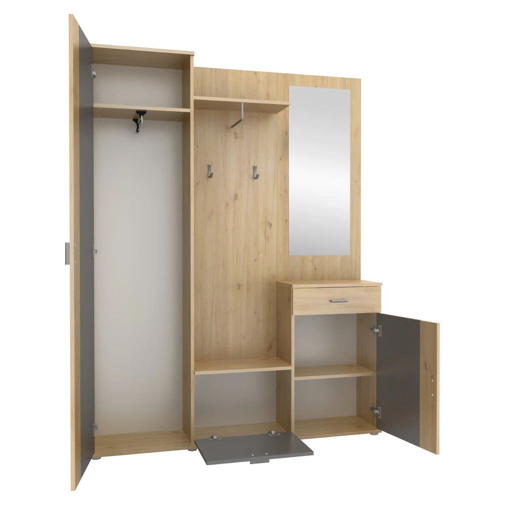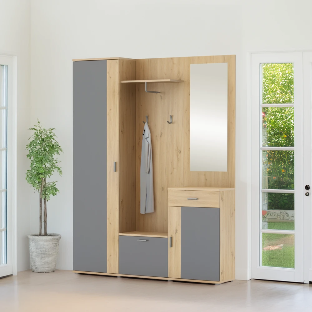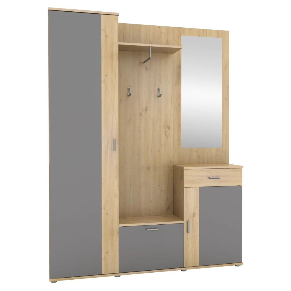 Stylová předsíňová stěna v kombinaci dekoru dub artisan a grafit je ideální volbou pro každou moderní domácnost. Nabízí praktické uspořádání, které ti pomůže udržet pořádek hned u vstupu do bytu a zároveň vytvoří reprezentativní první dojem.