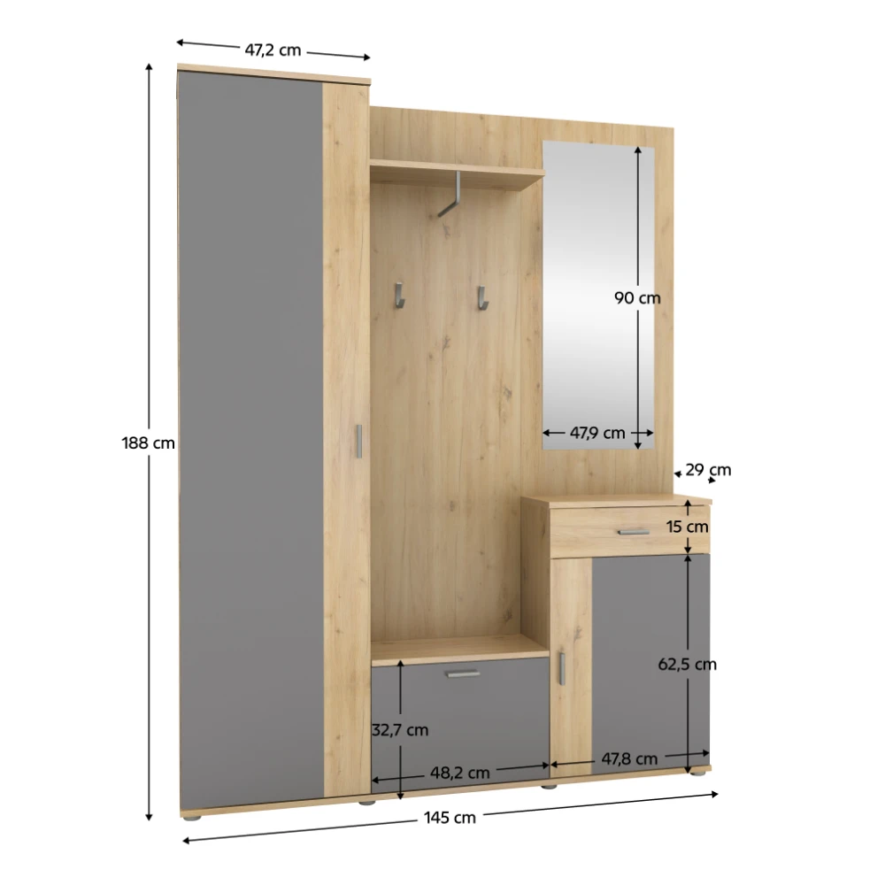 Součástí stěny je zrcadlo o rozměrech 47,9 × 90 cm, které opticky zvětší prostor a zároveň oceníš při každodenní kontrole vzhledu před odchodem z domu.