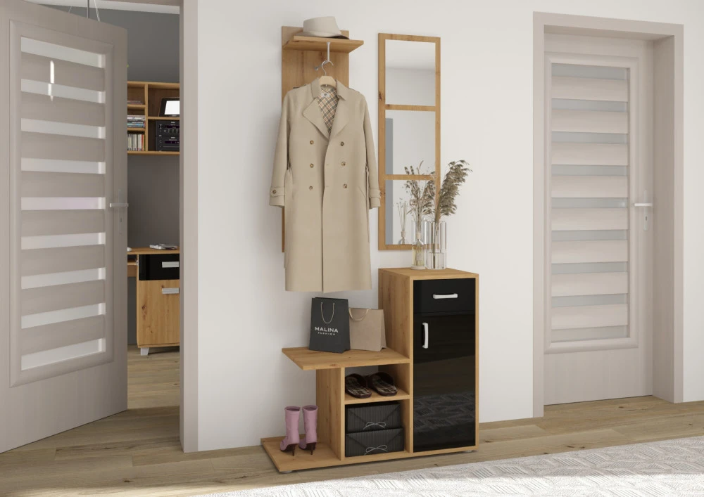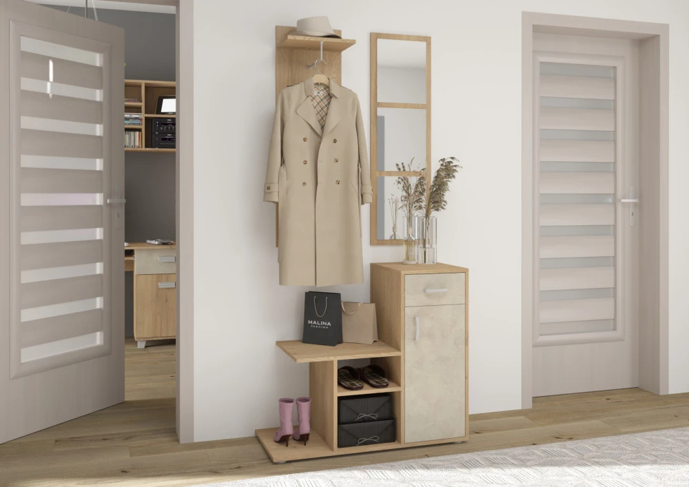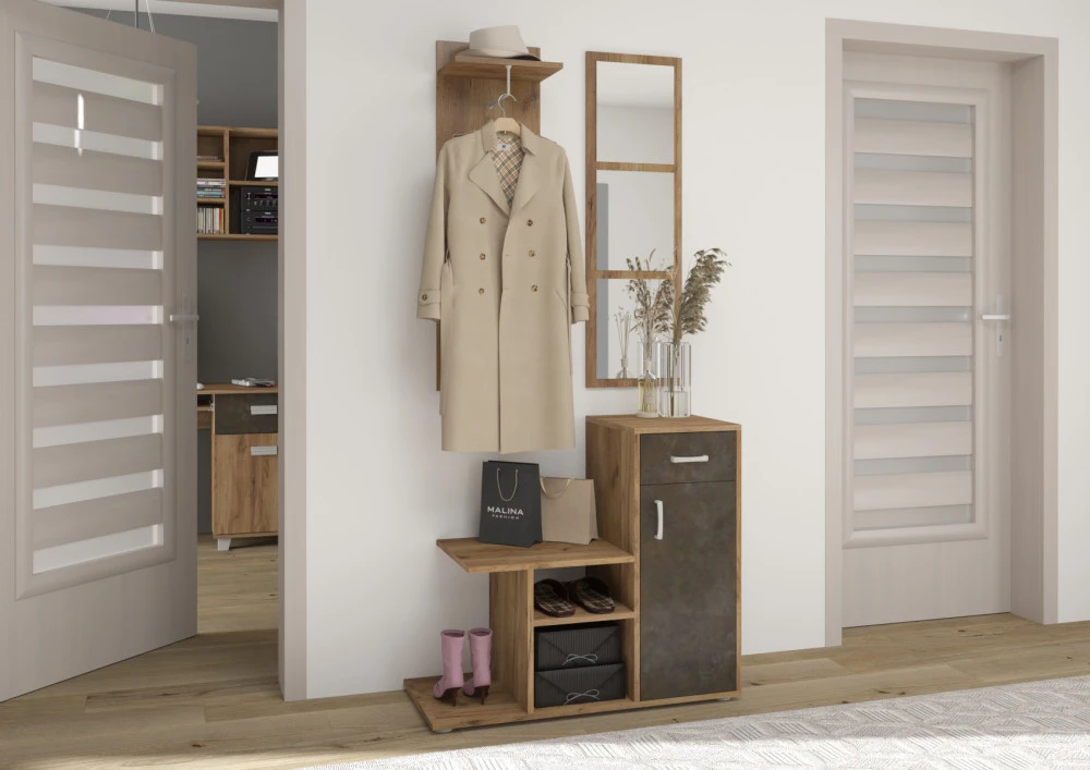 Menší, ale velmi moderní předsíň Mika, vhodná především do menších prostor. Součásti předsíně je botník s policemi, skříňkou a zásuvkou, závěsná odkládací stěna a zrcadlo.