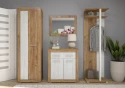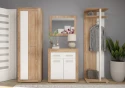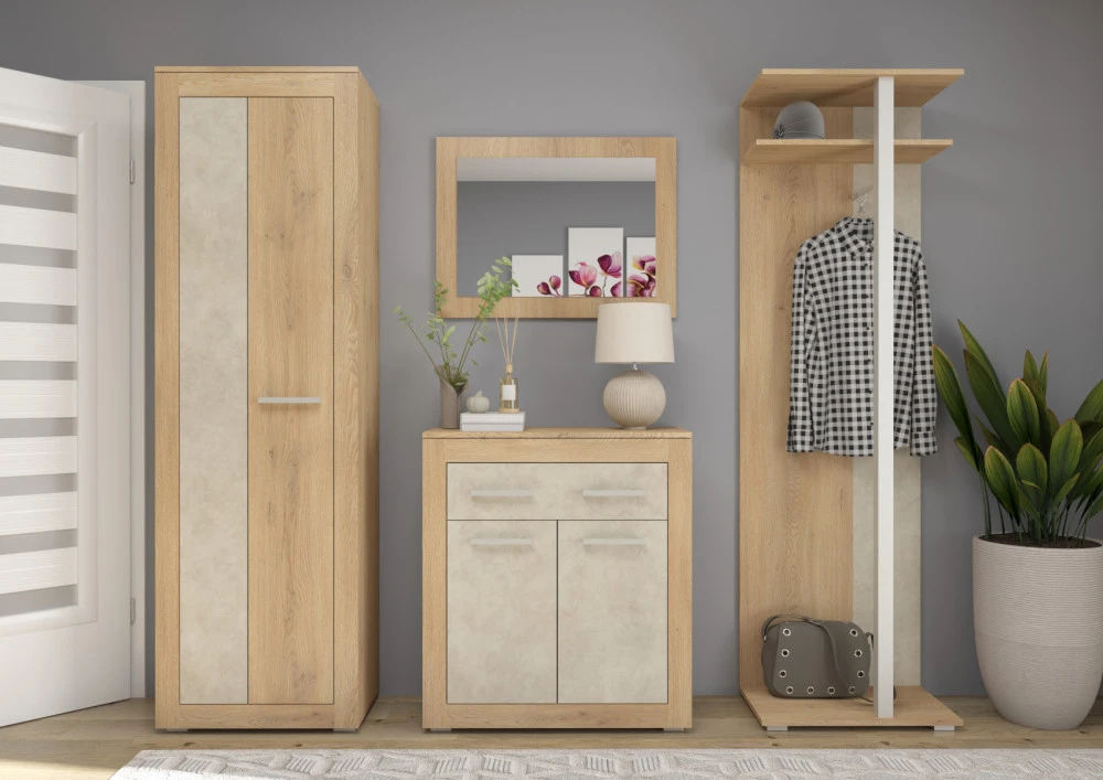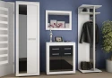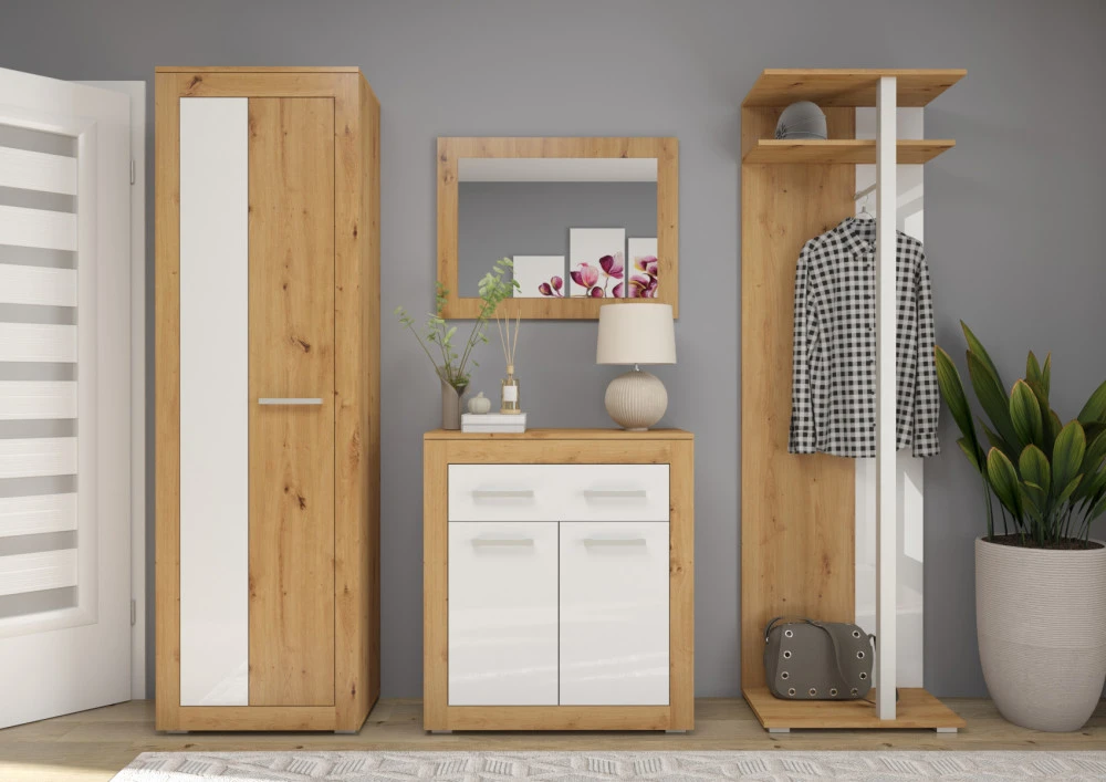 Moderní předsíň Neron je z kvalitního lamina o síle 16 mm. Madla zásuvek a skříněk jsou z odolného tvrzeného plastu a jejich stříbrná barva vkusně doplňuje všechny barevné kombinace, které si můžete vybrat. Model Neron nabízíme v celomatném provedení či s doplňky v lesku za nepatrný příplatek. Sestava se skládá z komody, zrcadla, skříně a zajímavě řešeného věšáku.
