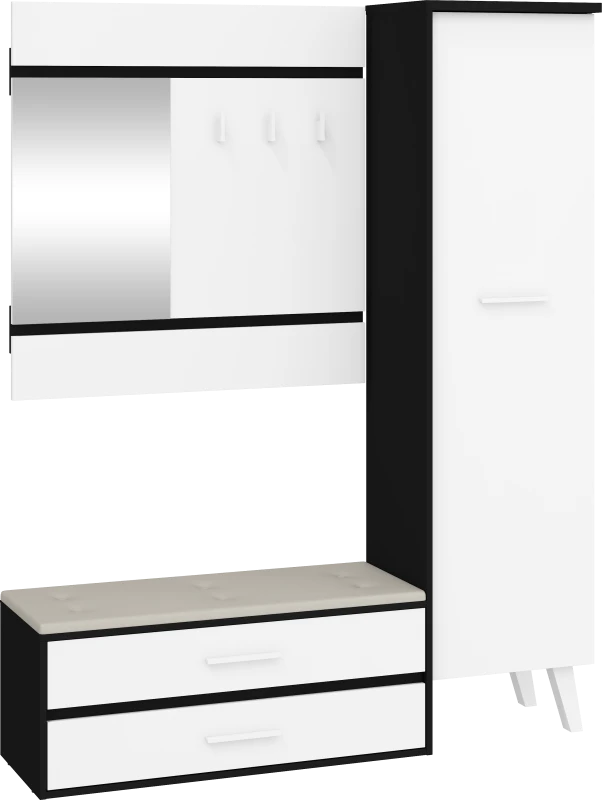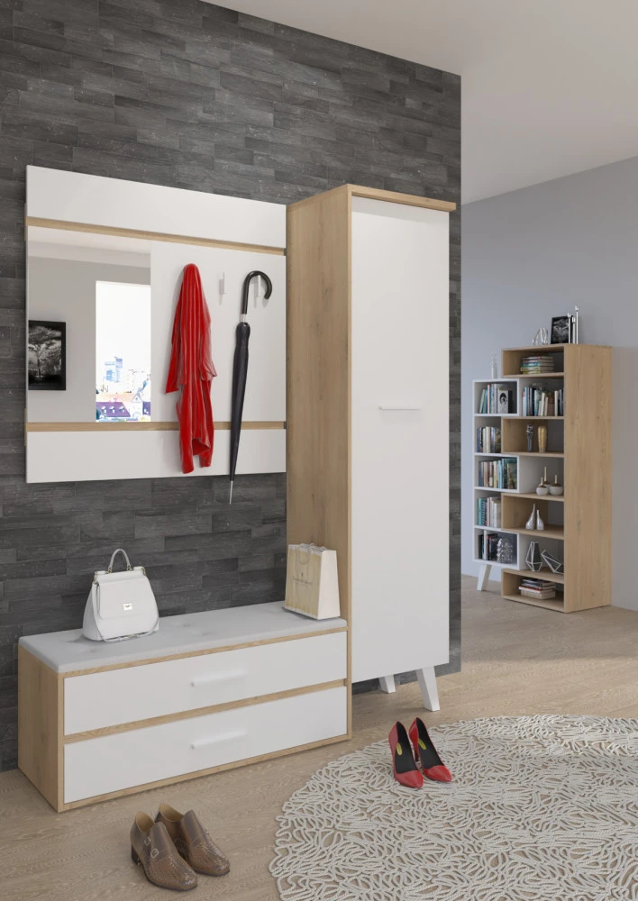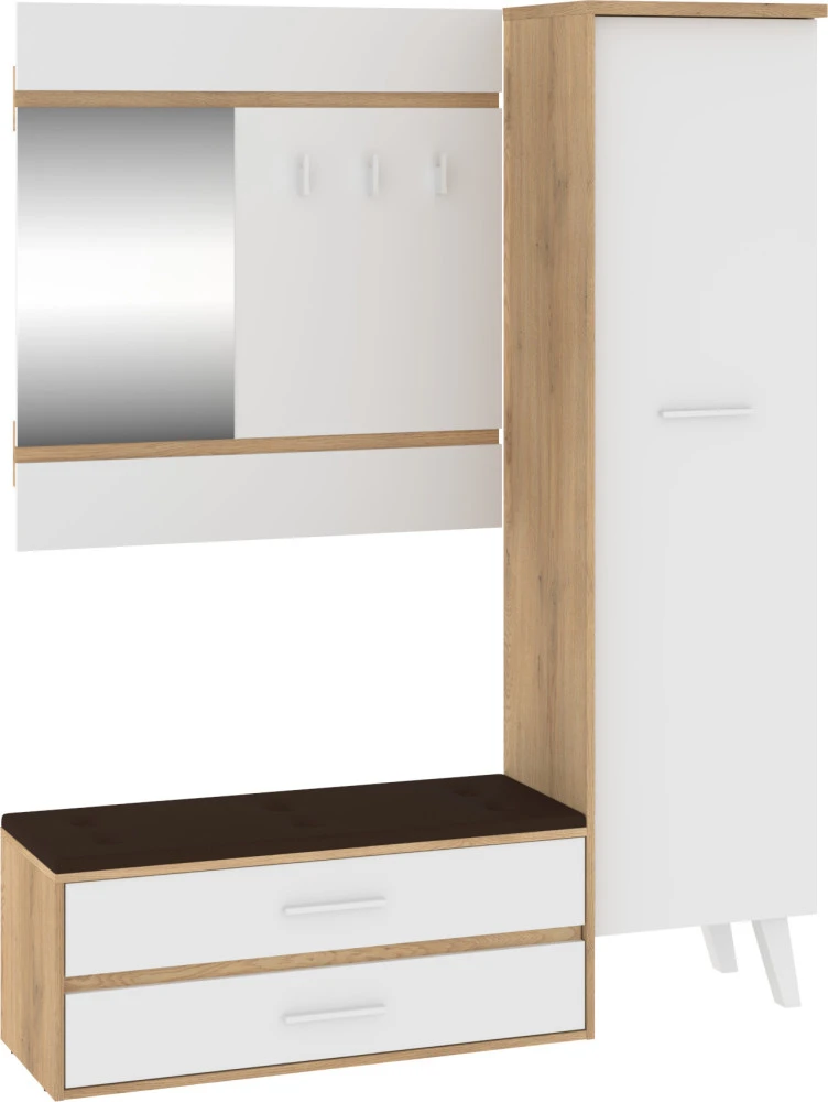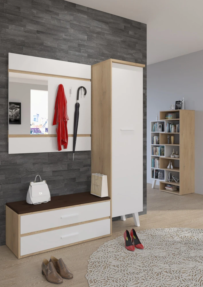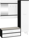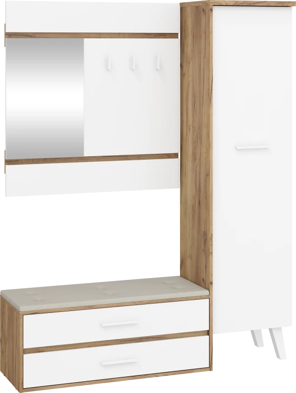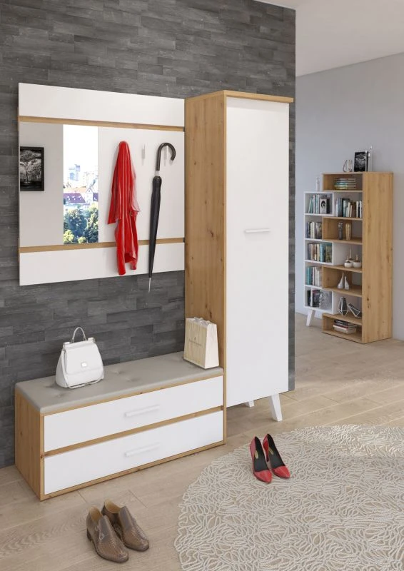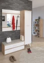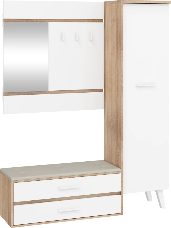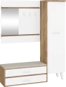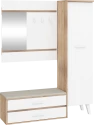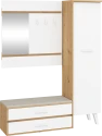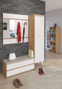 Předsíňová stěna Nordis 18 stylově doplní vaši domácnost. Předsíň je vybavená věšákem se zrcadlem, botníkem s výklopnými dvířky, který má sedák čalouněný ekokůží a skříní, v níž najdete šatní výsuv a 2 police.