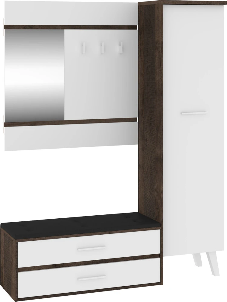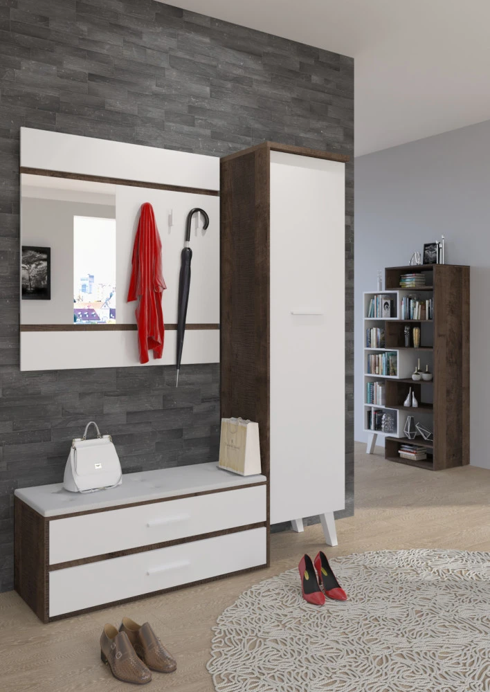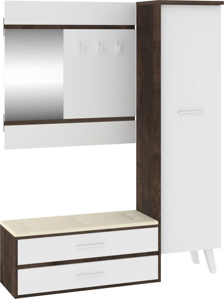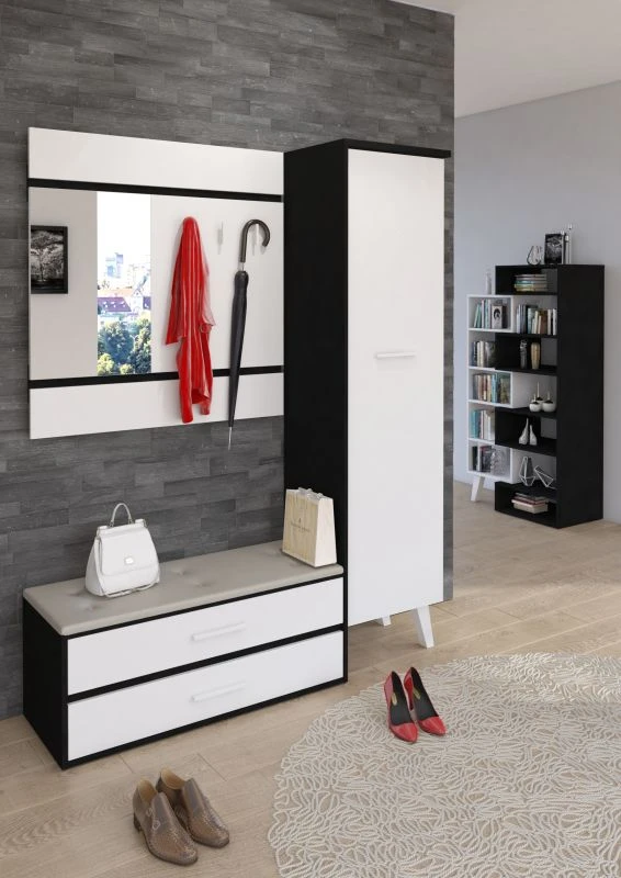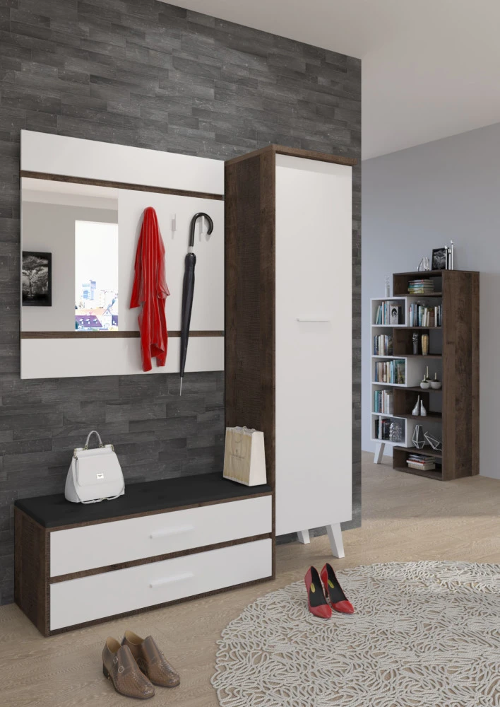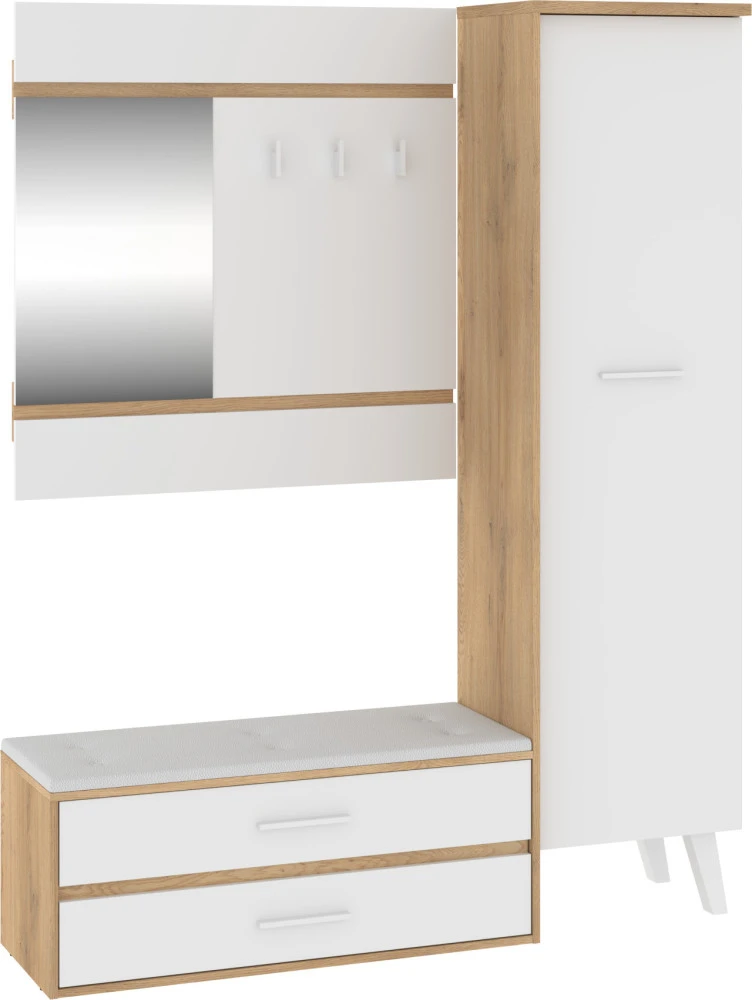 Předsíňová stěna Nordis 18 stylově doplní vaši domácnost. Předsíň je vybavená věšákem se zrcadlem, botníkem s výklopnými dvířky, který má sedák čalouněný ekokůží a skříní, v níž najdete šatní výsuv a 2 police.
