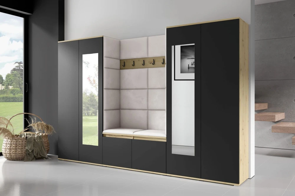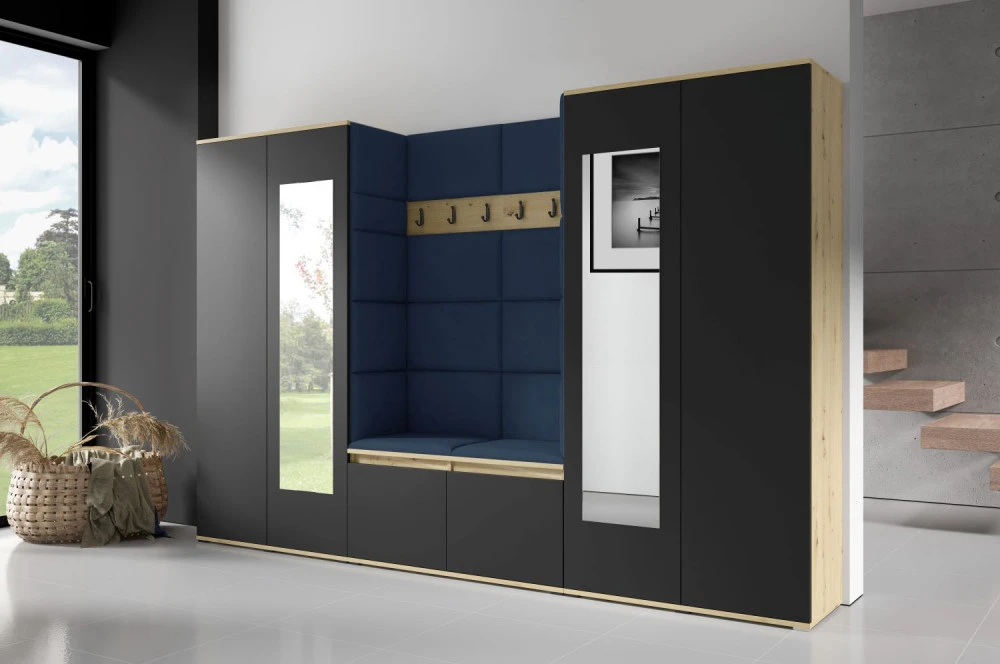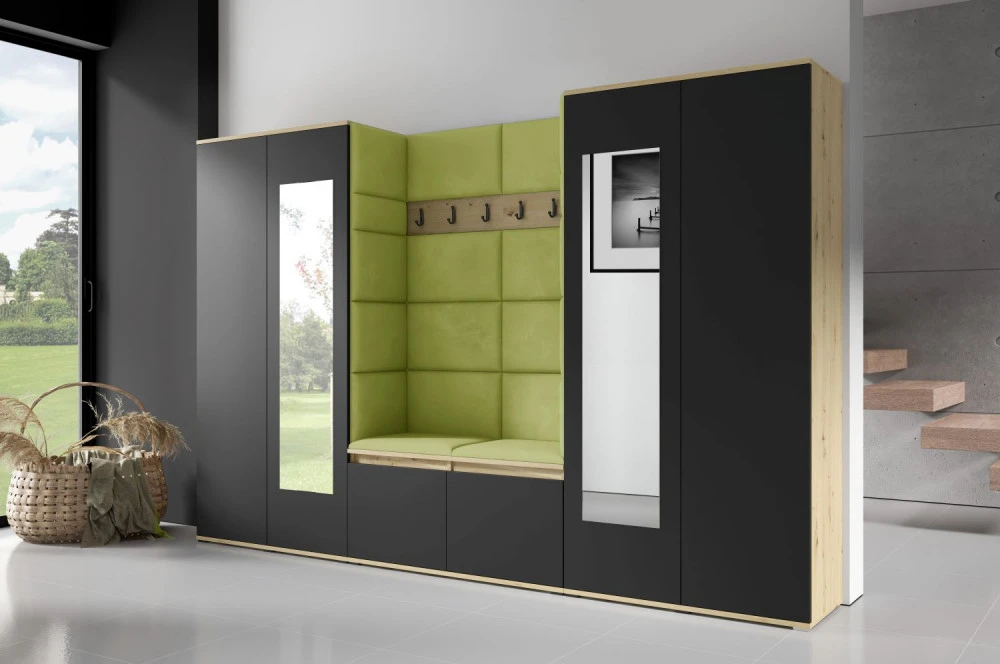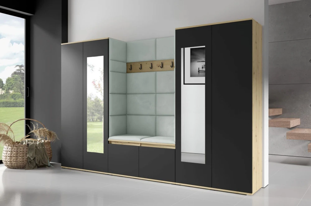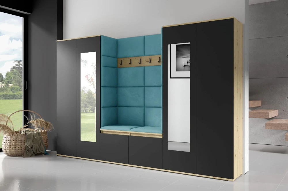 Čalouněná předsíň EMI 10 s barevnými panely je ideální volbou pro ty, kteří hledají originální a funkční řešení.Představujeme vám čalouněnou předsíň EMI, která kombinuje moderní design, praktické využití a jedinečnou estetiku. Čalouněné panely v různých barvách jsou nejen vizuálně atraktivní, ale také přinášejí pohodlí a funkčnost, díky kterým bude vaše předsíň působit útulně a stylově zároveň.Čalouněné panely EMI jsou vyrobeny z odolných materiálů, které zajišťují dlouhou životnost i snadnou údržbu. Povrchy odolné vůči nečistotám a vlhkosti jsou praktické zejména v předsíních, které jsou každodenně zatěžované. Stranu dvířek se zrcadlem si můžete zvolit na levou nebo pravou stranu.