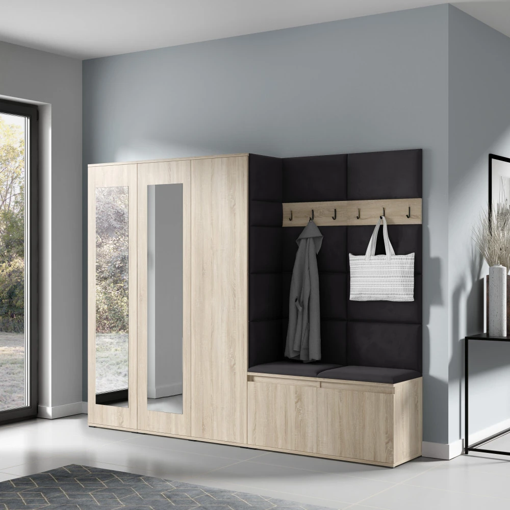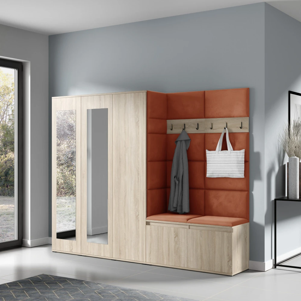 Čalouněná předsíň EMI 15 s barevnými panely je ideální volbou pro ty, kteří hledají originální a funkční řešení.Představujeme vám čalouněnou předsíň EMI, která kombinuje moderní design, praktické využití a jedinečnou estetiku. Čalouněné panely v různých barvách jsou nejen vizuálně atraktivní, ale také přinášejí pohodlí a funkčnost, díky kterým bude vaše předsíň působit útulně a stylově zároveň.Čalouněné panely EMI jsou vyrobeny z odolných materiálů, které zajišťují dlouhou životnost i snadnou údržbu. Povrchy odolné vůči nečistotám a vlhkosti jsou praktické zejména v předsíních, které jsou každodenně zatěžované. Stěnu si můžete umístit v pravo nebo v levo, taktéž si můžete sami zvolit kam dáte dvířka se zrcadlem.