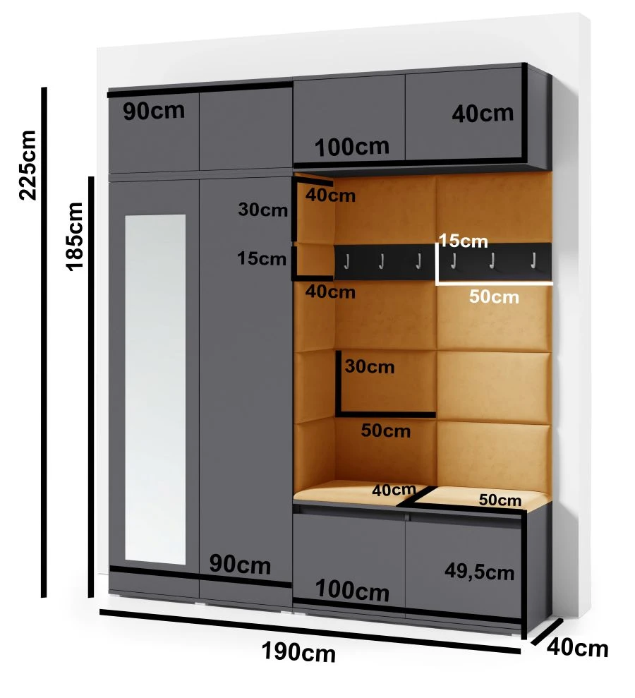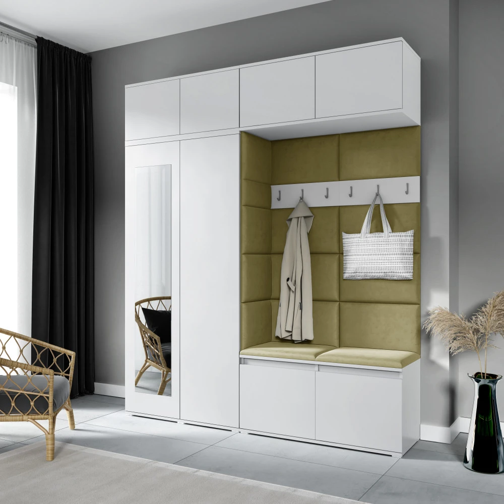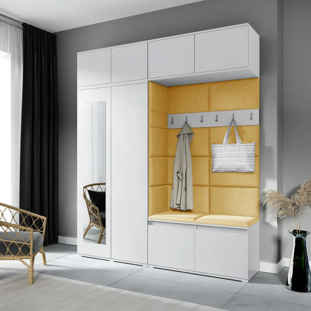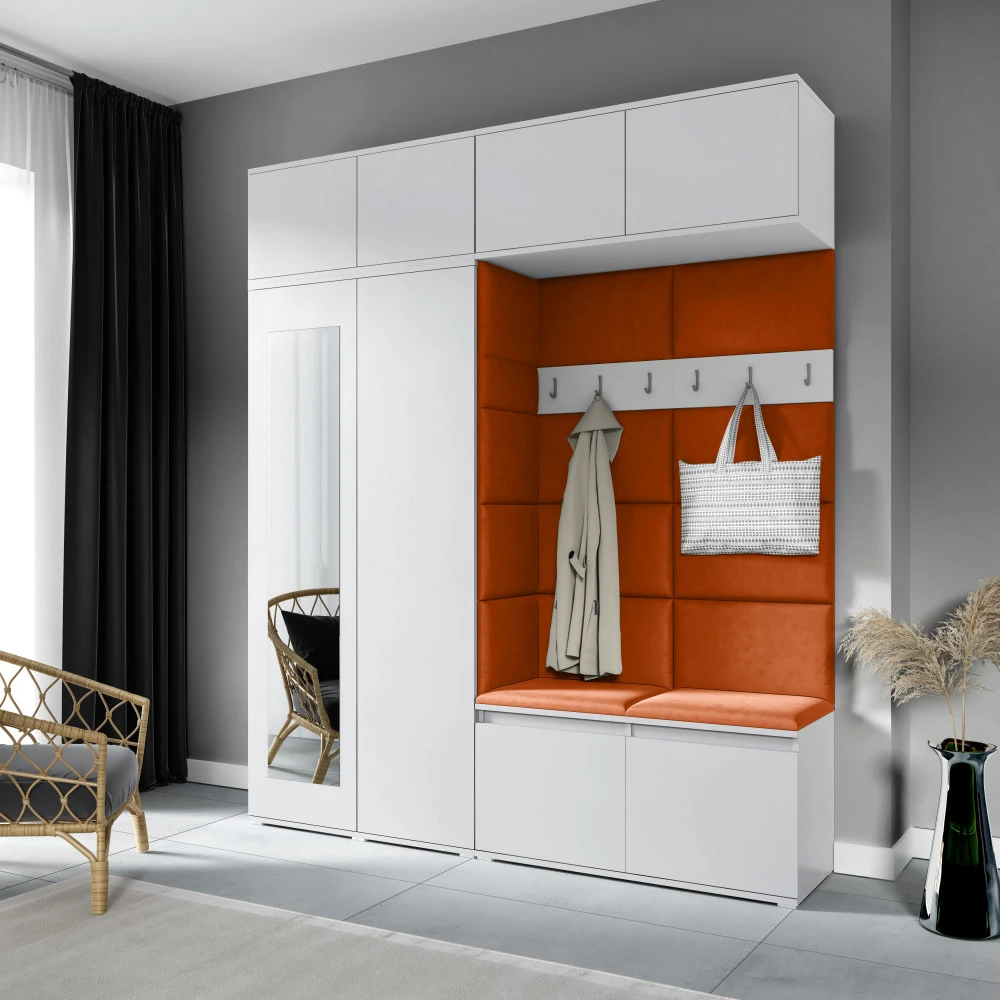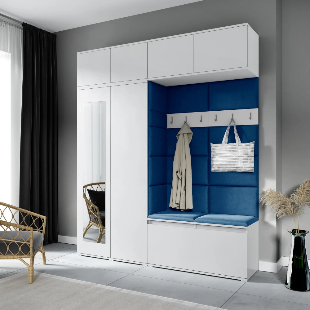 Čalouněná předsíň EMI 16 s barevnými panely je ideální volbou pro ty, kteří hledají originální a funkční řešení.Představujeme vám čalouněnou předsíň EMI, která kombinuje moderní design, praktické využití a jedinečnou estetiku. Čalouněné panely v různých barvách jsou nejen vizuálně atraktivní, ale také přinášejí pohodlí a funkčnost, díky kterým bude vaše předsíň působit útulně a stylově zároveň.Čalouněné panely EMI jsou vyrobeny z odolných materiálů, které zajišťují dlouhou životnost i snadnou údržbu. Povrchy odolné vůči nečistotám a vlhkosti jsou praktické zejména v předsíních, které jsou každodenně zatěžované. Stěnu si můžete umístit v pravo nebo v levo, taktéž si můžete sami zvolit kam dáte dvířka se zrcadlem.