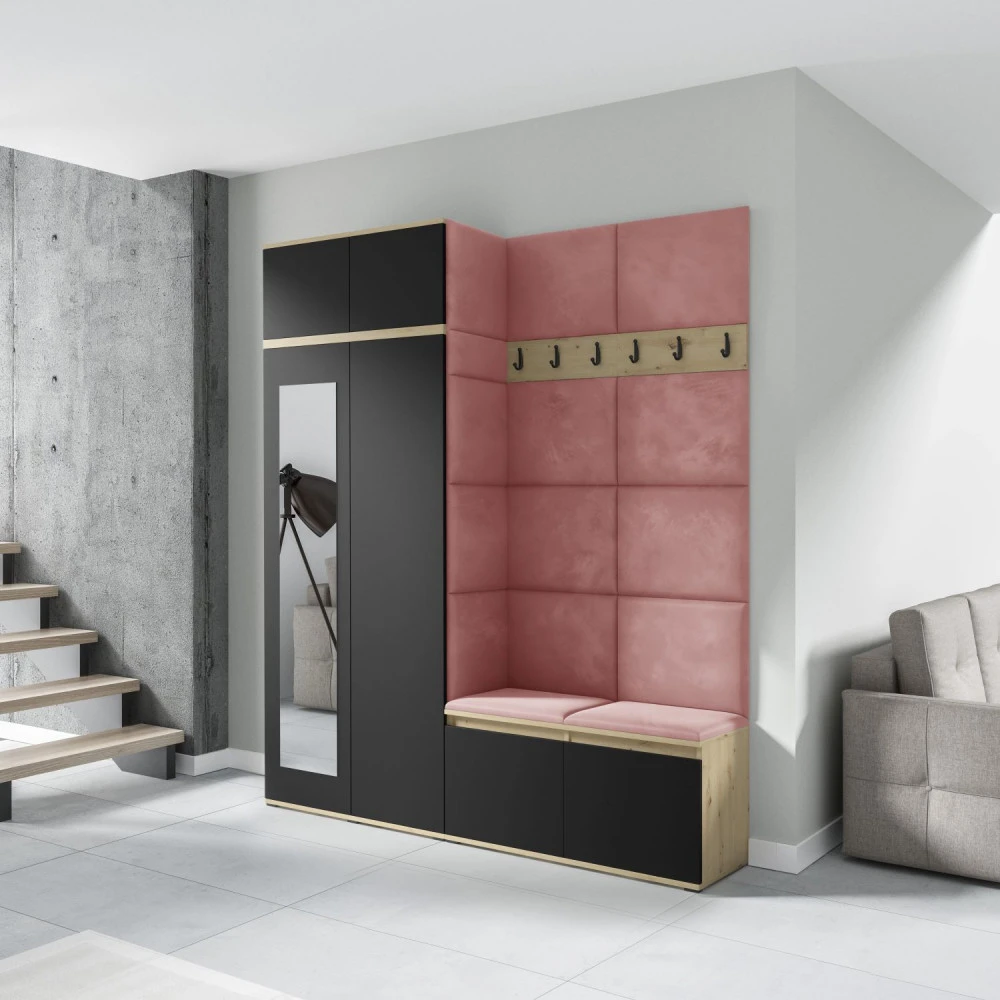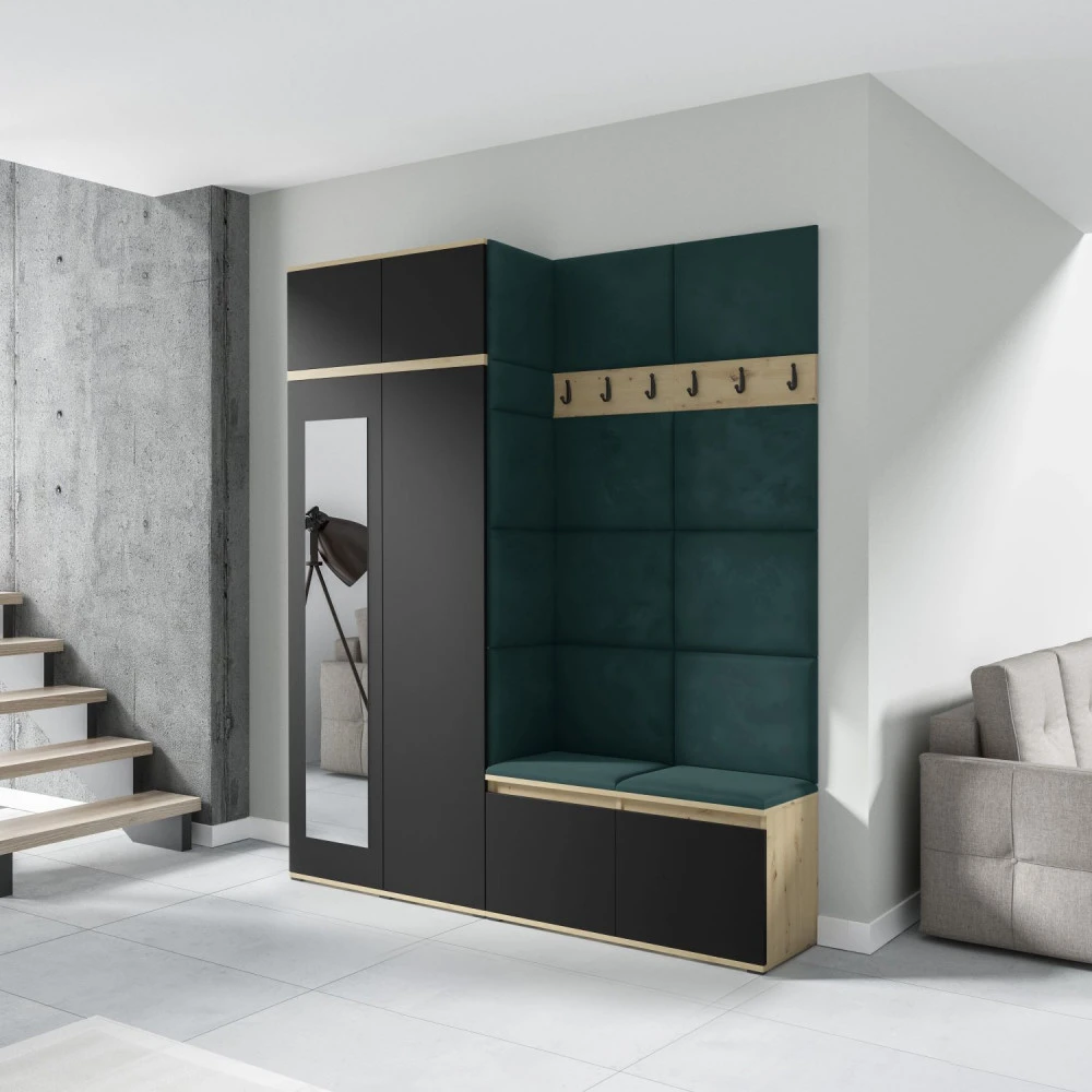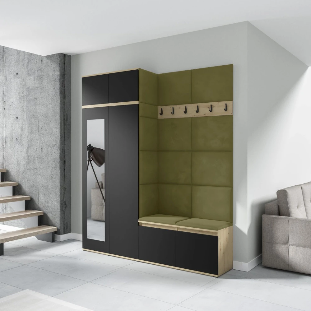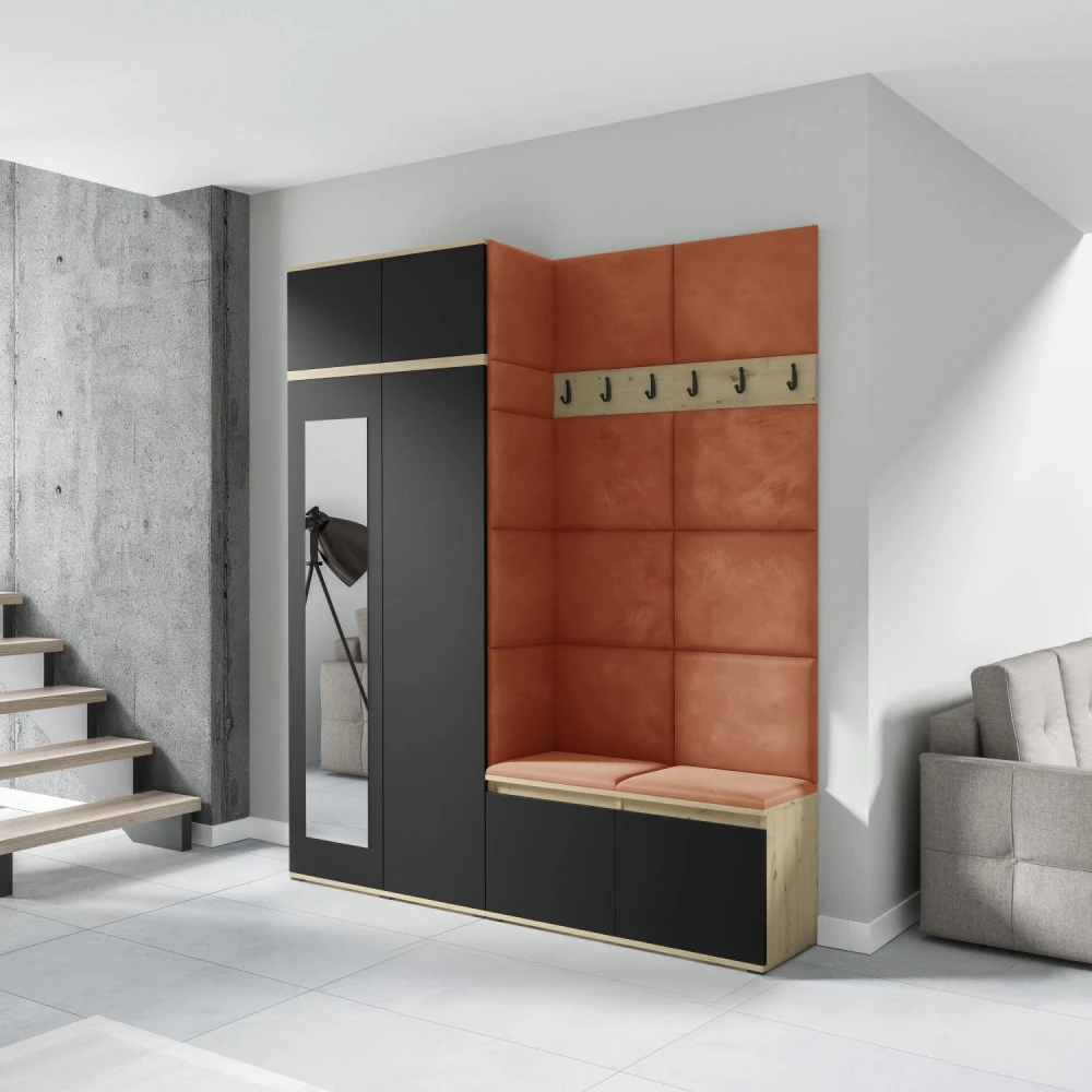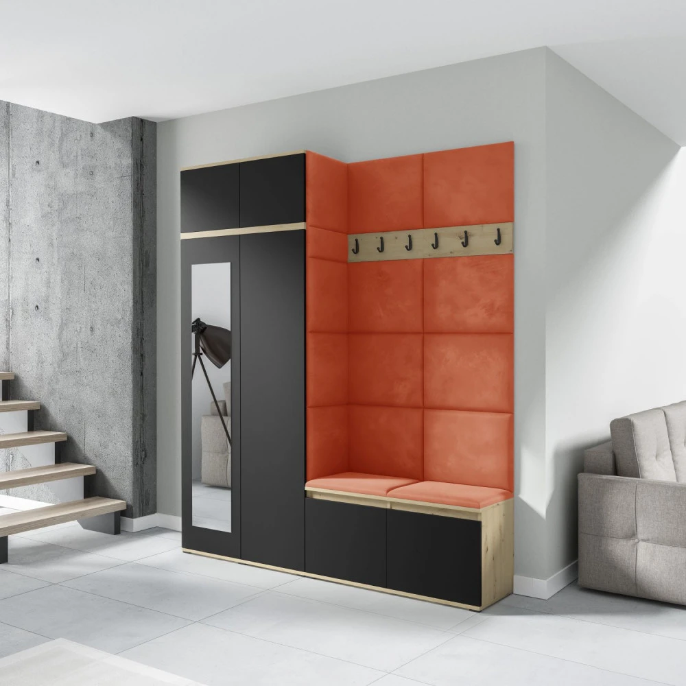 Čalouněná předsíň EMI 19 s barevnými panely je ideální volbou pro ty, kteří hledají originální a funkční řešení.Představujeme vám čalouněnou předsíň EMI, která kombinuje moderní design, praktické využití a jedinečnou estetiku. Čalouněné panely v různých barvách jsou nejen vizuálně atraktivní, ale také přinášejí pohodlí a funkčnost, díky kterým bude vaše předsíň působit útulně a stylově zároveň.Čalouněné panely EMI jsou vyrobeny z odolných materiálů, které zajišťují dlouhou životnost i snadnou údržbu. Povrchy odolné vůči nečistotám a vlhkosti jsou praktické zejména v předsíních, které jsou každodenně zatěžované. Stěnu si můžete umístit v pravo nebo v levo, taktéž si můžete sami zvolit kam dáte dvířka se zrcadlem.