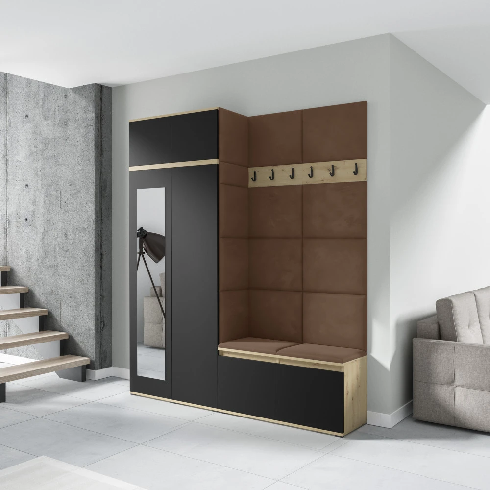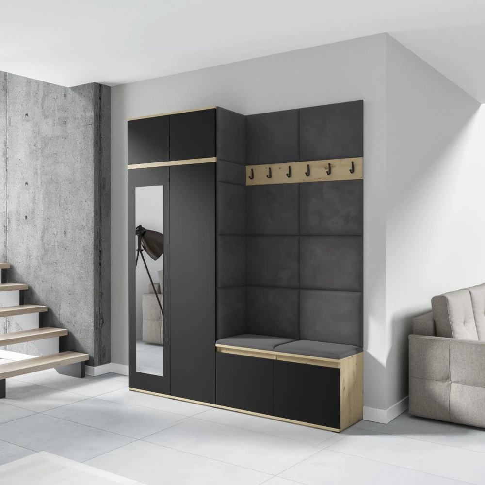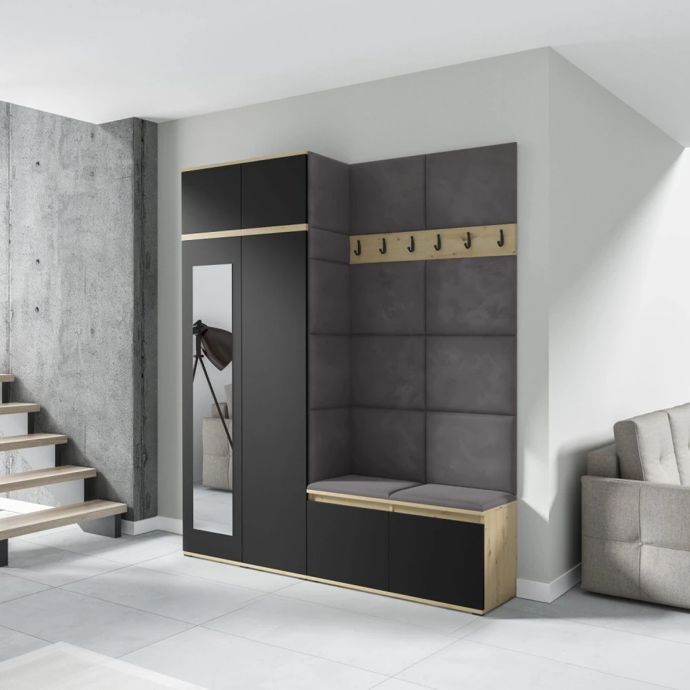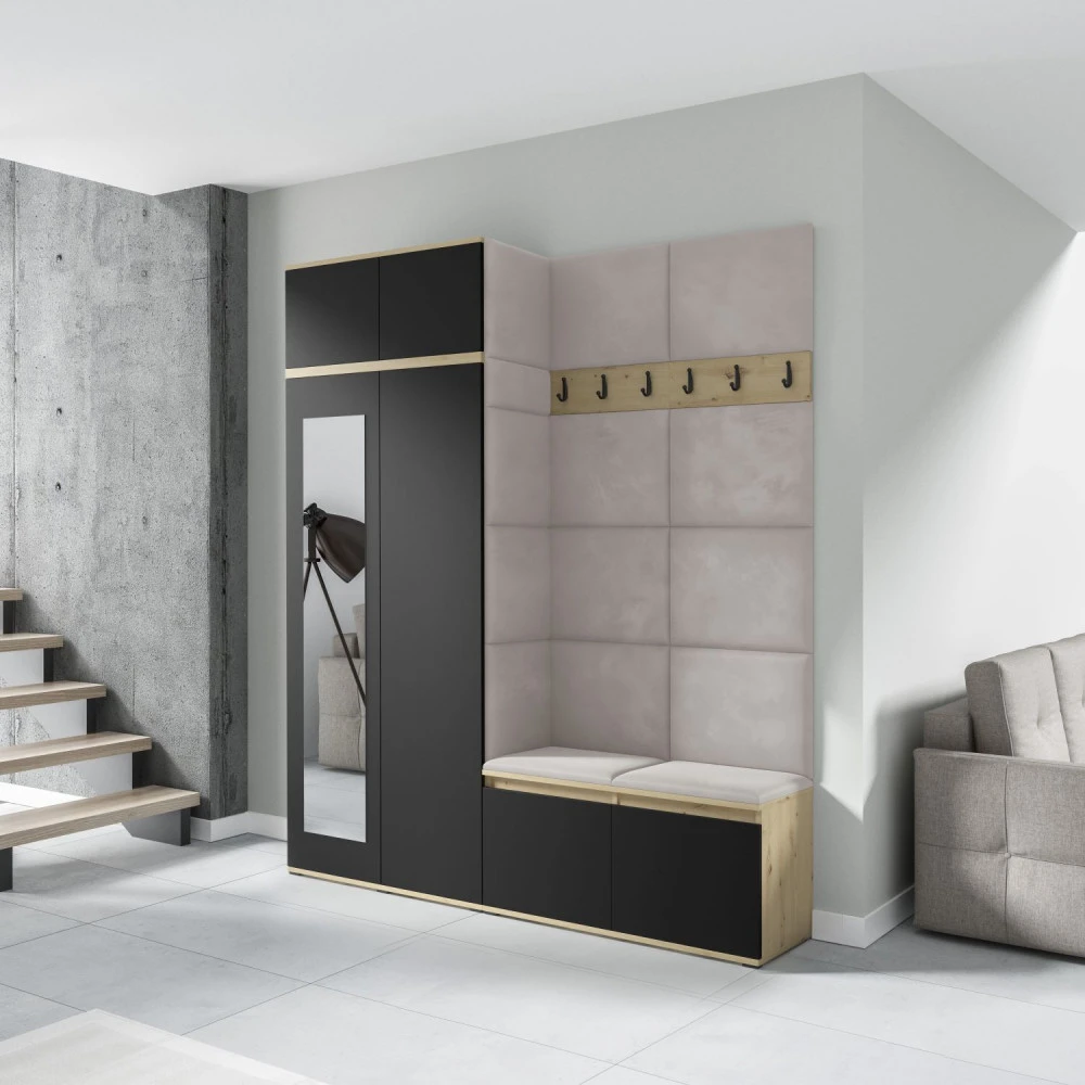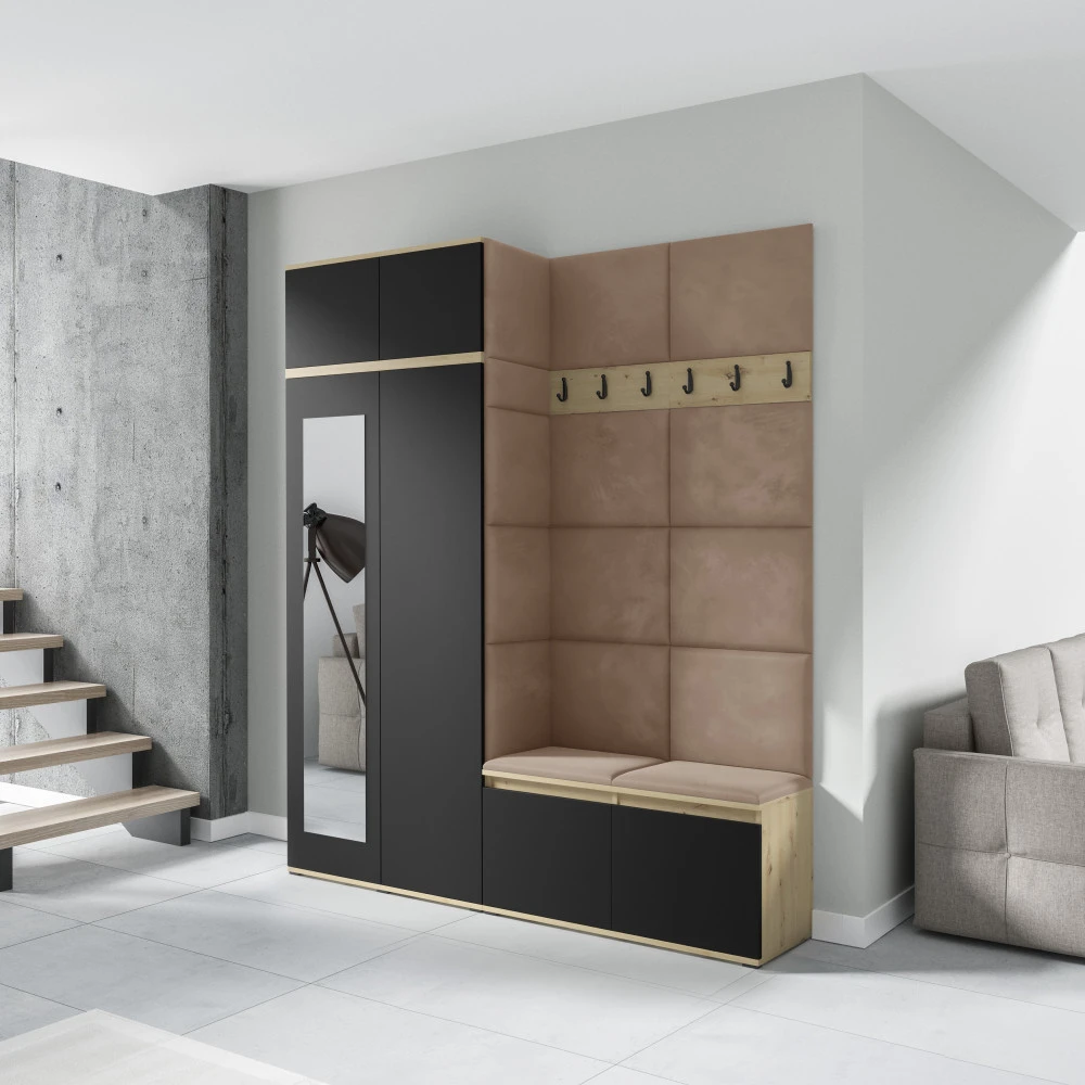 Čalouněná předsíň EMI 19 s barevnými panely je ideální volbou pro ty, kteří hledají originální a funkční řešení.Představujeme vám čalouněnou předsíň EMI, která kombinuje moderní design, praktické využití a jedinečnou estetiku. Čalouněné panely v různých barvách jsou nejen vizuálně atraktivní, ale také přinášejí pohodlí a funkčnost, díky kterým bude vaše předsíň působit útulně a stylově zároveň.Čalouněné panely EMI jsou vyrobeny z odolných materiálů, které zajišťují dlouhou životnost i snadnou údržbu. Povrchy odolné vůči nečistotám a vlhkosti jsou praktické zejména v předsíních, které jsou každodenně zatěžované. Stěnu si můžete umístit v pravo nebo v levo, taktéž si můžete sami zvolit kam dáte dvířka se zrcadlem.