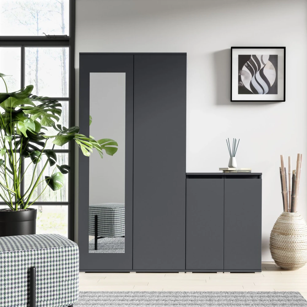 Předsíň EMI 24 je moderní a praktické řešení pro každou předsíň, které kombinuje stylový design s maximální funkčností. Tato stěna nabízí 2-dvéřovou skříň se zrcadlem, 2x komodu, které mají kombinaci úložných prostor a elegantního vzhledu, díky čemuž se stane nejen praktickým, ale i estetickým doplňkem vašeho interiéru.Stěnu si můžete umístit v pravo nebo v levo. Skříň má velké leštěné zrcadlo, které ji dodává luxusní vzhled.