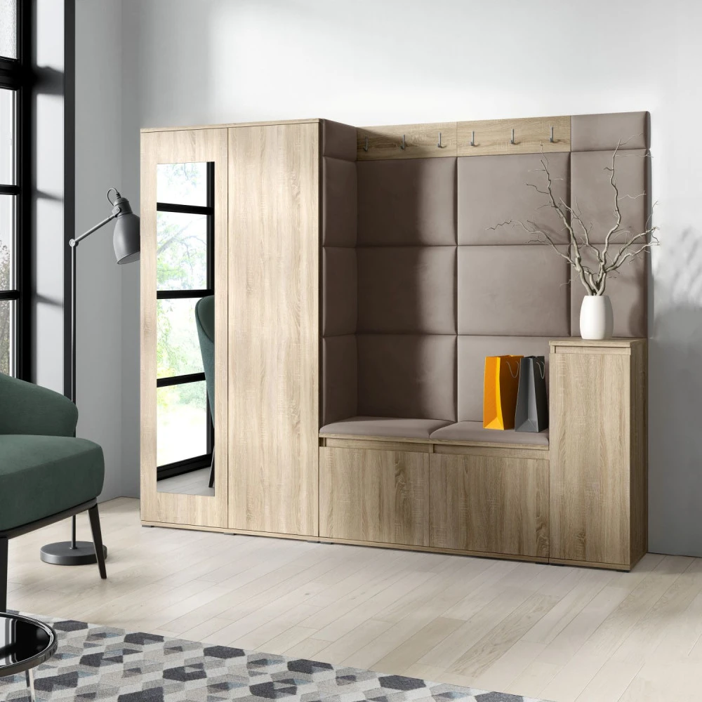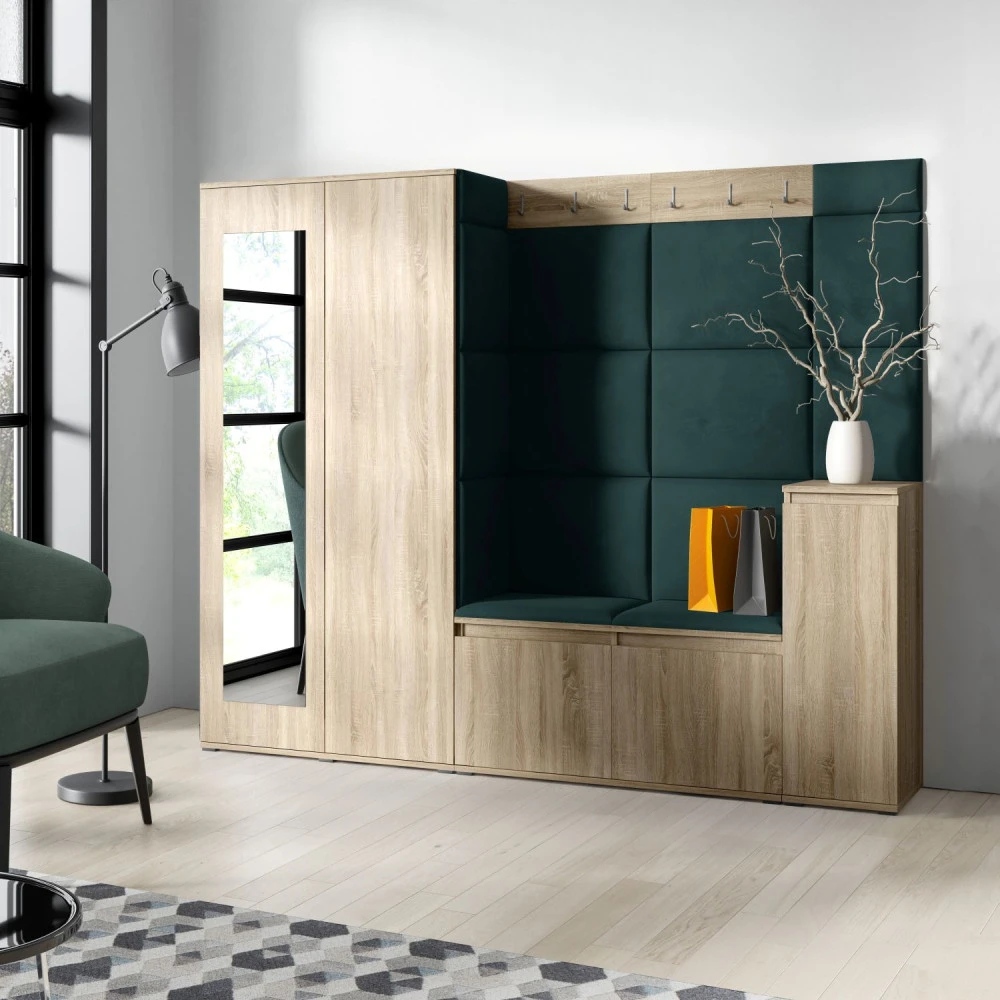 Čalouněná předsíň EMI 27 s barevnými panely je ideální volbou pro ty, kteří hledají originální a funkční řešení.Představujeme vám čalouněnou předsíň EMI, která kombinuje moderní design, praktické využití a jedinečnou estetiku. Čalouněné panely v různých barvách jsou nejen vizuálně atraktivní, ale také přinášejí pohodlí a funkčnost, díky kterým bude vaše předsíň působit útulně a stylově zároveň.Čalouněné panely EMI jsou vyrobeny z odolných materiálů, které zajišťují dlouhou životnost i snadnou údržbu. Povrchy odolné vůči nečistotám a vlhkosti jsou praktické zejména v předsíních, které jsou každodenně zatěžované. Stěnu si můžete umístit v pravo nebo v levo, taktéž si můžete sami zvolit kam dáte dvířka se zrcadlem.