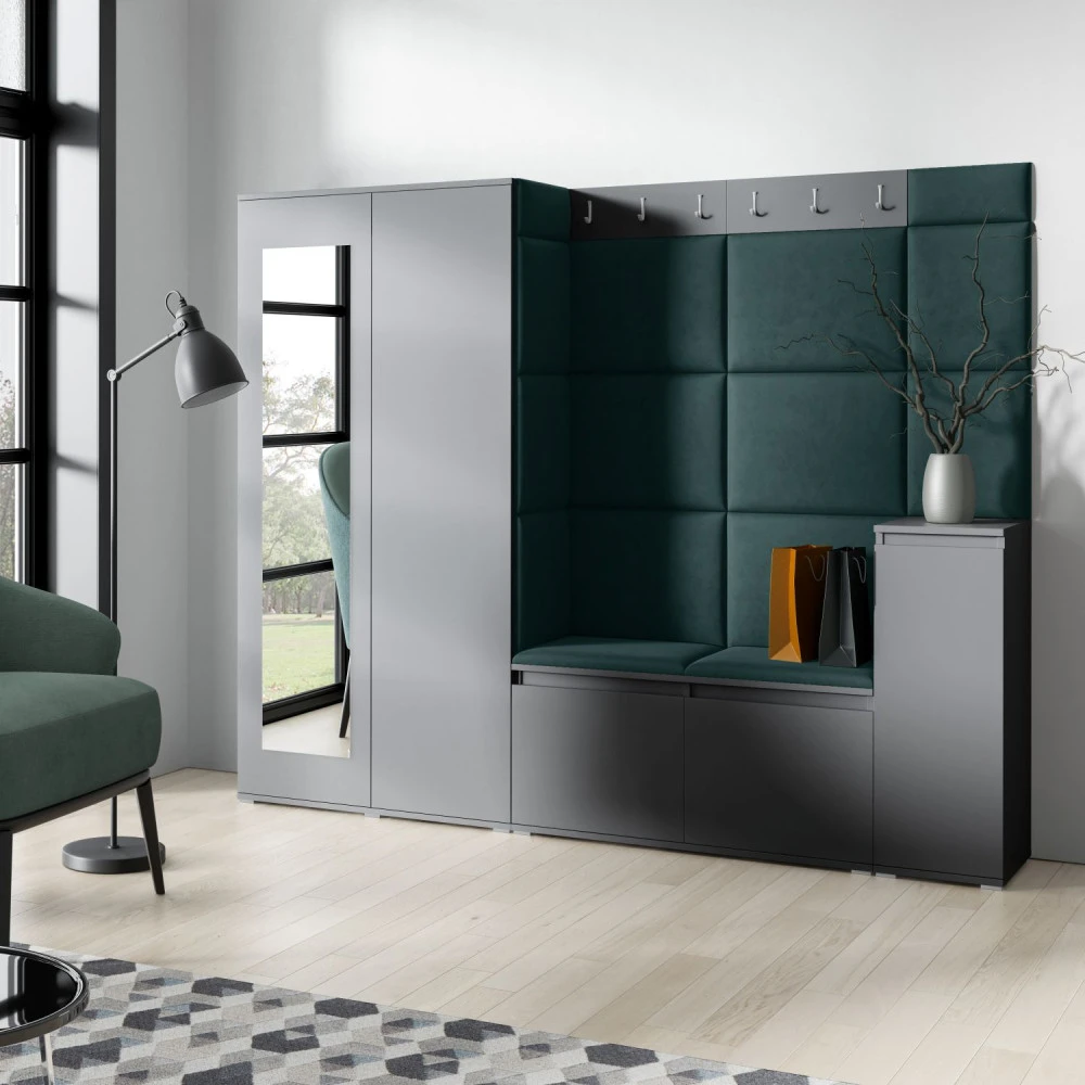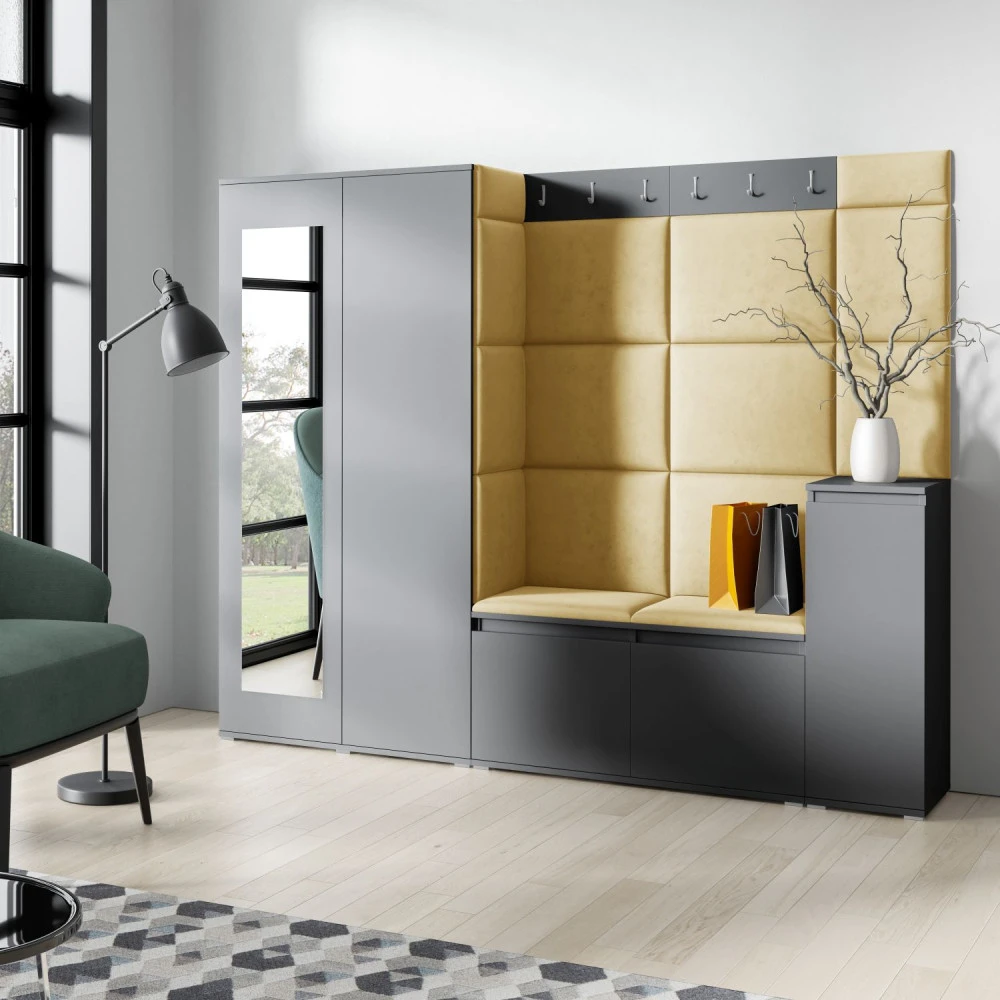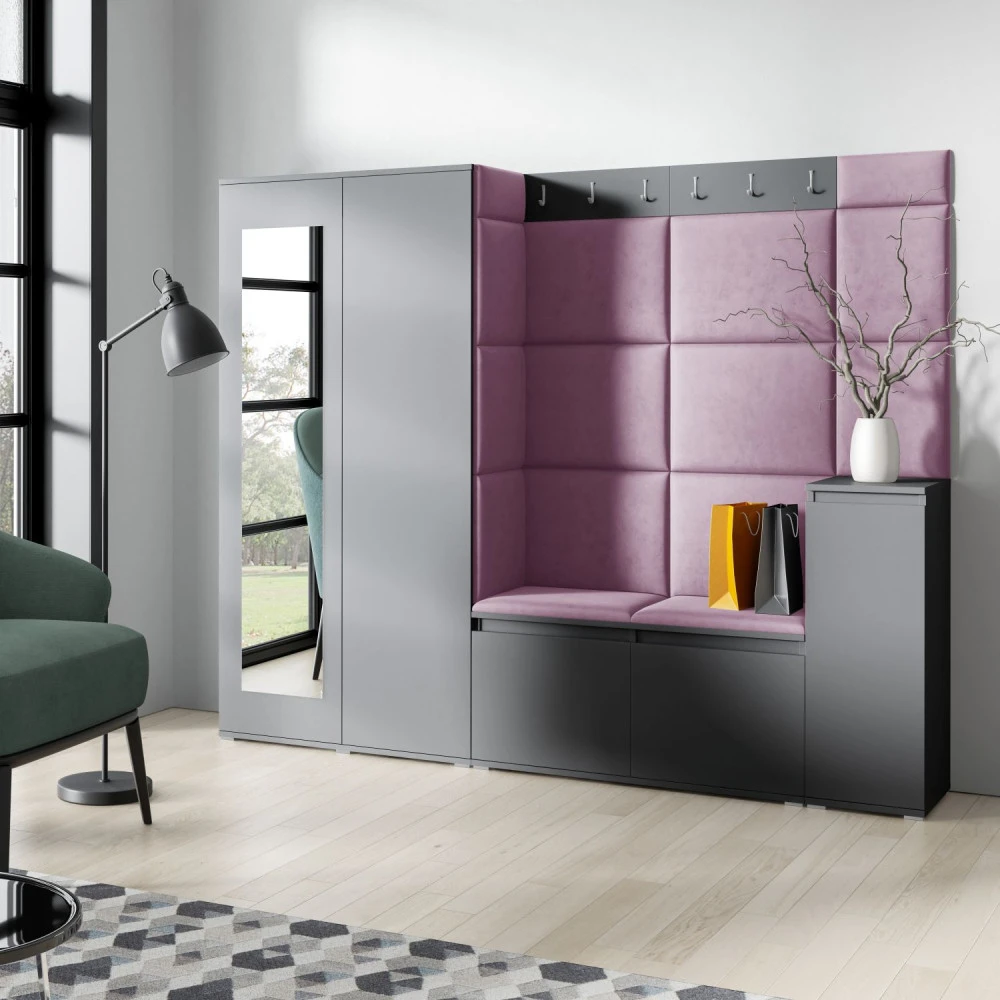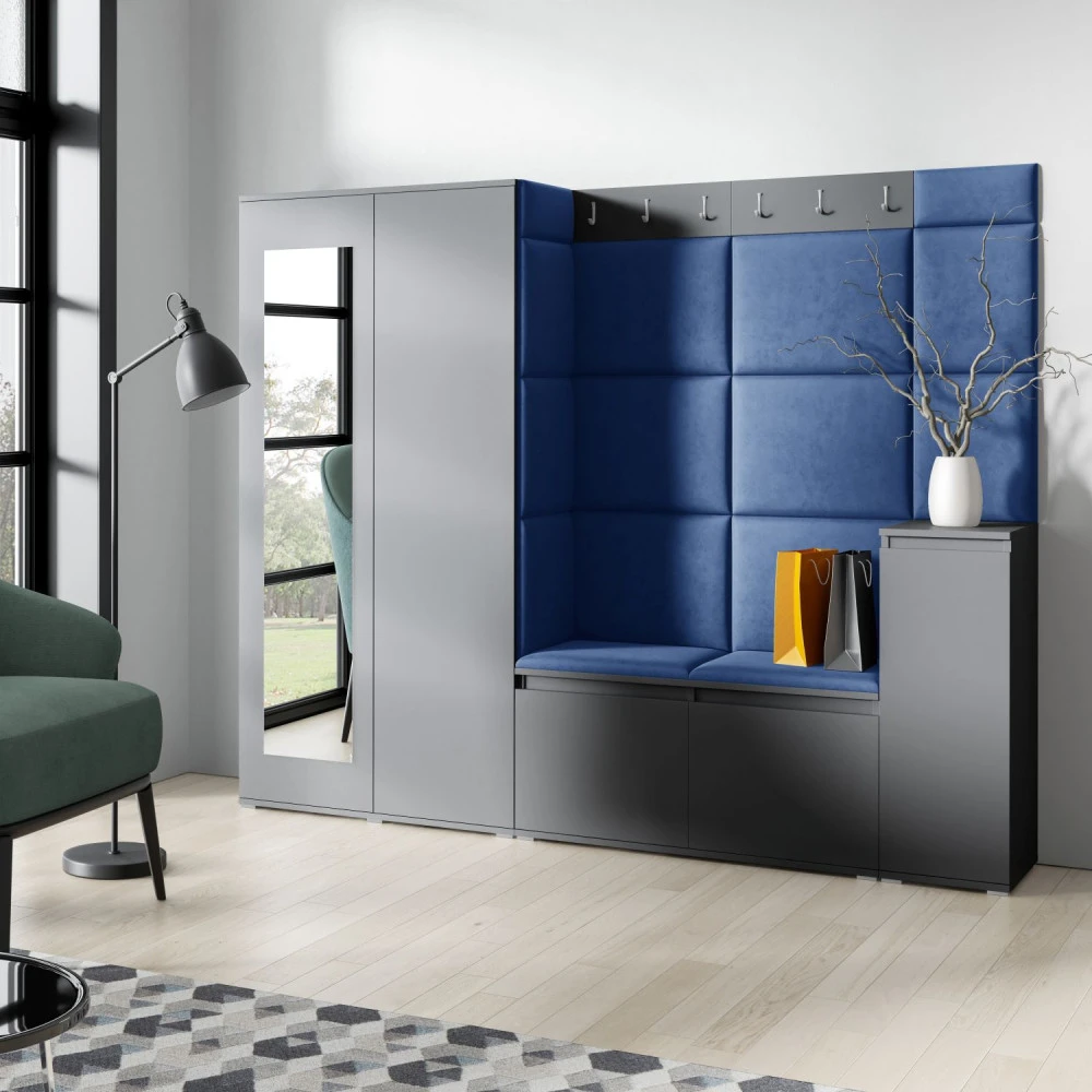 Čalouněná předsíň EMI 27 s barevnými panely je ideální volbou pro ty, kteří hledají originální a funkční řešení.Představujeme vám čalouněnou předsíň EMI, která kombinuje moderní design, praktické využití a jedinečnou estetiku. Čalouněné panely v různých barvách jsou nejen vizuálně atraktivní, ale také přinášejí pohodlí a funkčnost, díky kterým bude vaše předsíň působit útulně a stylově zároveň.Čalouněné panely EMI jsou vyrobeny z odolných materiálů, které zajišťují dlouhou životnost i snadnou údržbu. Povrchy odolné vůči nečistotám a vlhkosti jsou praktické zejména v předsíních, které jsou každodenně zatěžované. Stěnu si můžete umístit v pravo nebo v levo, taktéž si můžete sami zvolit kam dáte dvířka se zrcadlem.