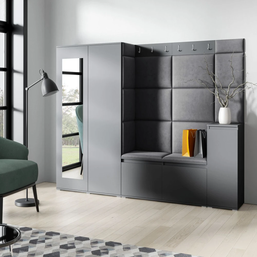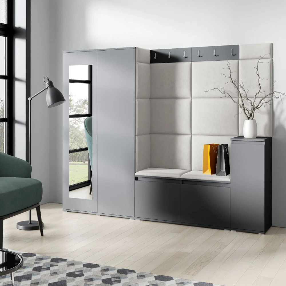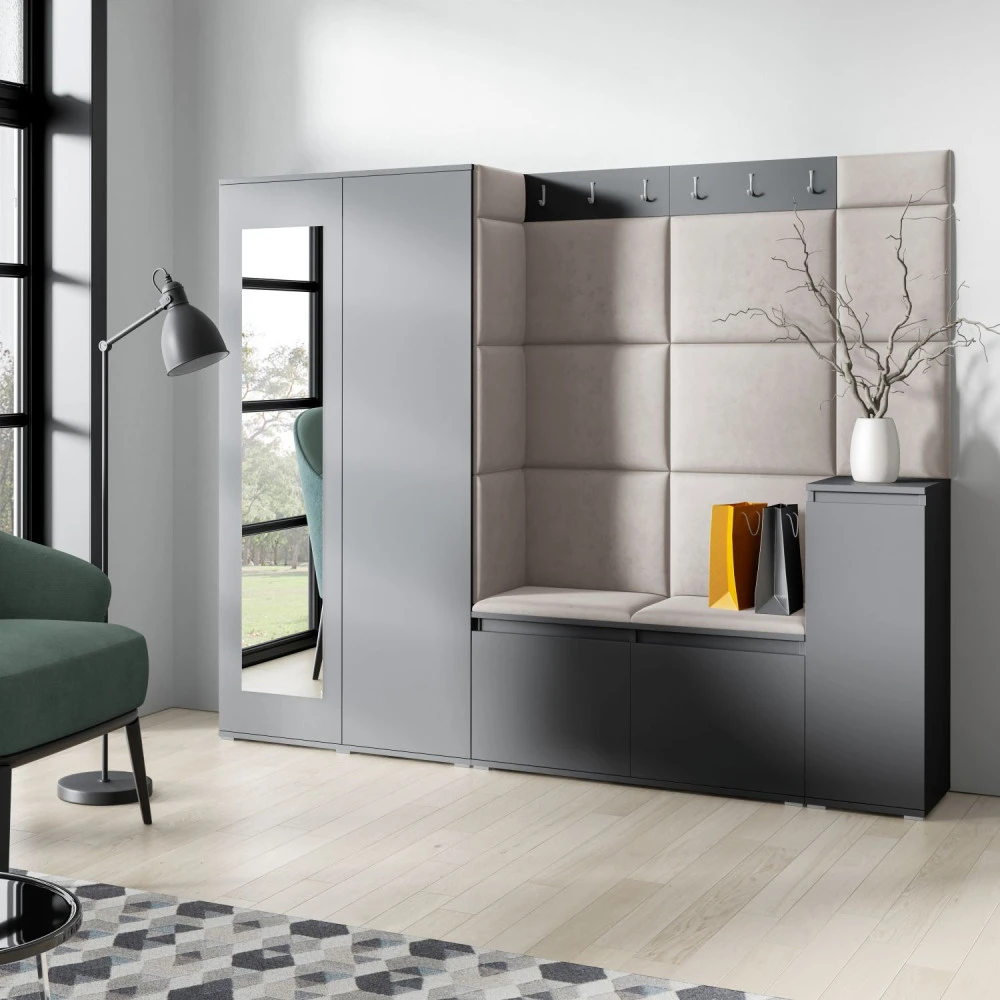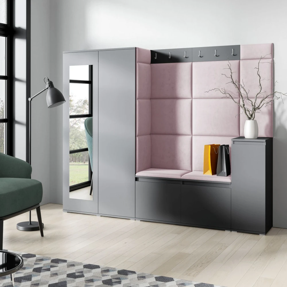 Čalouněná předsíň EMI 27 s barevnými panely je ideální volbou pro ty, kteří hledají originální a funkční řešení.Představujeme vám čalouněnou předsíň EMI, která kombinuje moderní design, praktické využití a jedinečnou estetiku. Čalouněné panely v různých barvách jsou nejen vizuálně atraktivní, ale také přinášejí pohodlí a funkčnost, díky kterým bude vaše předsíň působit útulně a stylově zároveň.Čalouněné panely EMI jsou vyrobeny z odolných materiálů, které zajišťují dlouhou životnost i snadnou údržbu. Povrchy odolné vůči nečistotám a vlhkosti jsou praktické zejména v předsíních, které jsou každodenně zatěžované. Stěnu si můžete umístit v pravo nebo v levo, taktéž si můžete sami zvolit kam dáte dvířka se zrcadlem.