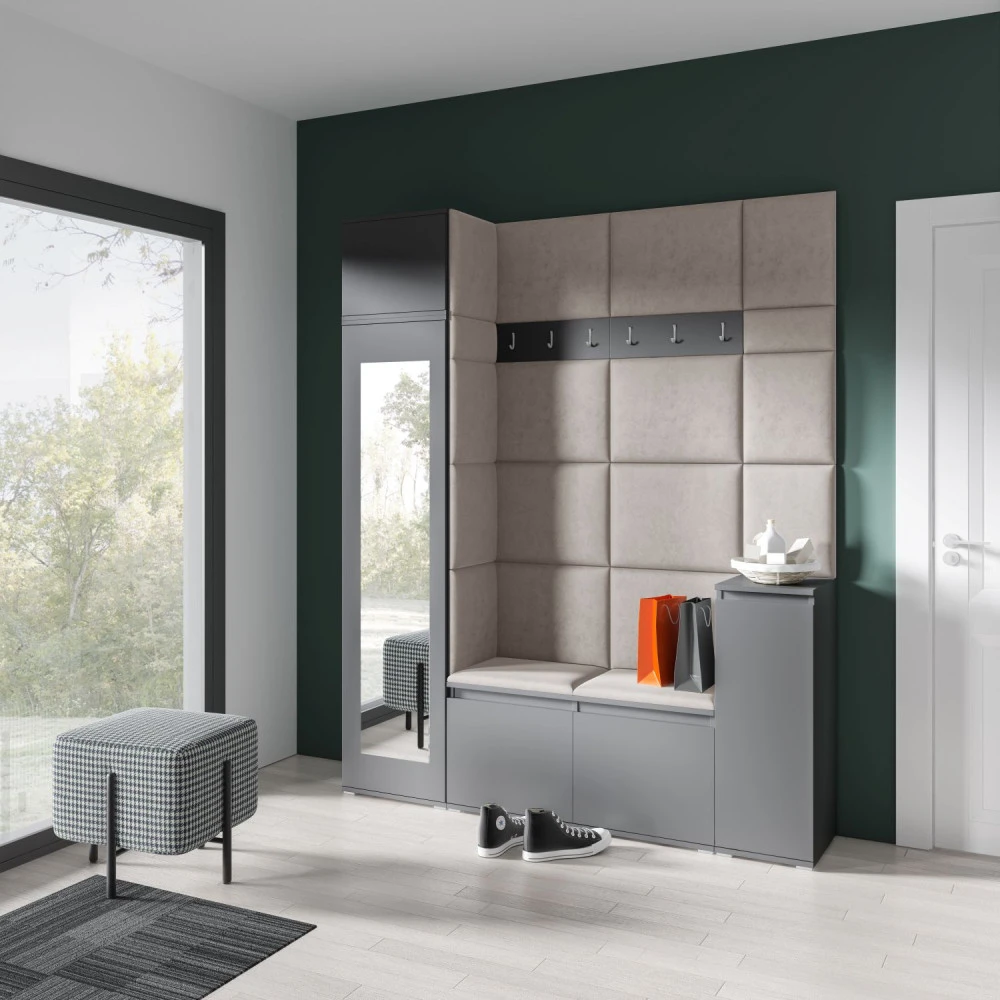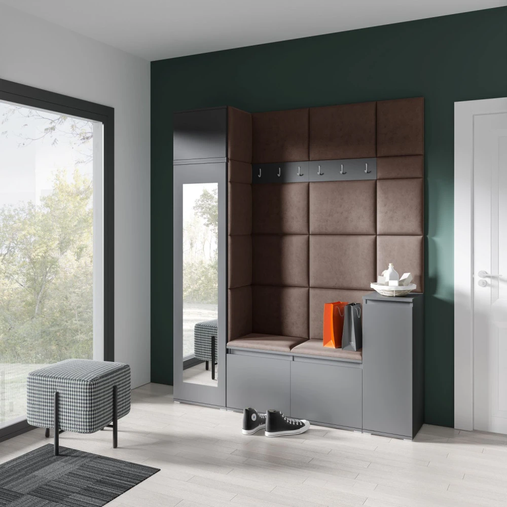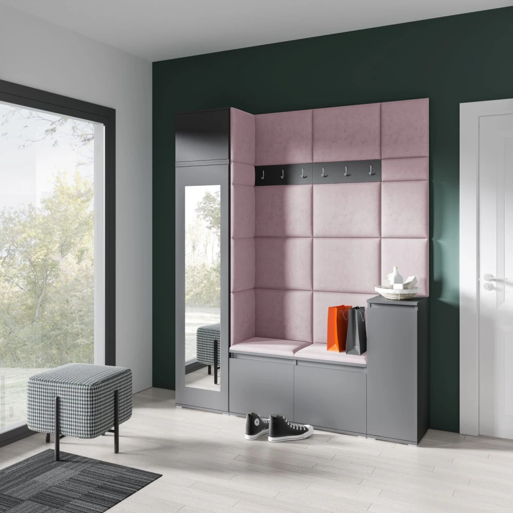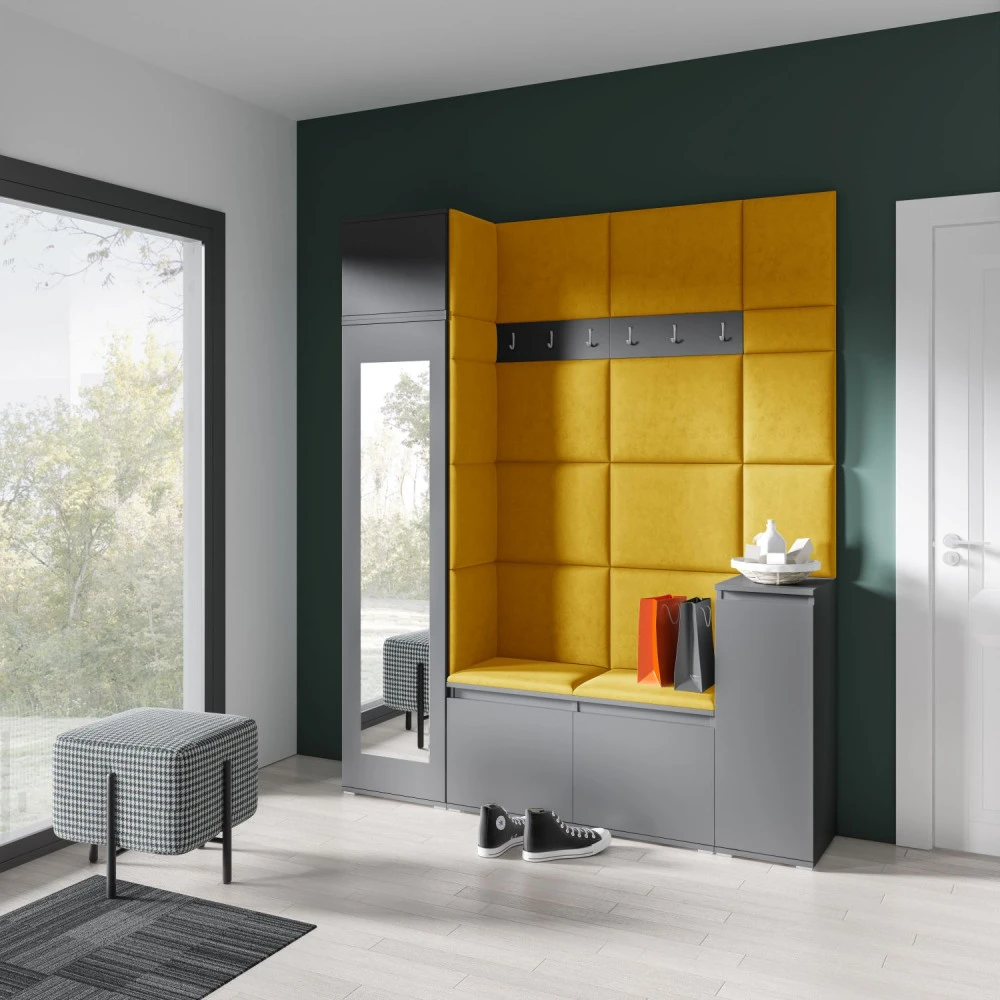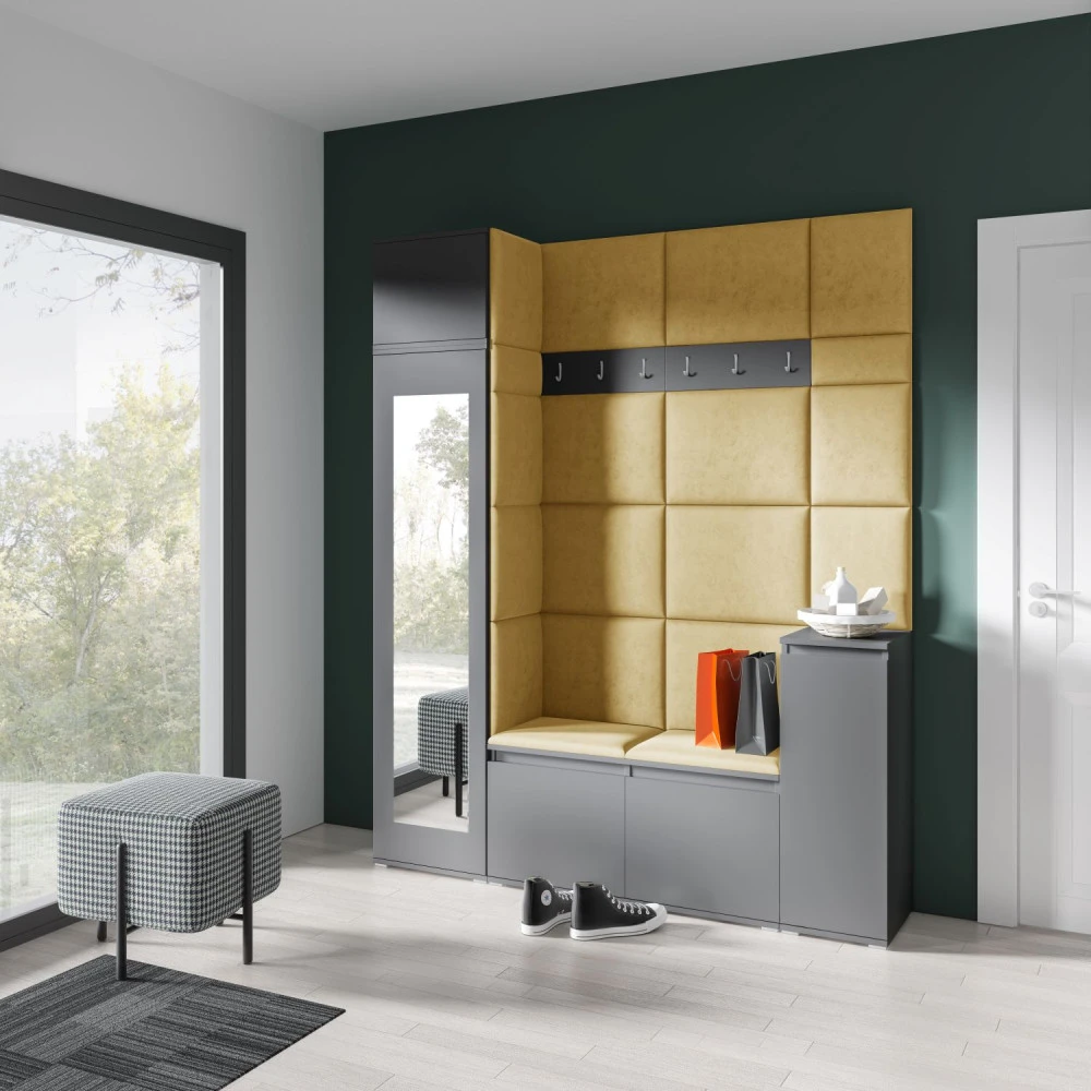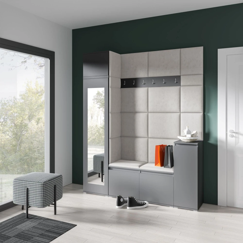 Čalouněná předsíň EMI 29 s barevnými panely je ideální volbou pro ty, kteří hledají originální a funkční řešení.Představujeme vám čalouněnou předsíň EMI, která kombinuje moderní design, praktické využití a jedinečnou estetiku. Čalouněné panely v různých barvách jsou nejen vizuálně atraktivní, ale také přinášejí pohodlí a funkčnost, díky kterým bude vaše předsíň působit útulně a stylově zároveň.Čalouněné panely EMI jsou vyrobeny z odolných materiálů, které zajišťují dlouhou životnost i snadnou údržbu. Povrchy odolné vůči nečistotám a vlhkosti jsou praktické zejména v předsíních, které jsou každodenně zatěžované. Stěnu si můžete umístit v pravo nebo v levo.
