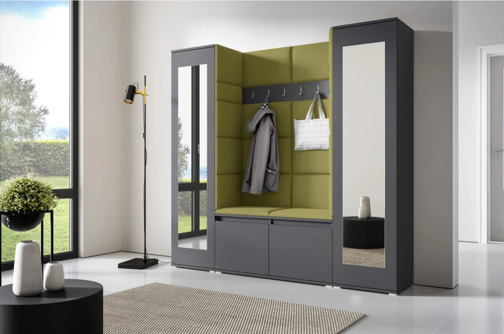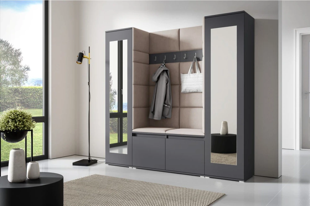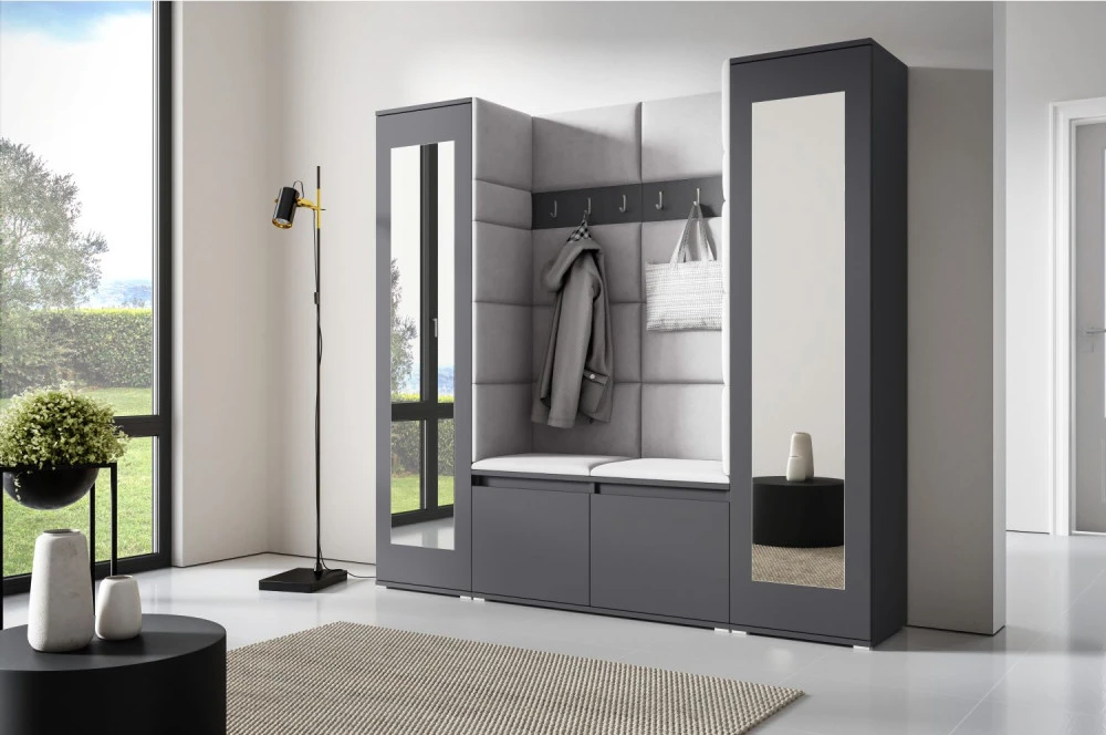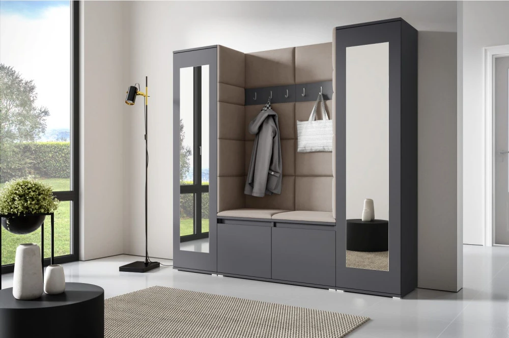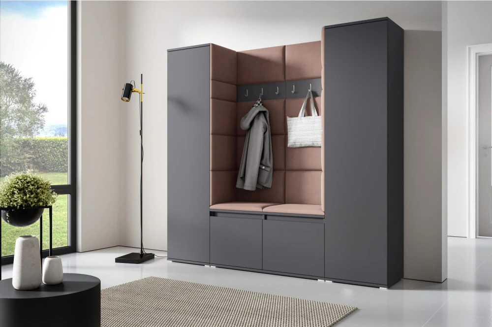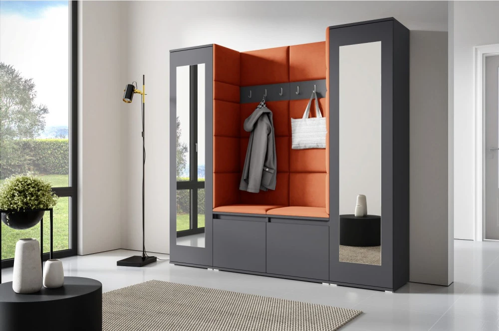 Čalouněná předsíň EMI 31 s barevnými panely je ideální volbou pro ty, kteří hledají originální a funkční řešení.Představujeme vám čalouněnou předsíň EMI, která kombinuje moderní design, praktické využití a jedinečnou estetiku. Čalouněné panely v různých barvách jsou nejen vizuálně atraktivní, ale také přinášejí pohodlí a funkčnost, díky kterým bude vaše předsíň působit útulně a stylově zároveň.Čalouněné panely EMI jsou vyrobeny z odolných materiálů, které zajišťují dlouhou životnost i snadnou údržbu. Povrchy odolné vůči nečistotám a vlhkosti jsou praktické zejména v předsíních, které jsou každodenně zatěžované. Šatní skříně jsou k dispozici se zrcadly nebo bez nich.