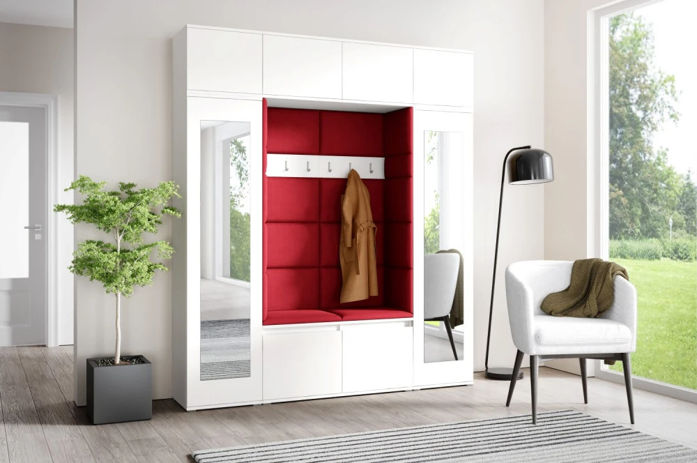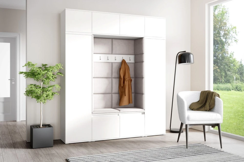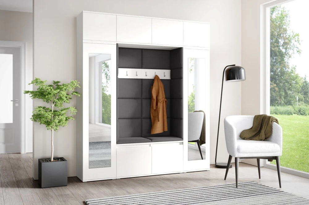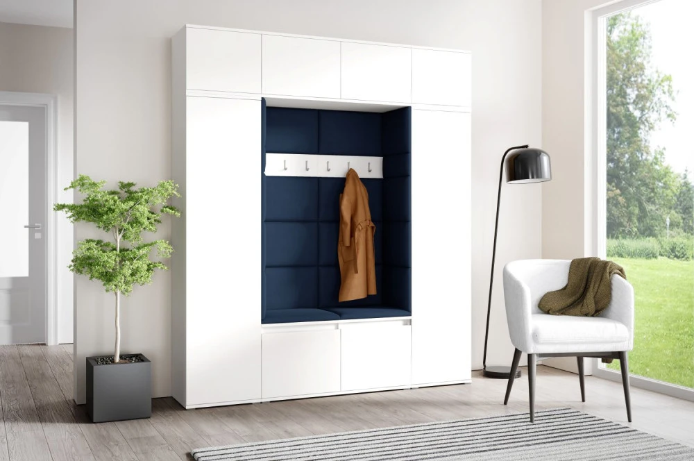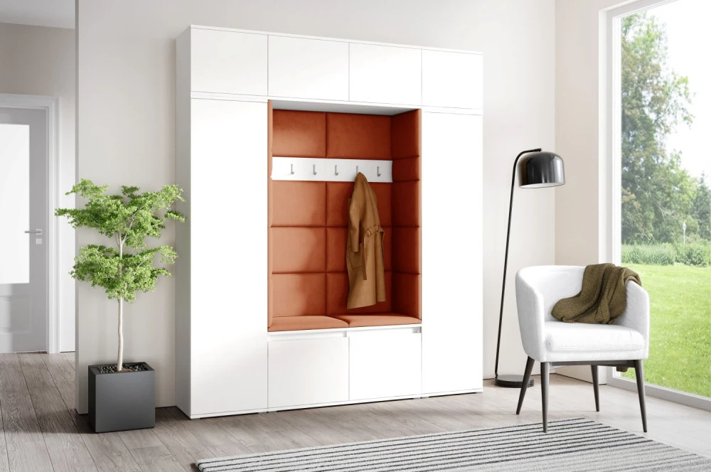 Čalouněná předsíň EMI 32 s barevnými panely je ideální volbou pro ty, kteří hledají originální a funkční řešení.Představujeme vám čalouněnou předsíň EMI, která kombinuje moderní design, praktické využití a jedinečnou estetiku. Moderní předsíňová sestava zahrnuje dvě šatní skříně, nástavce, praktický botník s věšáky a závěsnou skříňku ideální pro drobné uložení věcí. Díky svému promyšlenému designu poskytuje dostatek úložného prostoru, aniž by zabírala příliš místa. Elegantní provedení a kvalitní materiály zaručují nejen funkčnost, ale také estetický doplněk do každého interiéru. Skvěle se hodí do menších i větších předsíní a usnadní vám organizaci každodenních nezbytností.Čalouněné panely v různých barvách jsou nejen vizuálně atraktivní, ale také přinášejí pohodlí a funkčnost, díky kterým bude vaše předsíň působit útulně a stylově zároveň.Čalouněné panely EMI jsou vyrobeny z odolných materiálů, které zajišťují dlouhou životnost i snadnou údržbu. Povrchy odolné vůči nečistotám a vlhkosti jsou praktické zejména v předsíních, které jsou každodenně zatěžované. Šatní skříně jsou k dispozici se zrcadly nebo bez nich.