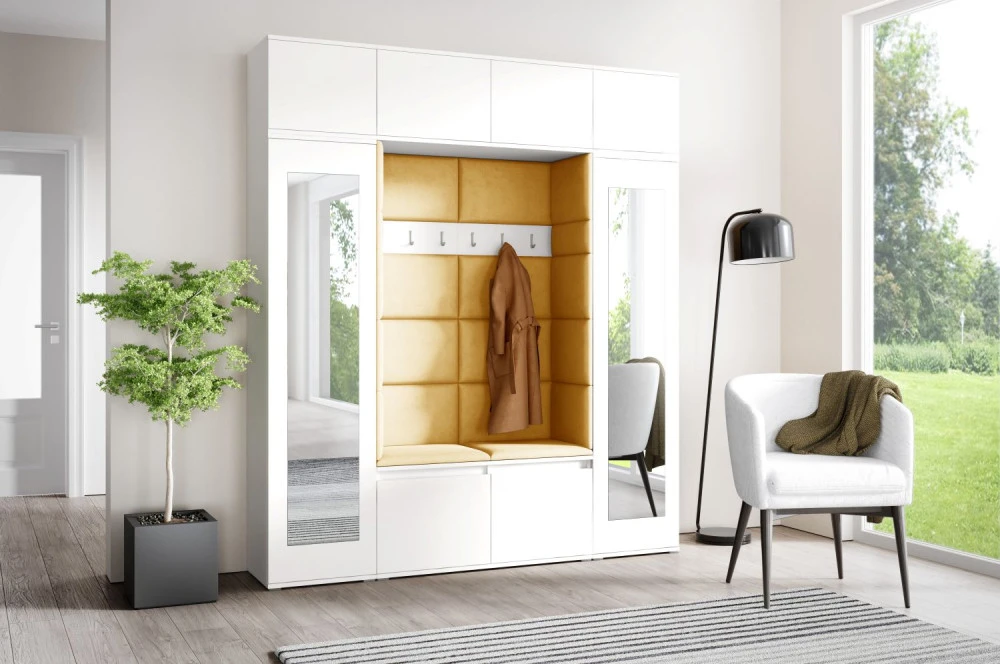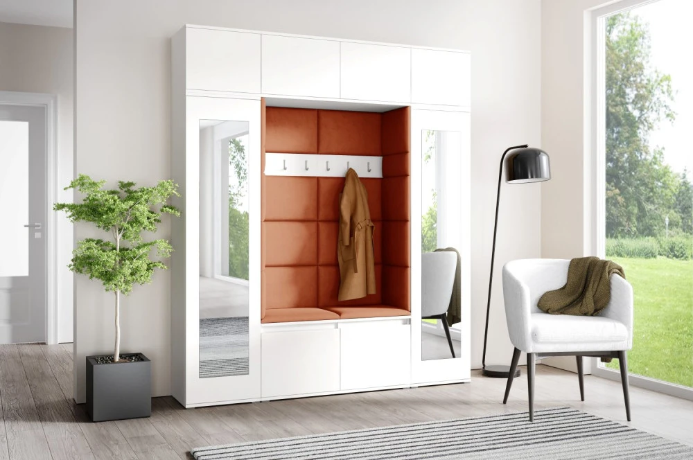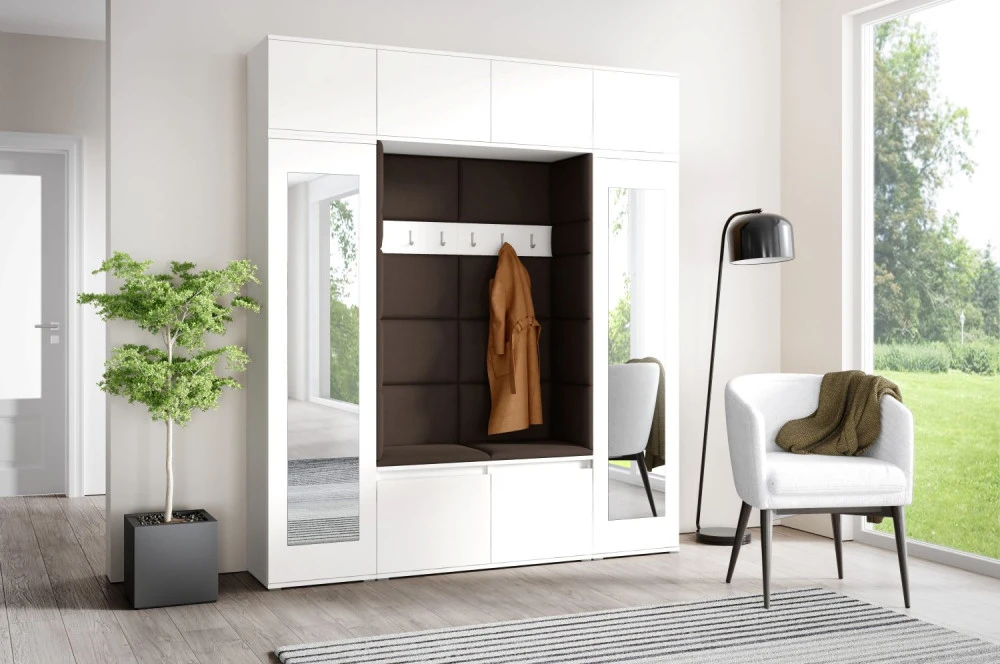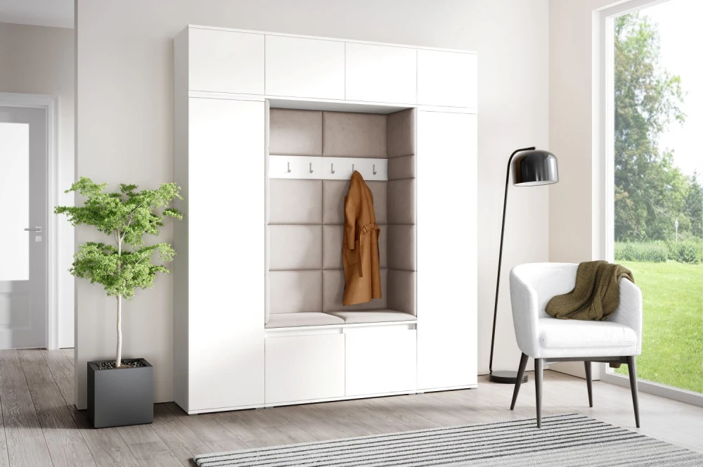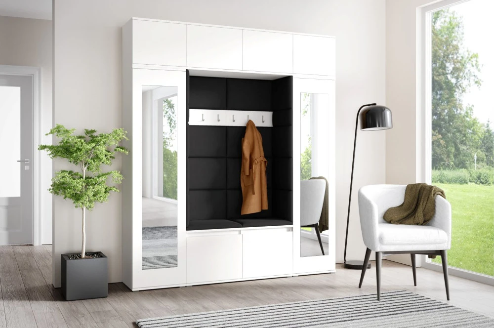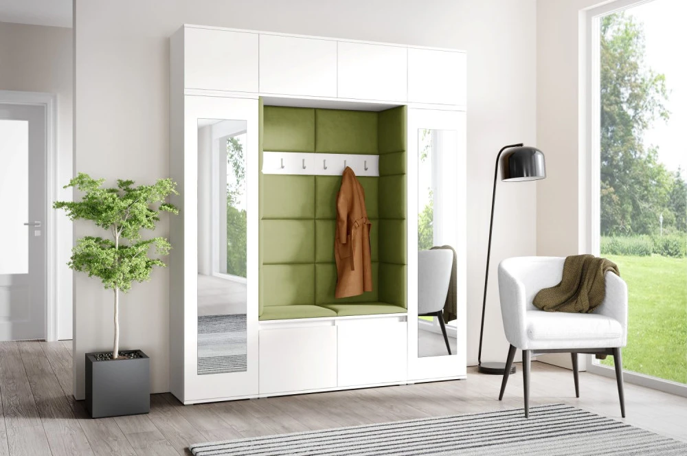 Čalouněná předsíň EMI 32 s barevnými panely je ideální volbou pro ty, kteří hledají originální a funkční řešení.Představujeme vám čalouněnou předsíň EMI, která kombinuje moderní design, praktické využití a jedinečnou estetiku. Moderní předsíňová sestava zahrnuje dvě šatní skříně, nástavce, praktický botník s věšáky a závěsnou skříňku ideální pro drobné uložení věcí. Díky svému promyšlenému designu poskytuje dostatek úložného prostoru, aniž by zabírala příliš místa. Elegantní provedení a kvalitní materiály zaručují nejen funkčnost, ale také estetický doplněk do každého interiéru. Skvěle se hodí do menších i větších předsíní a usnadní vám organizaci každodenních nezbytností.Čalouněné panely v různých barvách jsou nejen vizuálně atraktivní, ale také přinášejí pohodlí a funkčnost, díky kterým bude vaše předsíň působit útulně a stylově zároveň.Čalouněné panely EMI jsou vyrobeny z odolných materiálů, které zajišťují dlouhou životnost i snadnou údržbu. Povrchy odolné vůči nečistotám a vlhkosti jsou praktické zejména v předsíních, které jsou každodenně zatěžované. Šatní skříně jsou k dispozici se zrcadly nebo bez nich.