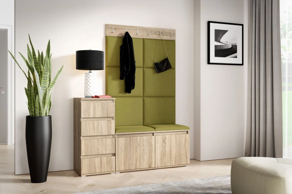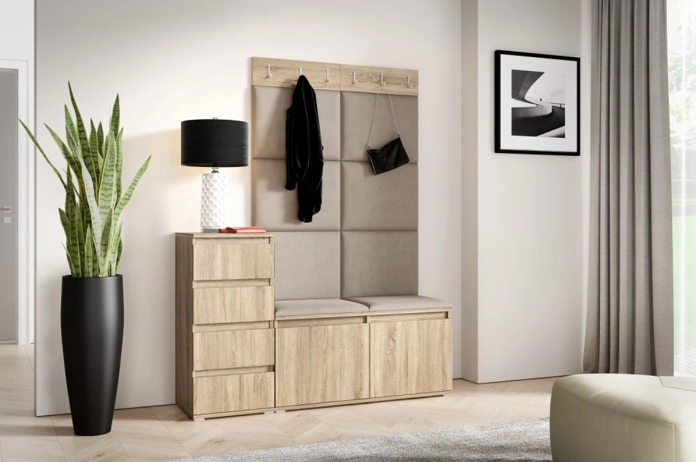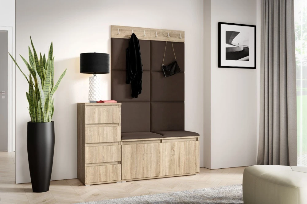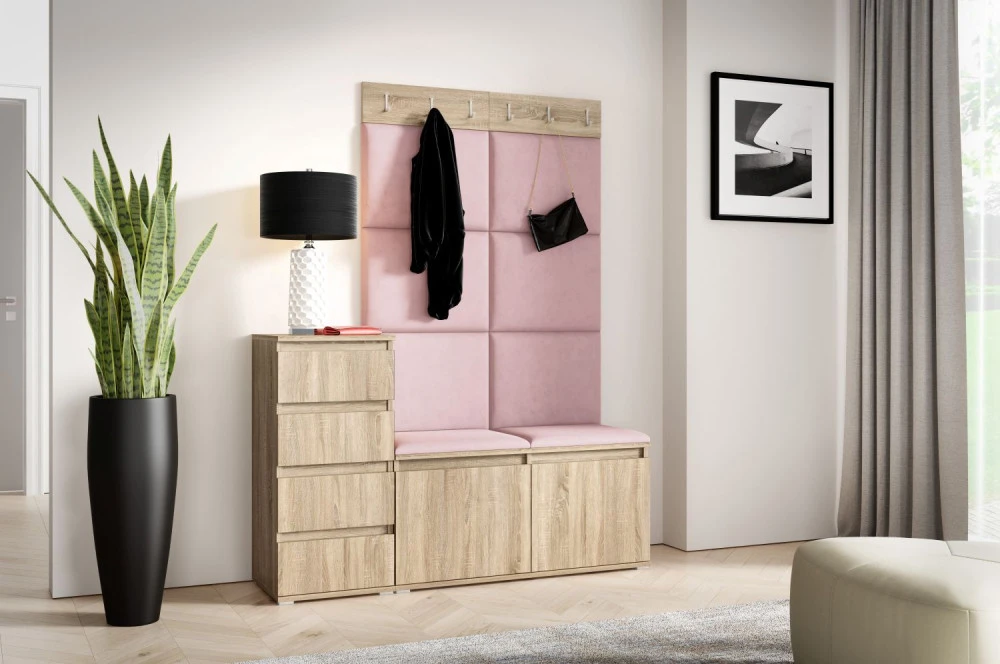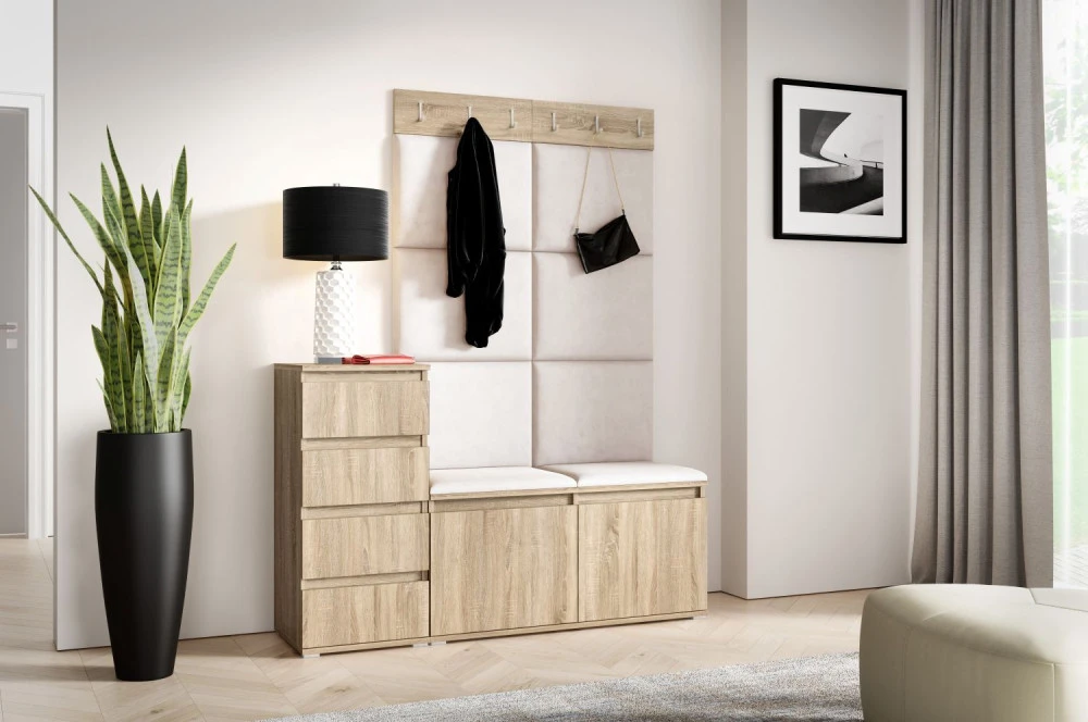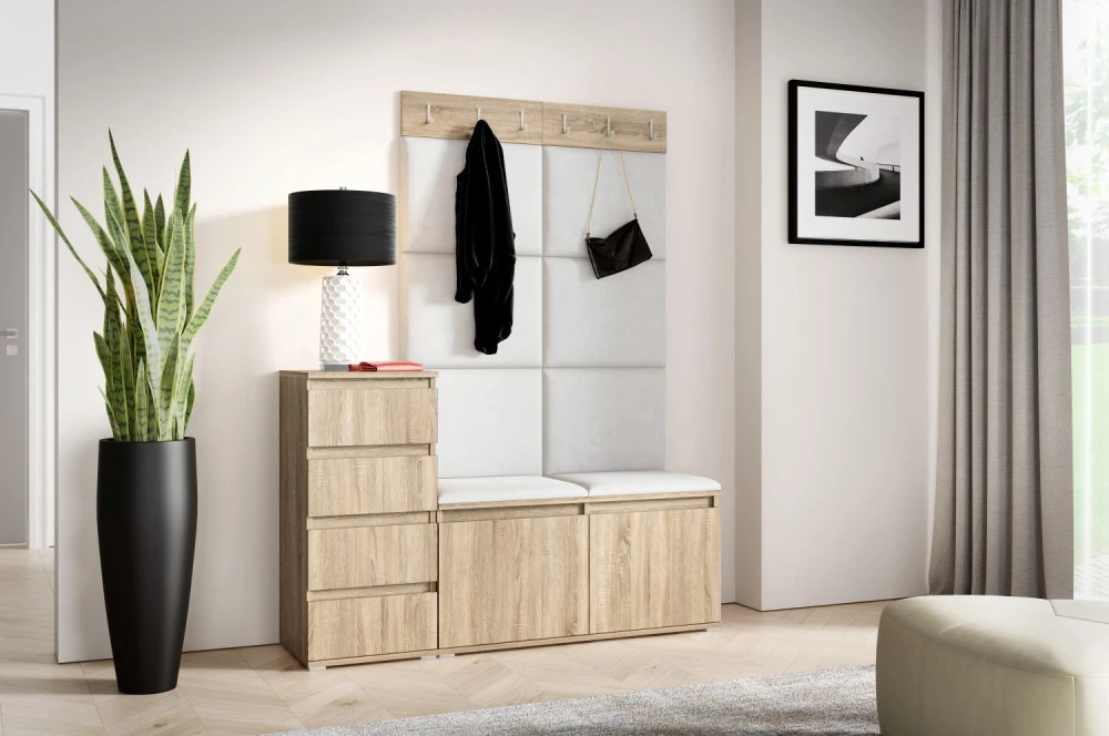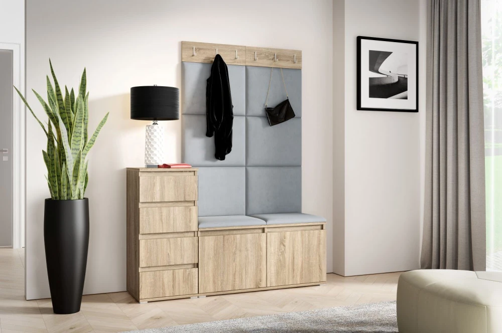 Čalouněná předsíň EMI 34 s barevnými panely je ideální volbou pro ty, kteří hledají originální a funkční řešení.Představujeme vám čalouněnou předsíň EMI, která kombinuje moderní design, praktické využití a jedinečnou estetiku. Moderní předsíňová sestava zahrnuje komodu se čtyřmi zásuvkami a botník s věšákem.Čalouněné panely v různých barvách jsou nejen vizuálně atraktivní, ale také přinášejí pohodlí a funkčnost, díky kterým bude vaše předsíň působit útulně a stylově zároveň.Čalouněné panely EMI jsou vyrobeny z odolných materiálů, které zajišťují dlouhou životnost i snadnou údržbu. Povrchy odolné vůči nečistotám a vlhkosti jsou praktické zejména v předsíních, které jsou každodenně zatěžované. Stěnu si můžete umístit v pravo nebo v levo.