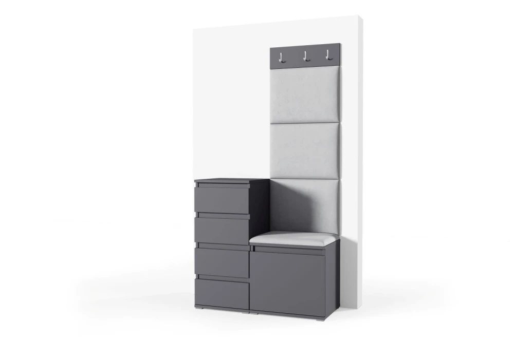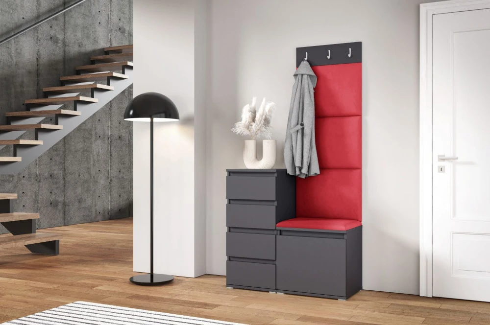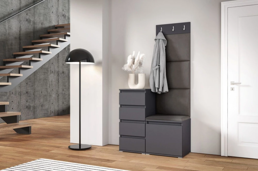 Čalouněná předsíň EMI 36 s barevnými panely je ideální volbou pro ty, kteří hledají originální a funkční řešení.Představujeme vám čalouněnou předsíň EMI, která kombinuje moderní design, praktické využití a jedinečnou estetiku. Moderní předsíňová sestava zahrnuje komodu se čtyřmi zásuvkami a botník s věšákem.Čalouněné panely v různých barvách jsou nejen vizuálně atraktivní, ale také přinášejí pohodlí a funkčnost, díky kterým bude vaše předsíň působit útulně a stylově zároveň.Čalouněné panely EMI jsou vyrobeny z odolných materiálů, které zajišťují dlouhou životnost i snadnou údržbu. Povrchy odolné vůči nečistotám a vlhkosti jsou praktické zejména v předsíních, které jsou každodenně zatěžované. Stěnu si můžete umístit v pravo nebo v levo.