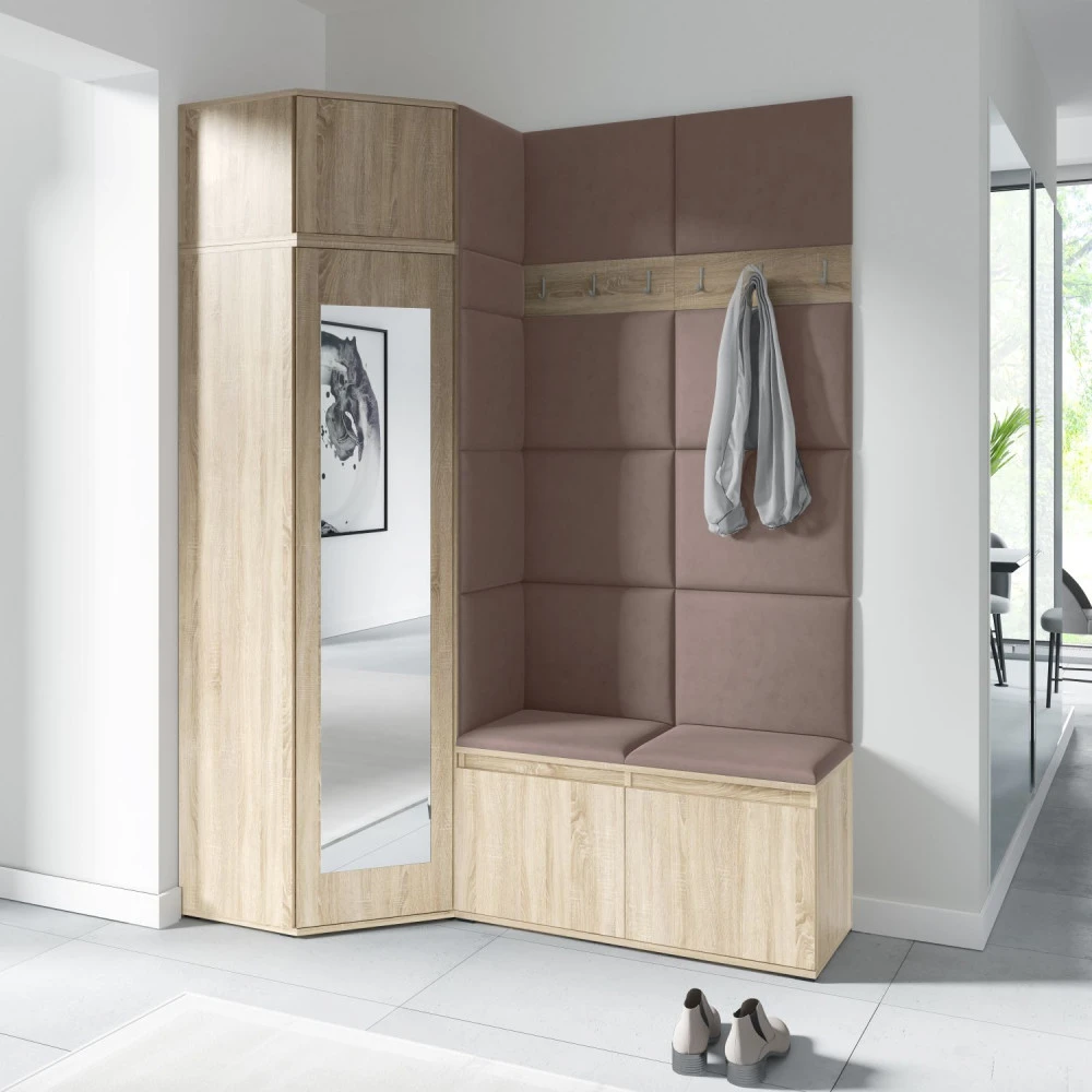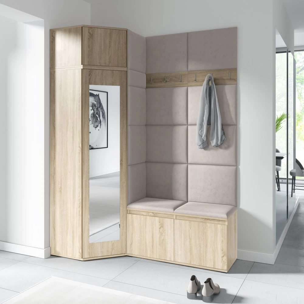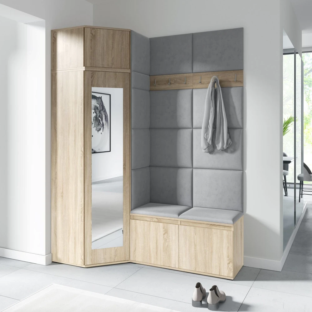 Čalouněná předsíň EMI 37 s barevnými panely je ideální volbou pro ty, kteří hledají originální a funkční řešení.Představujeme vám čalouněnou předsíň EMI, která kombinuje moderní design, praktické využití a jedinečnou estetiku. Moderní předsíňová sestava zahrnuje úložný prostor s botníkem a šatní skříní.Díky svému promyšlenému designu poskytuje dostatek úložného prostoru, aniž by zabírala příliš místa. Elegantní provedení a kvalitní materiály zaručují nejen funkčnost, ale také estetický doplněk do každého interiéru. Skvěle se hodí do menších i větších předsíní a usnadní vám organizaci každodenních nezbytností.Čalouněné panely v různých barvách jsou nejen vizuálně atraktivní, ale také přinášejí pohodlí a funkčnost, díky kterým bude vaše předsíň působit útulně a stylově zároveň.Čalouněné panely EMI jsou vyrobeny z odolných materiálů, které zajišťují dlouhou životnost i snadnou údržbu. Povrchy odolné vůči nečistotám a vlhkosti jsou praktické zejména v předsíních, které jsou každodenně zatěžované. Šatní skříň je k dispozici se zrcadlem nebo bez něj. Stěnu si můžete umístit v pravo nebo v levo.