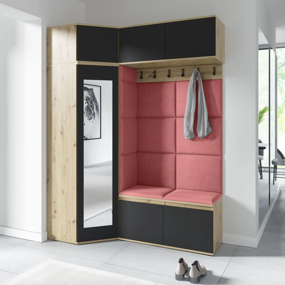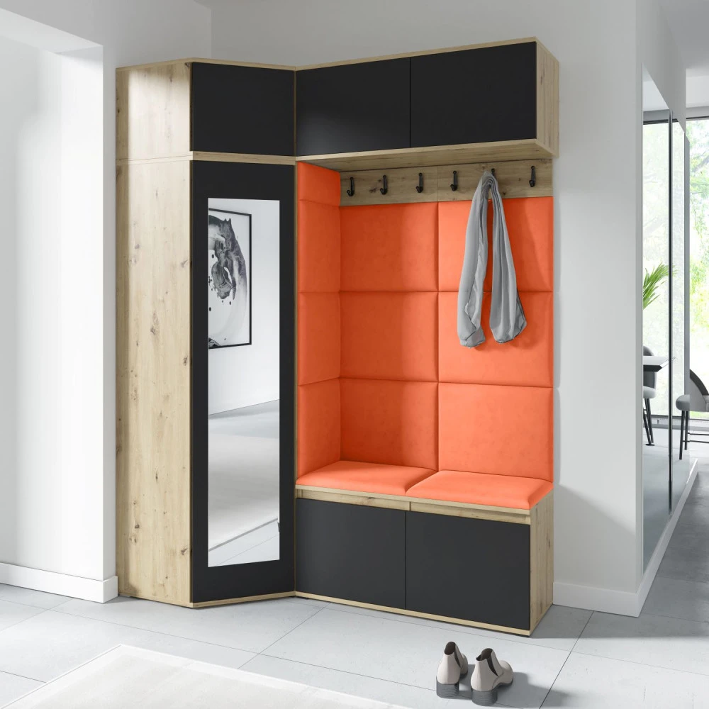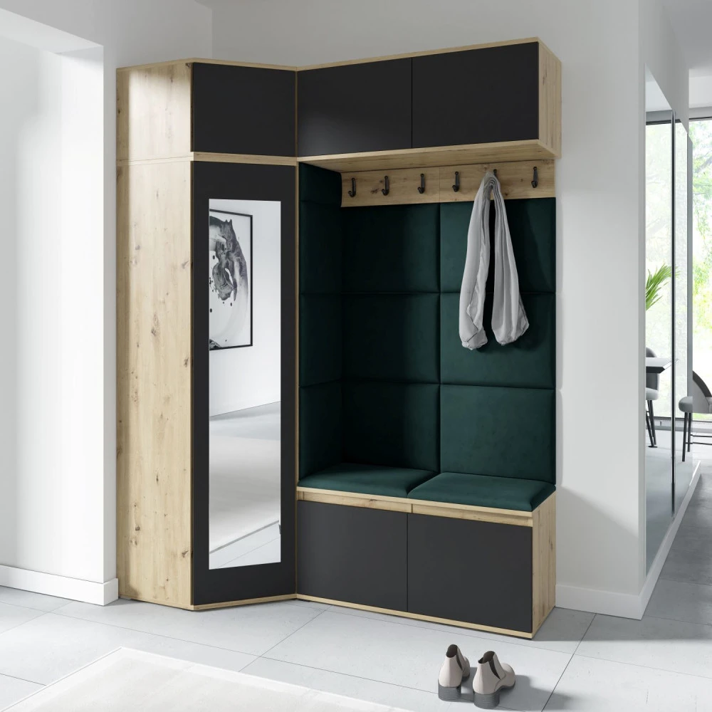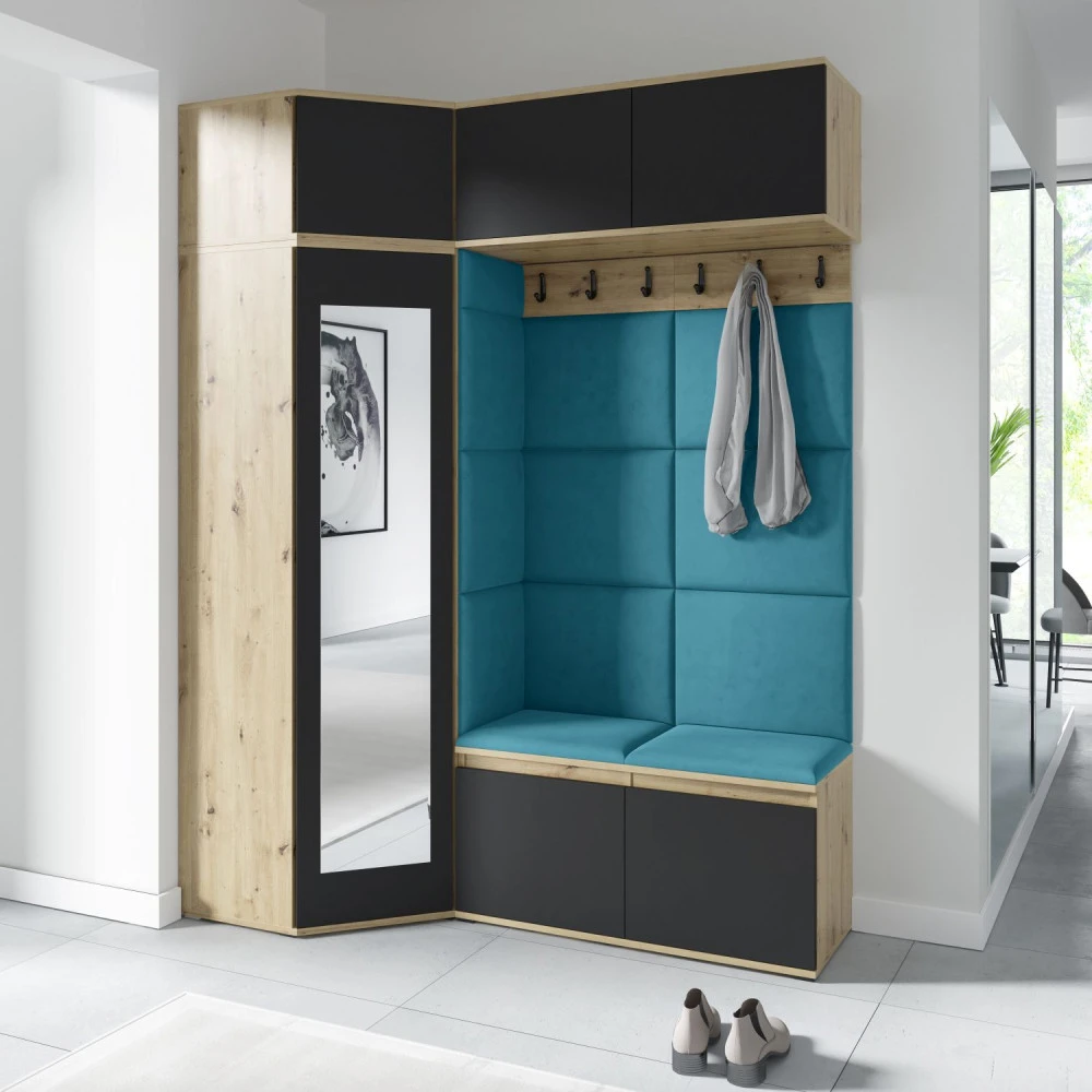 Čalouněná předsíň EMI 38 s barevnými panely je ideální volbou pro ty, kteří hledají originální a funkční řešení.Představujeme vám čalouněnou předsíň EMI, která kombinuje moderní design, praktické využití a jedinečnou estetiku. Moderní předsíňová sestava s rohovou skříní a nástavcem,závěsnou skříňkou a botníkem.Díky svému promyšlenému designu poskytuje dostatek úložného prostoru, aniž by zabírala příliš místa. Elegantní provedení a kvalitní materiály zaručují nejen funkčnost, ale také estetický doplněk do každého interiéru. Skvěle se hodí do menších i větších předsíní a usnadní vám organizaci každodenních nezbytností.Čalouněné panely v různých barvách jsou nejen vizuálně atraktivní, ale také přinášejí pohodlí a funkčnost, díky kterým bude vaše předsíň působit útulně a stylově zároveň.Čalouněné panely EMI jsou vyrobeny z odolných materiálů, které zajišťují dlouhou životnost i snadnou údržbu. Povrchy odolné vůči nečistotám a vlhkosti jsou praktické zejména v předsíních, které jsou každodenně zatěžované. Šatní skříň je k dispozici se zrcadlem nebo bez něj. Stěnu si můžete umístit v pravo nebo v levo.
