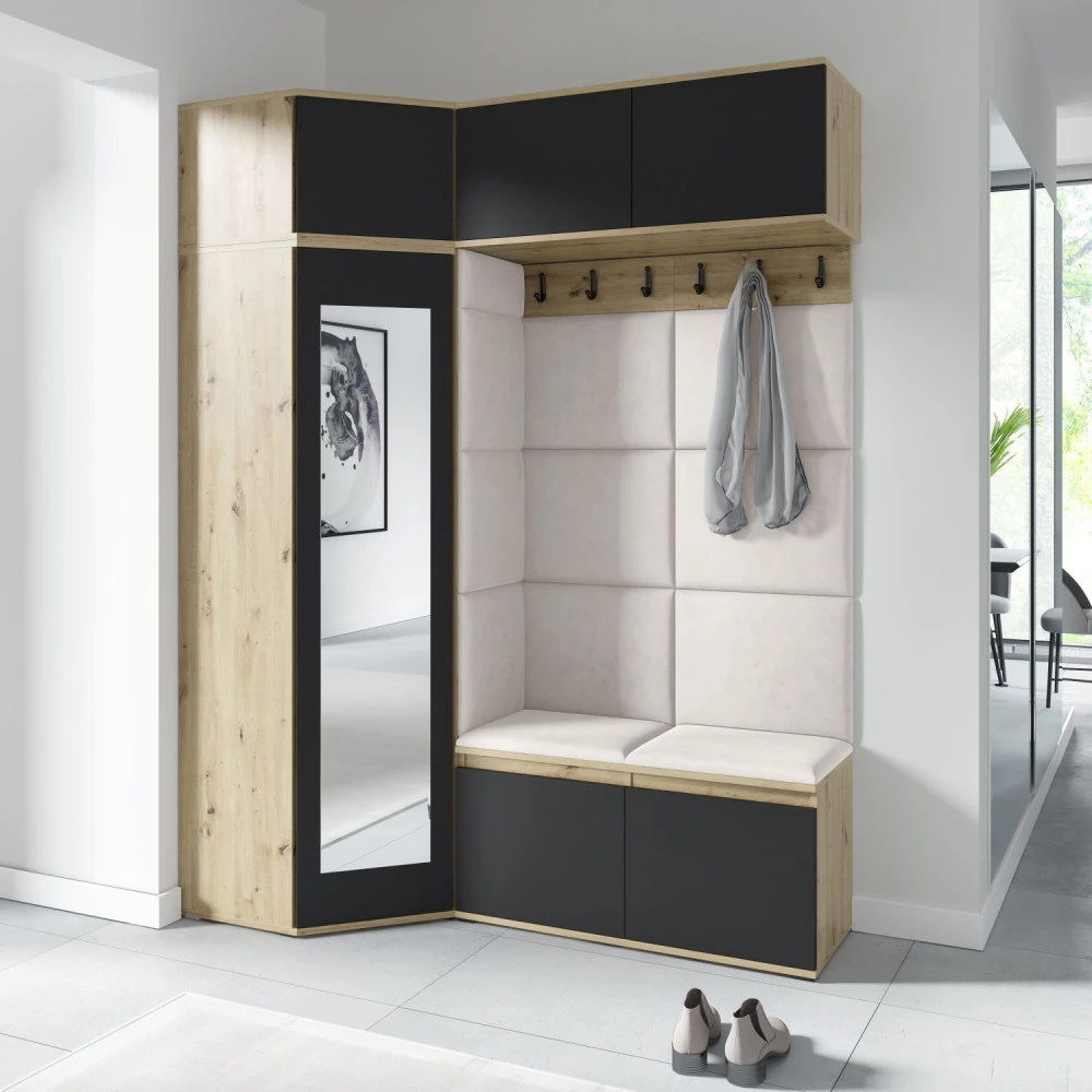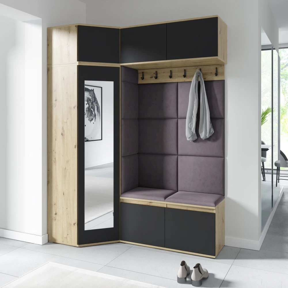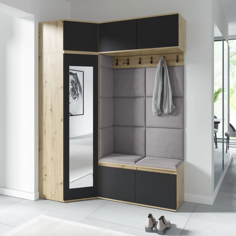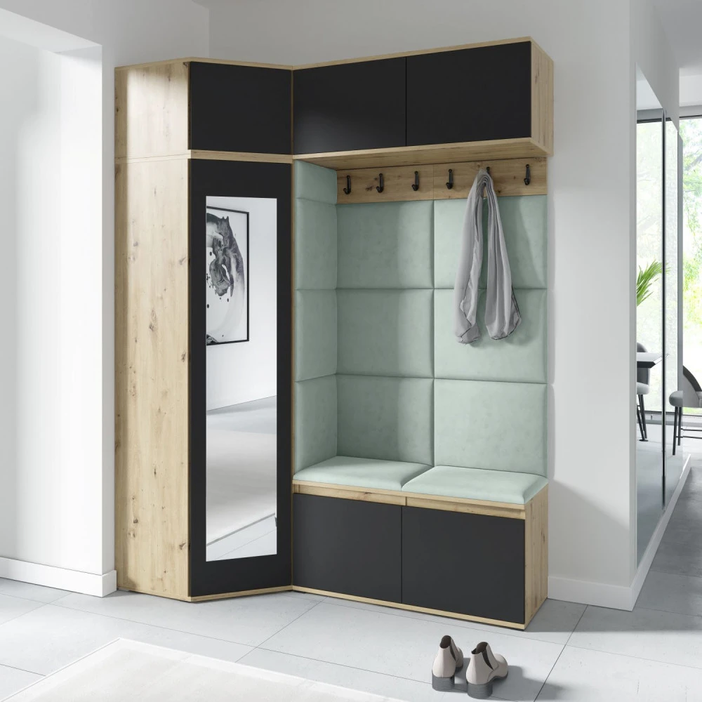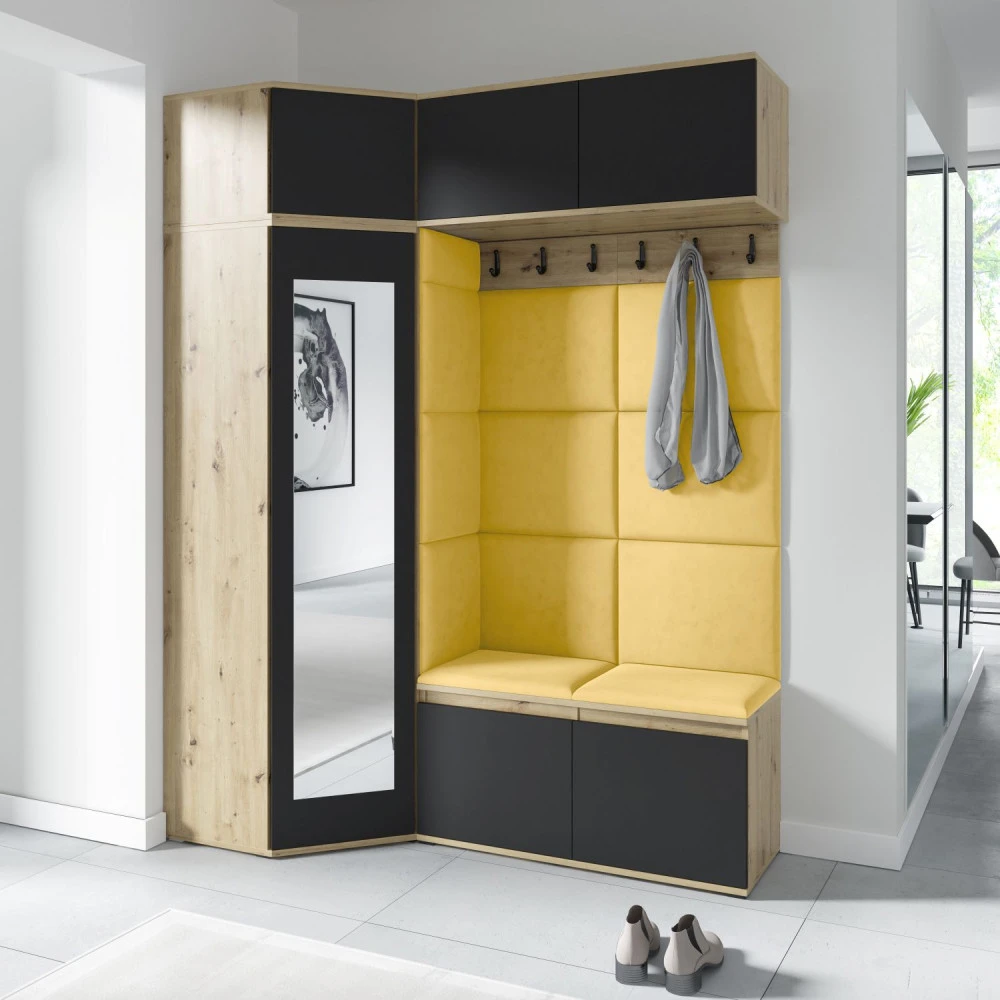 Čalouněná předsíň EMI 38 s barevnými panely je ideální volbou pro ty, kteří hledají originální a funkční řešení.Představujeme vám čalouněnou předsíň EMI, která kombinuje moderní design, praktické využití a jedinečnou estetiku. Moderní předsíňová sestava s rohovou skříní a nástavcem,závěsnou skříňkou a botníkem.Díky svému promyšlenému designu poskytuje dostatek úložného prostoru, aniž by zabírala příliš místa. Elegantní provedení a kvalitní materiály zaručují nejen funkčnost, ale také estetický doplněk do každého interiéru. Skvěle se hodí do menších i větších předsíní a usnadní vám organizaci každodenních nezbytností.Čalouněné panely v různých barvách jsou nejen vizuálně atraktivní, ale také přinášejí pohodlí a funkčnost, díky kterým bude vaše předsíň působit útulně a stylově zároveň.Čalouněné panely EMI jsou vyrobeny z odolných materiálů, které zajišťují dlouhou životnost i snadnou údržbu. Povrchy odolné vůči nečistotám a vlhkosti jsou praktické zejména v předsíních, které jsou každodenně zatěžované. Šatní skříň je k dispozici se zrcadlem nebo bez něj. Stěnu si můžete umístit v pravo nebo v levo.