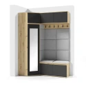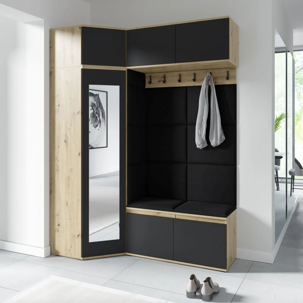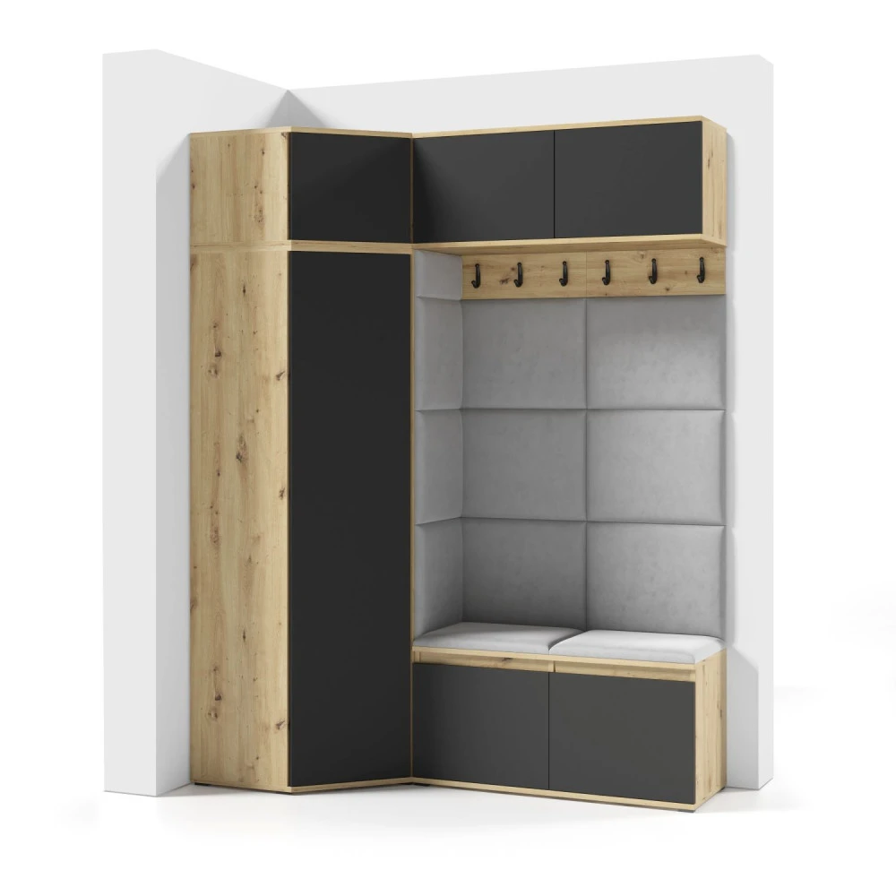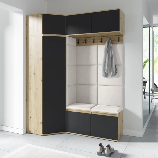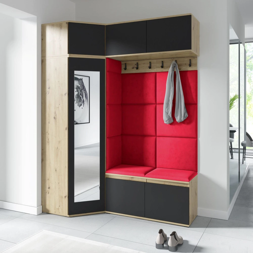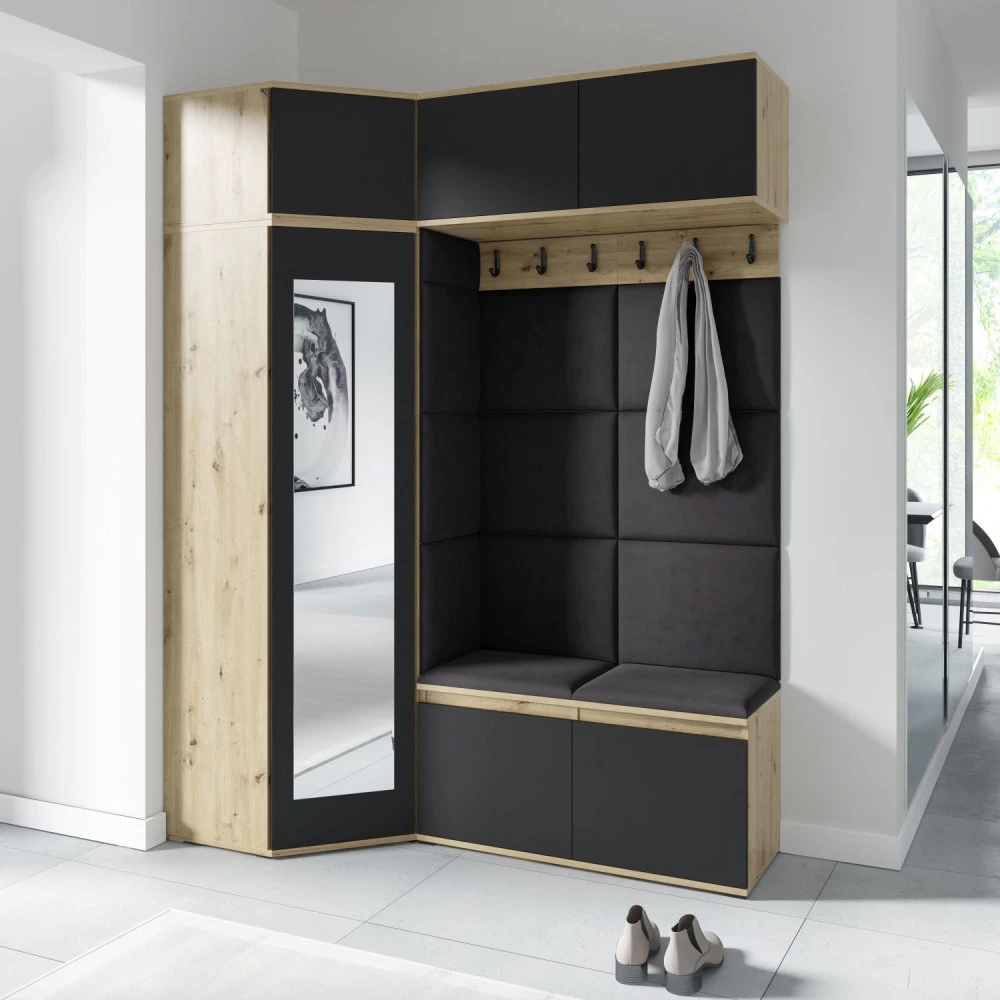 Čalouněná předsíň EMI 38 s barevnými panely je ideální volbou pro ty, kteří hledají originální a funkční řešení.Představujeme vám čalouněnou předsíň EMI, která kombinuje moderní design, praktické využití a jedinečnou estetiku. Moderní předsíňová sestava s rohovou skříní a nástavcem,závěsnou skříňkou a botníkem.Díky svému promyšlenému designu poskytuje dostatek úložného prostoru, aniž by zabírala příliš místa. Elegantní provedení a kvalitní materiály zaručují nejen funkčnost, ale také estetický doplněk do každého interiéru. Skvěle se hodí do menších i větších předsíní a usnadní vám organizaci každodenních nezbytností.Čalouněné panely v různých barvách jsou nejen vizuálně atraktivní, ale také přinášejí pohodlí a funkčnost, díky kterým bude vaše předsíň působit útulně a stylově zároveň.Čalouněné panely EMI jsou vyrobeny z odolných materiálů, které zajišťují dlouhou životnost i snadnou údržbu. Povrchy odolné vůči nečistotám a vlhkosti jsou praktické zejména v předsíních, které jsou každodenně zatěžované. Šatní skříň je k dispozici se zrcadlem nebo bez něj. Stěnu si můžete umístit v pravo nebo v levo.