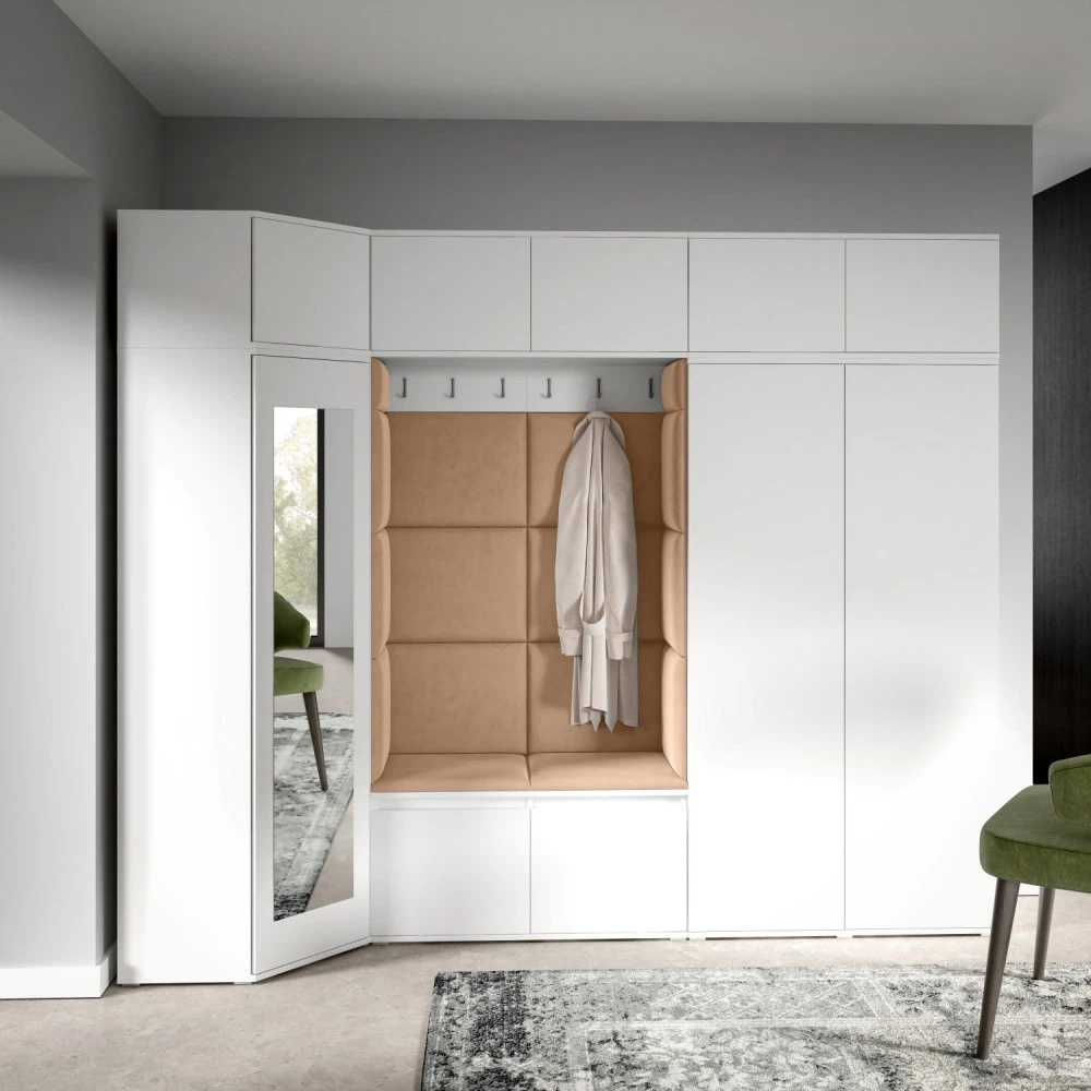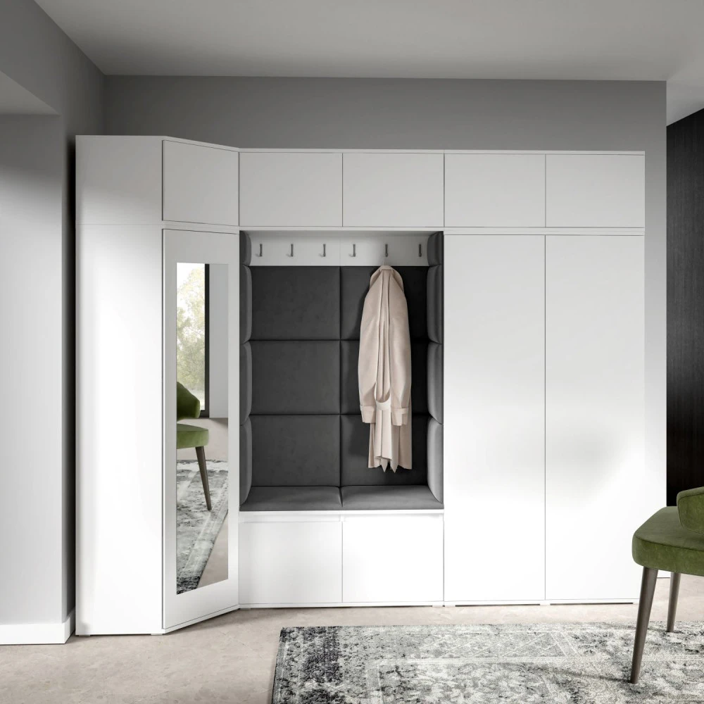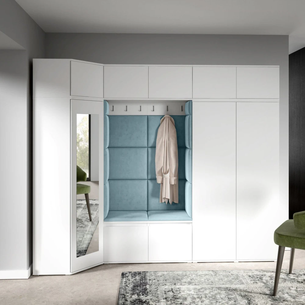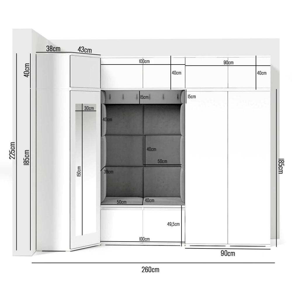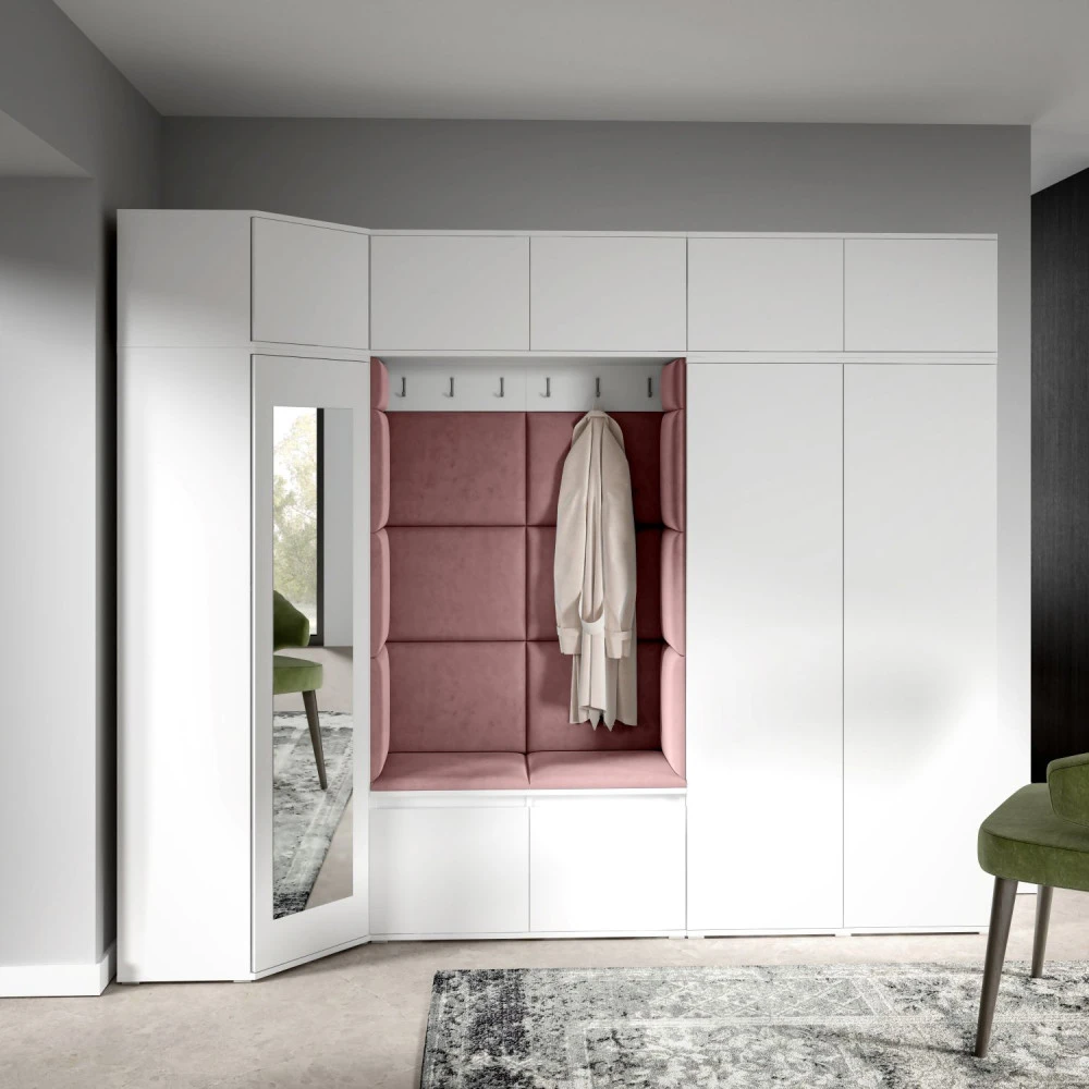 Čalouněná předsíň EMI 39 s barevnými panely je ideální volbou pro ty, kteří hledají originální a funkční řešení.Představujeme vám čalouněnou předsíň EMI, která kombinuje moderní design, praktické využití a jedinečnou estetiku. Moderní předsíňová sestava s rohovou skříní a nástavcem,závěsnou skříňkou,botníkem a šatní skříň s nástavcem.Díky svému promyšlenému designu poskytuje dostatek úložného prostoru, aniž by zabírala příliš místa. Elegantní provedení a kvalitní materiály zaručují nejen funkčnost, ale také estetický doplněk do každého interiéru. Skvěle se hodí do menších i větších předsíní a usnadní vám organizaci každodenních nezbytností.Čalouněné panely v různých barvách jsou nejen vizuálně atraktivní, ale také přinášejí pohodlí a funkčnost, díky kterým bude vaše předsíň působit útulně a stylově zároveň.Čalouněné panely EMI jsou vyrobeny z odolných materiálů, které zajišťují dlouhou životnost i snadnou údržbu. Povrchy odolné vůči nečistotám a vlhkosti jsou praktické zejména v předsíních, které jsou každodenně zatěžované.Stěnu si můžete umístit v pravo nebo v levo.