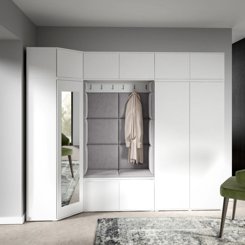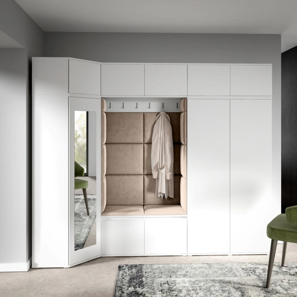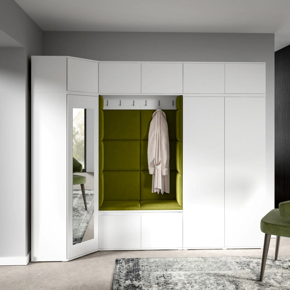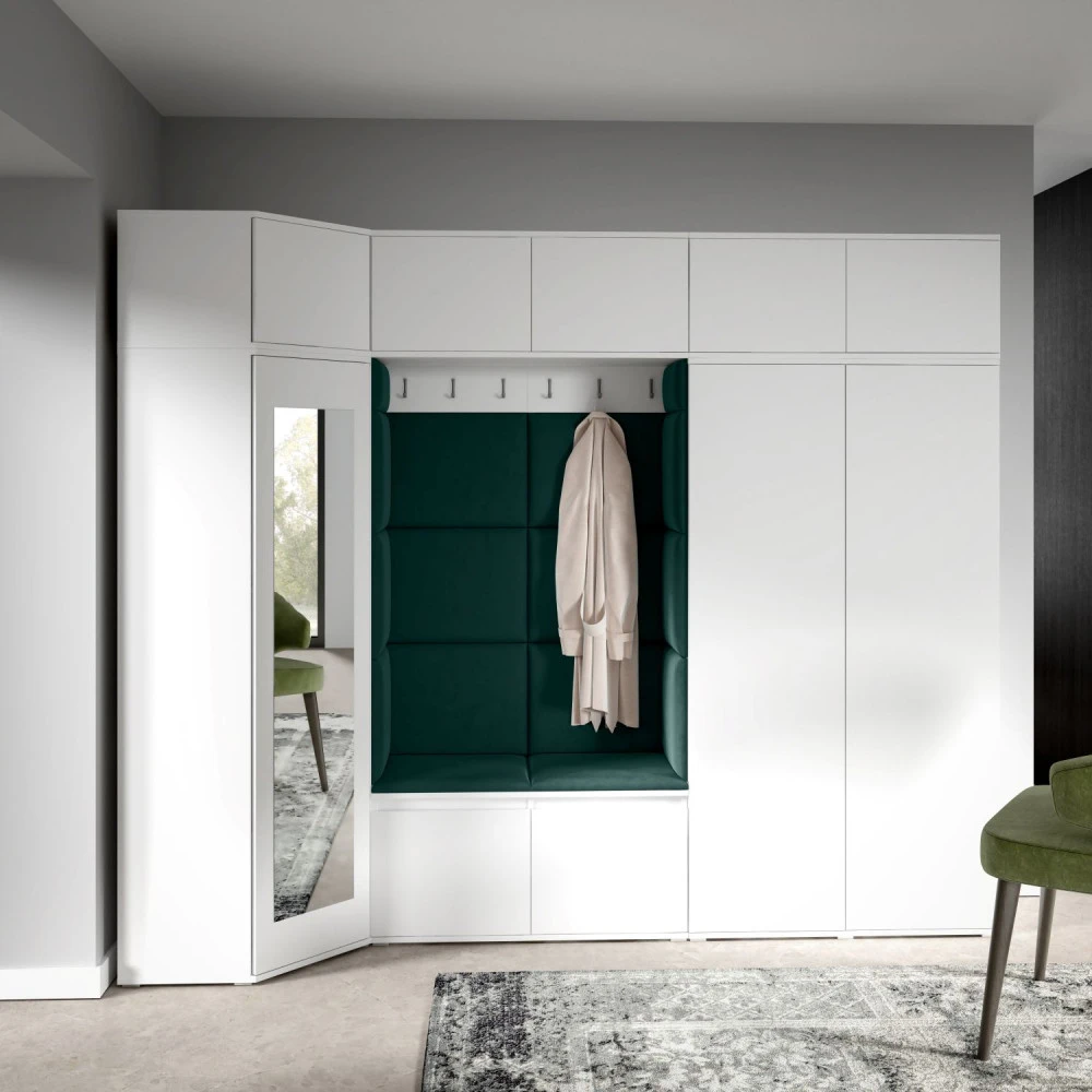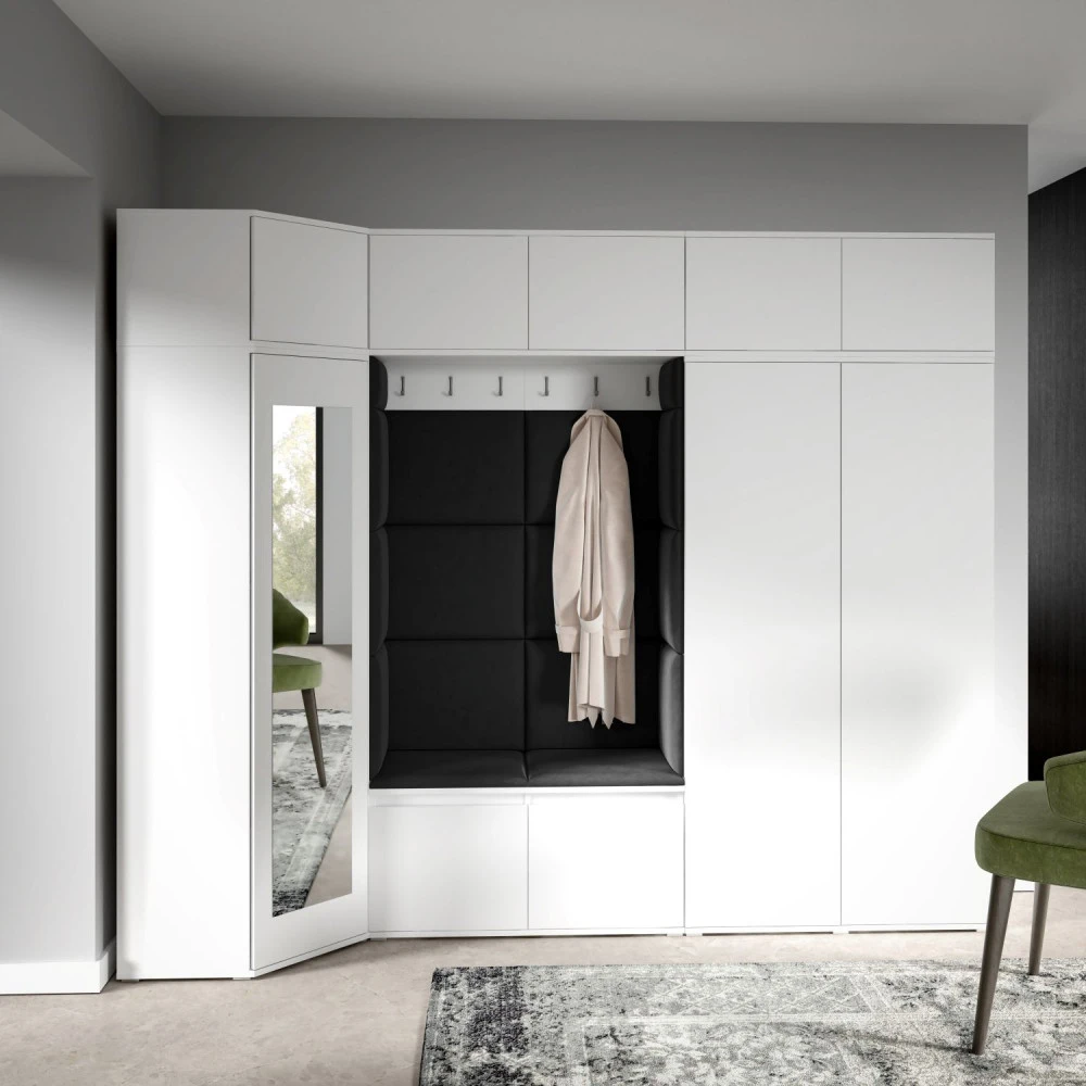 Čalouněná předsíň EMI 39 s barevnými panely je ideální volbou pro ty, kteří hledají originální a funkční řešení.Představujeme vám čalouněnou předsíň EMI, která kombinuje moderní design, praktické využití a jedinečnou estetiku. Moderní předsíňová sestava s rohovou skříní a nástavcem,závěsnou skříňkou,botníkem a šatní skříň s nástavcem.Díky svému promyšlenému designu poskytuje dostatek úložného prostoru, aniž by zabírala příliš místa. Elegantní provedení a kvalitní materiály zaručují nejen funkčnost, ale také estetický doplněk do každého interiéru. Skvěle se hodí do menších i větších předsíní a usnadní vám organizaci každodenních nezbytností.Čalouněné panely v různých barvách jsou nejen vizuálně atraktivní, ale také přinášejí pohodlí a funkčnost, díky kterým bude vaše předsíň působit útulně a stylově zároveň.Čalouněné panely EMI jsou vyrobeny z odolných materiálů, které zajišťují dlouhou životnost i snadnou údržbu. Povrchy odolné vůči nečistotám a vlhkosti jsou praktické zejména v předsíních, které jsou každodenně zatěžované.Stěnu si můžete umístit v pravo nebo v levo.