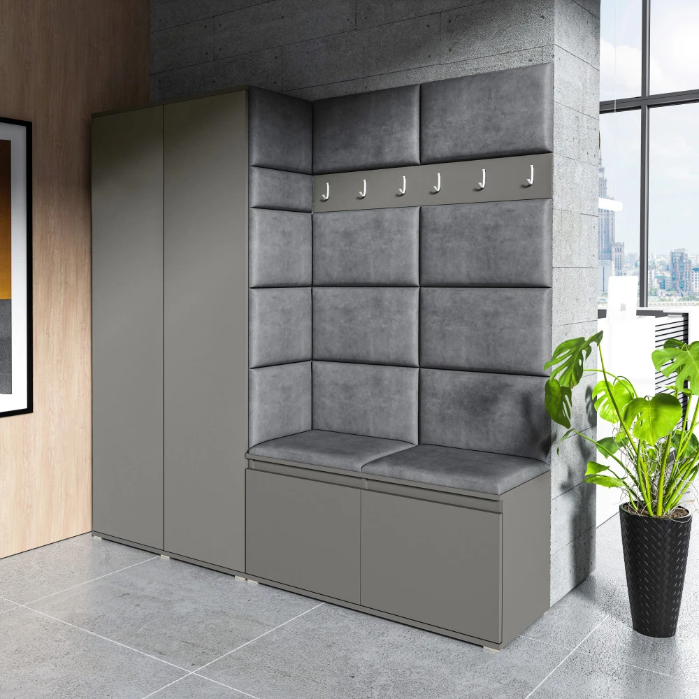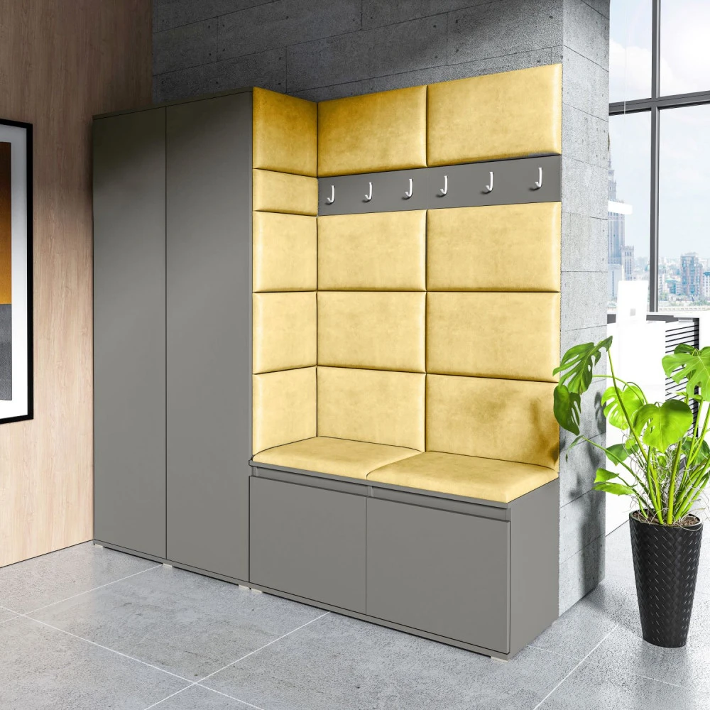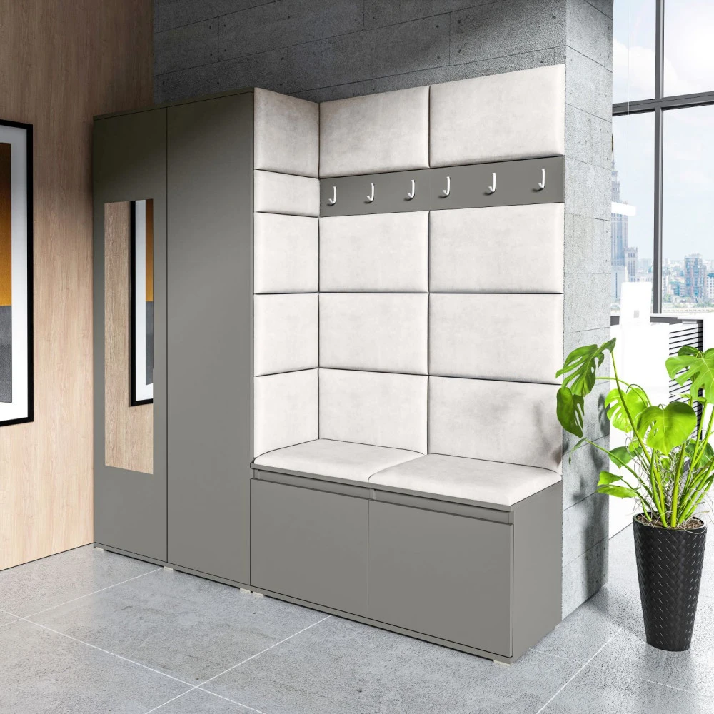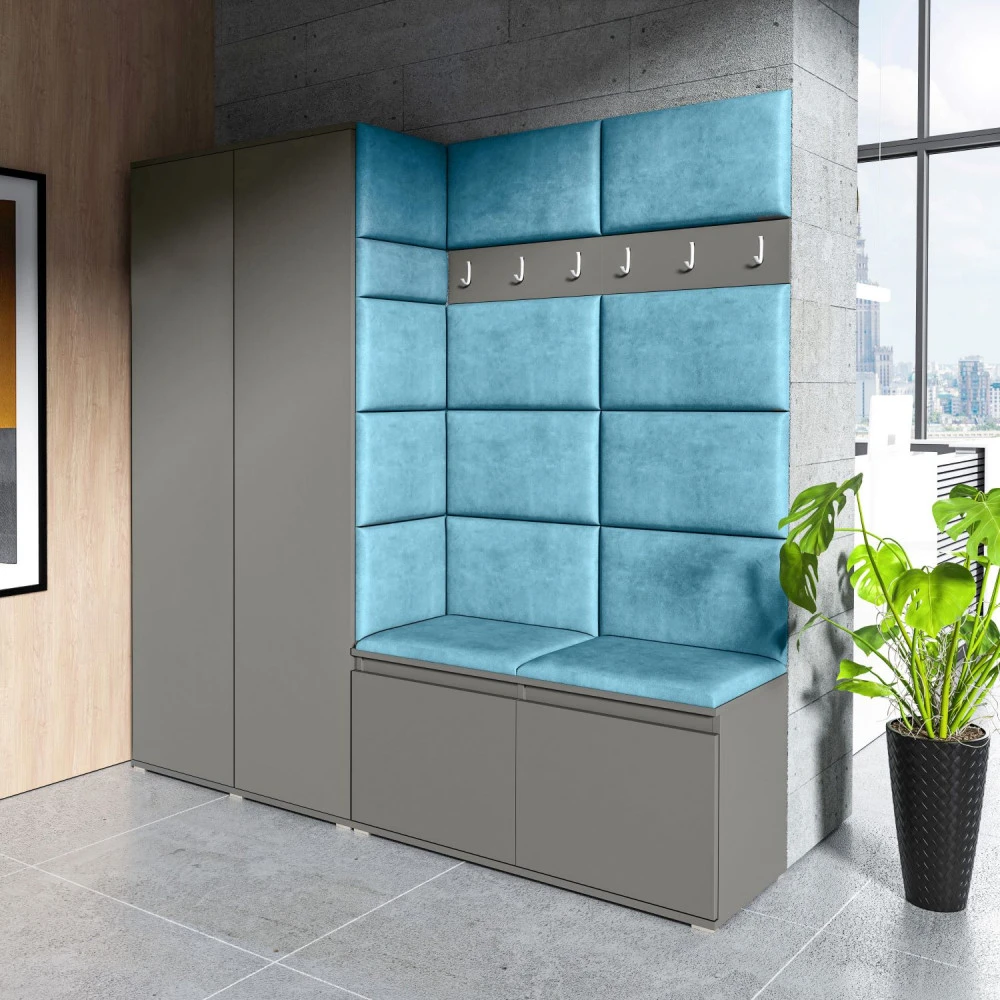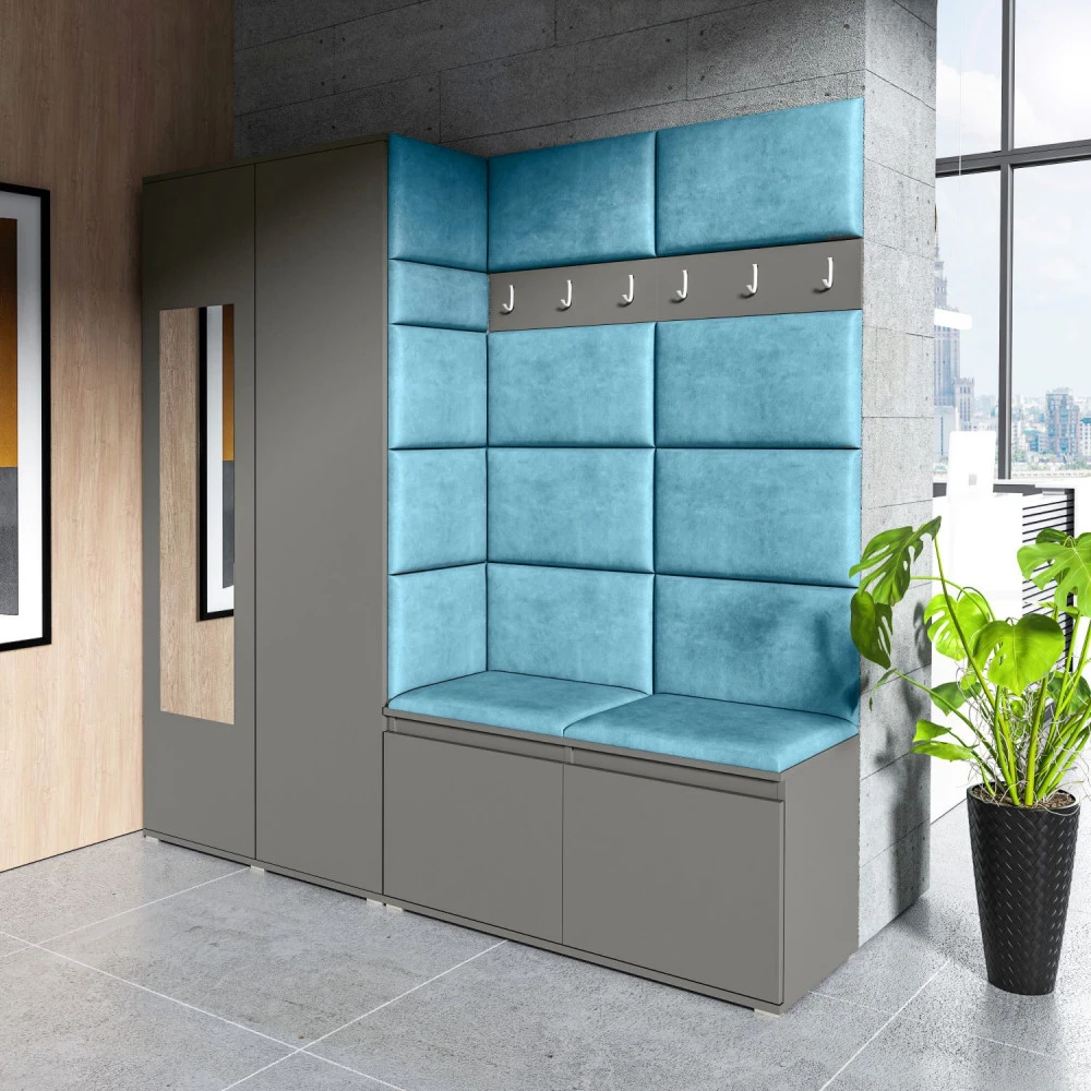 Čalouněná předsíň EMI 8 s barevnými panely je ideální volbou pro ty, kteří hledají originální a funkční řešení.Představujeme vám čalouněnou předsíň EMI, která kombinuje moderní design, praktické využití a jedinečnou estetiku. Čalouněné panely v různých barvách jsou nejen vizuálně atraktivní, ale také přinášejí pohodlí a funkčnost, díky kterým bude vaše předsíň působit útulně a stylově zároveň.Čalouněné panely EMI jsou vyrobeny z odolných materiálů, které zajišťují dlouhou životnost i snadnou údržbu. Povrchy odolné vůči nečistotám a vlhkosti jsou praktické zejména v předsíních, které jsou každodenně zatěžované. Stěnu si můžete umístit v pravo nebo v levo, taktéž si můžete sami zvolit kam dáte dvířka se zrcadlem.