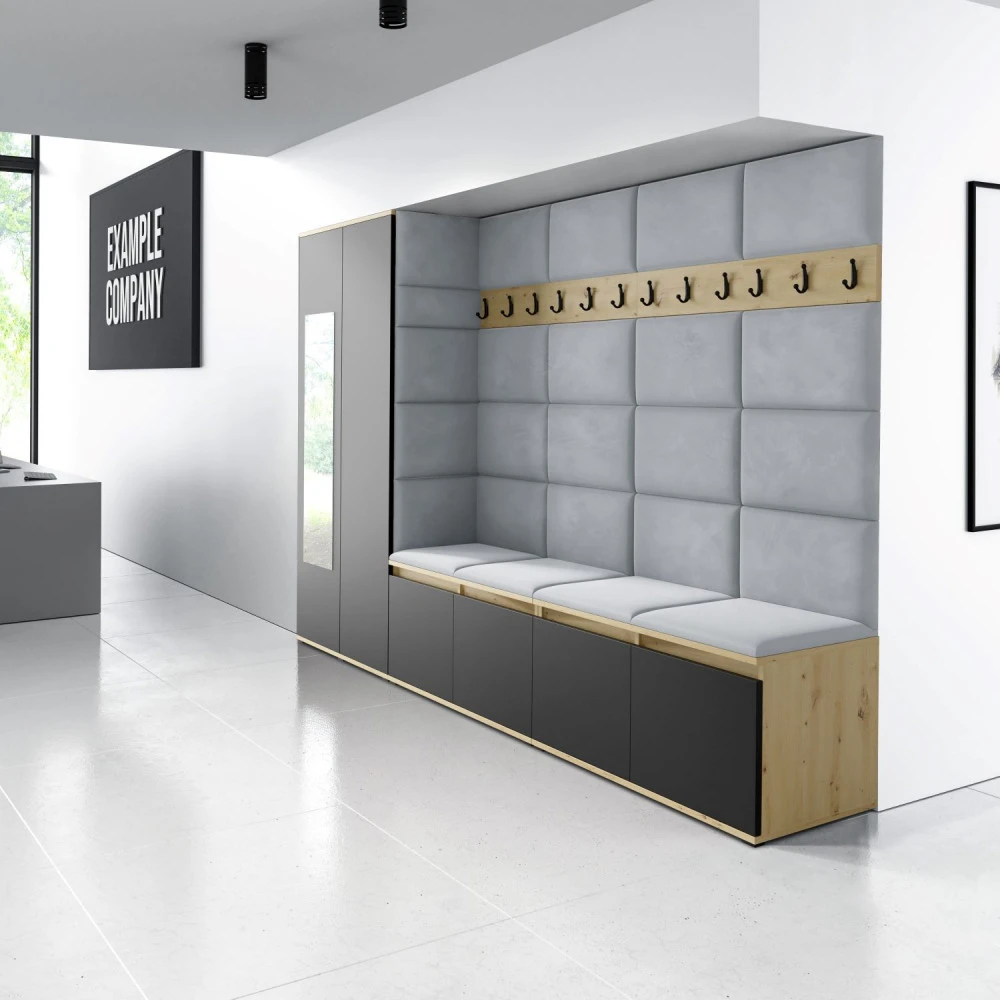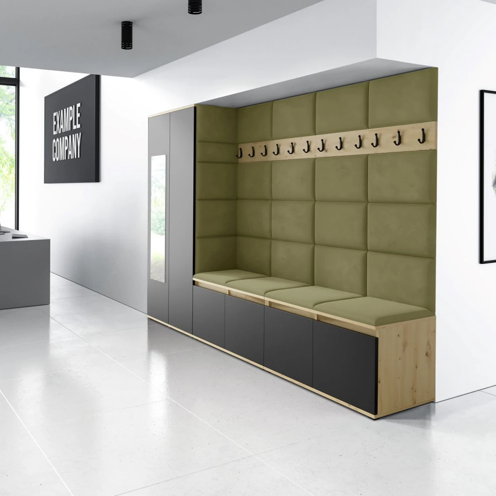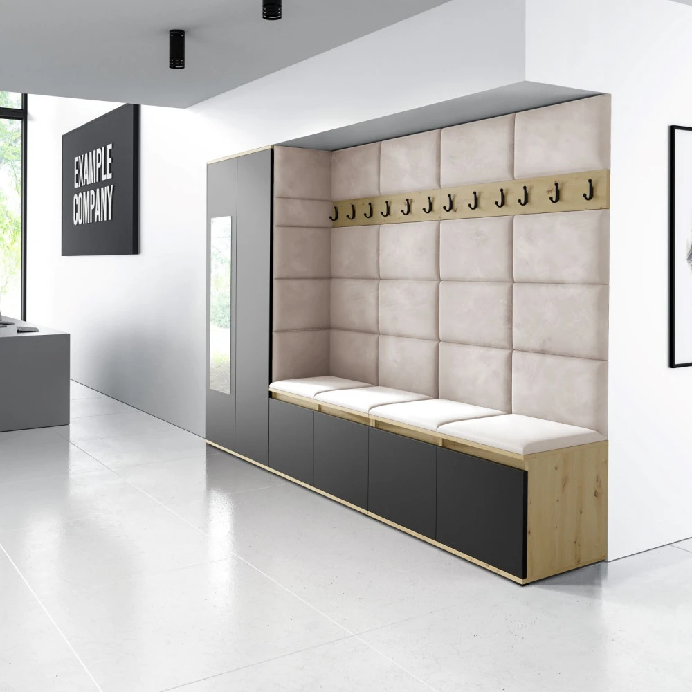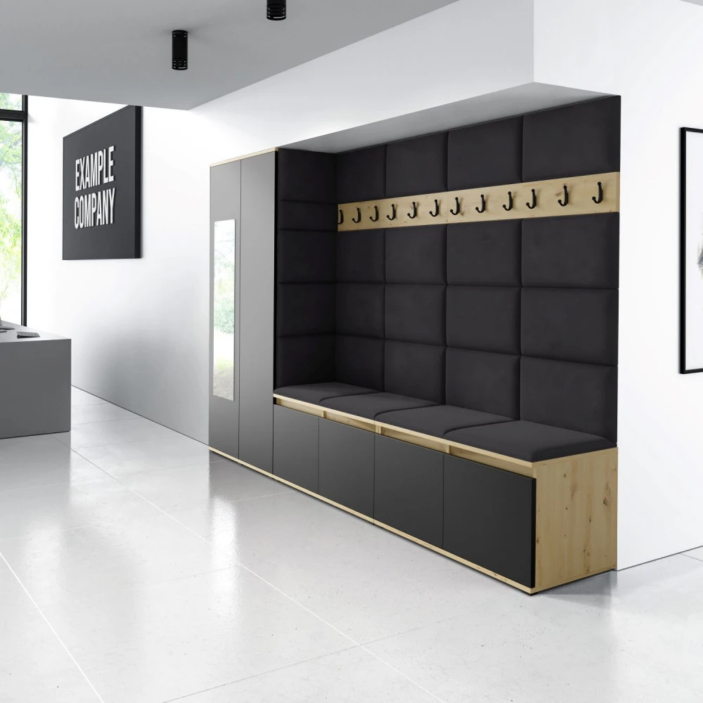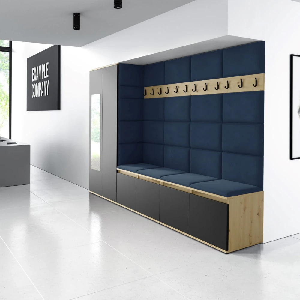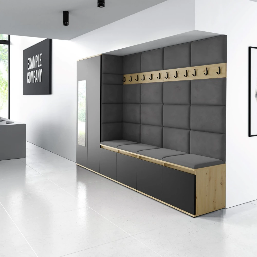 Čalouněná předsíň EMI 9 s barevnými panely je ideální volbou pro ty, kteří hledají originální a funkční řešení.Představujeme vám čalouněnou předsíň EMI, která kombinuje moderní design, praktické využití a jedinečnou estetiku. Čalouněné panely v různých barvách jsou nejen vizuálně atraktivní, ale také přinášejí pohodlí a funkčnost, díky kterým bude vaše předsíň působit útulně a stylově zároveň.Čalouněné panely EMI jsou vyrobeny z odolných materiálů, které zajišťují dlouhou životnost i snadnou údržbu. Povrchy odolné vůči nečistotám a vlhkosti jsou praktické zejména v předsíních, které jsou každodenně zatěžované. Stěnu si můžete umístit v pravo nebo v levo, taktéž si můžete sami zvolit kam dáte dvířka se zrcadlem.