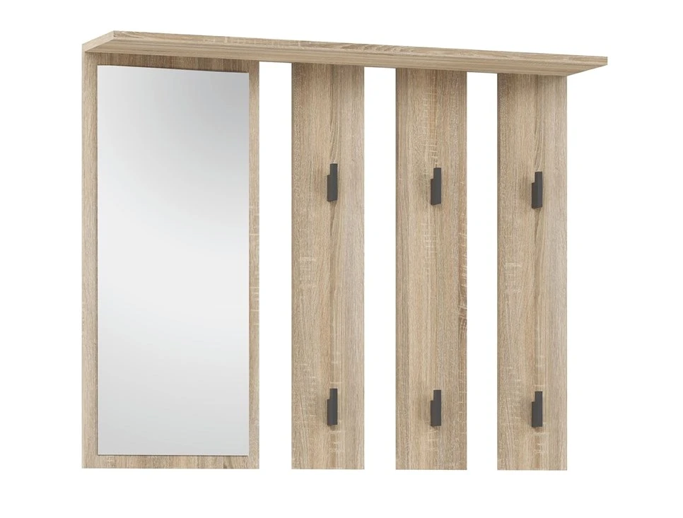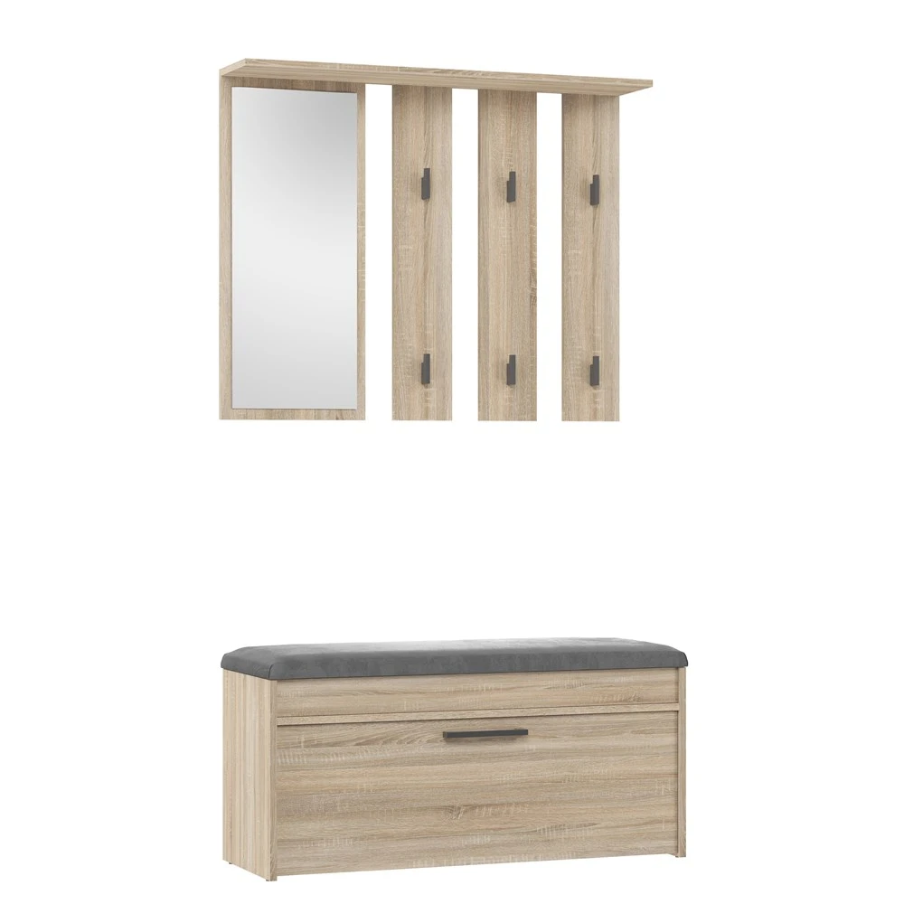 Nadčasová předsíňová sestava Pargas splní očekávání všech, kteří oceňují kombinaci elegance a praktičnosti. Skvěle zapadne do interiérů s minimalistickým či skandinávským charakterem. Sestava se skládá z věšáku se zrcadlem a pohodlného botníku s čalouněným sedákem s výklopnými dvířky. Je vyroben z kvalitního lamina, které je snadno udržovatelné a odolné proti oděru, dlouhou životnost nábytku zajišťují hrany zakončené ABS materiálem.
