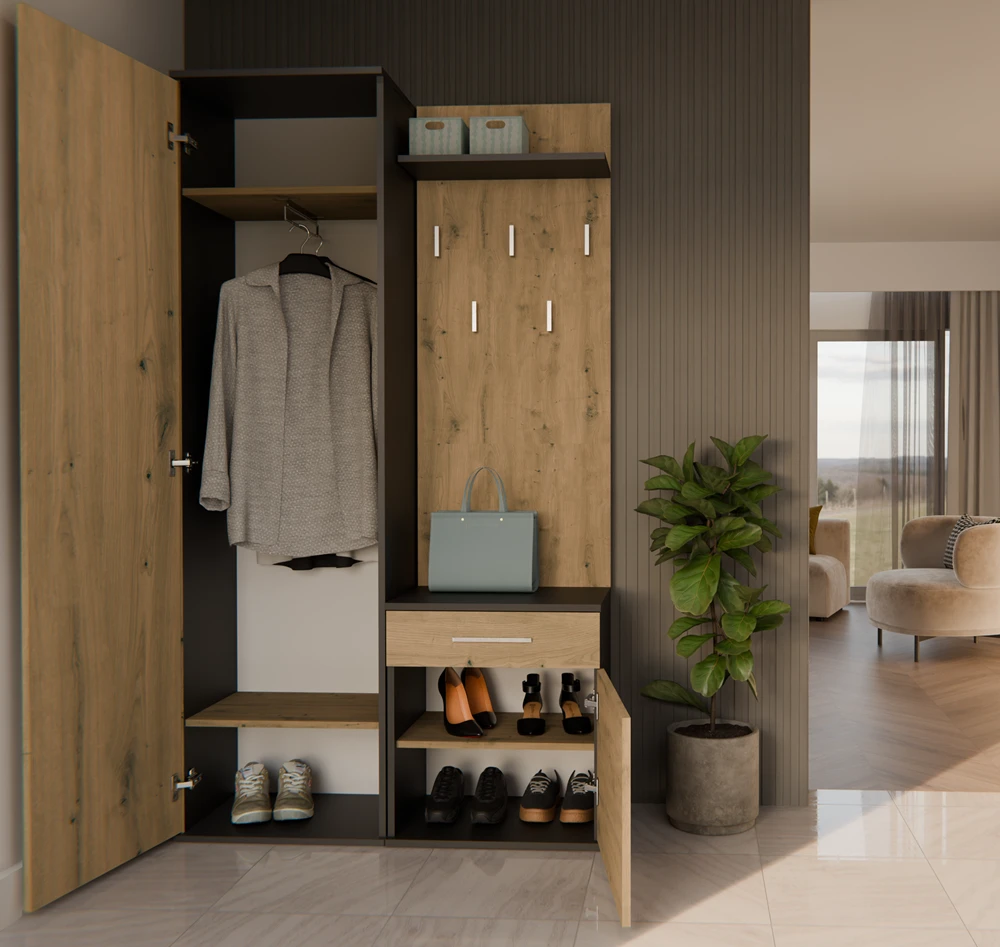 Předsíňová sestava Topaz v moderním stylu a trendy barvách splní očekávání všech, kteří ocení kombinaci jednoduchosti a elegance. Skládá se ze zrcadlové šatní skříně a předsíňové stěny s praktickou zásuvkou a menší skříňkou s možností montáže dvířek na levou nebo pravou stranu. Je vyrobena ze snadno udržovatelného lamina, hrany jsou zakončené vysoce odolným ABS materiálem.