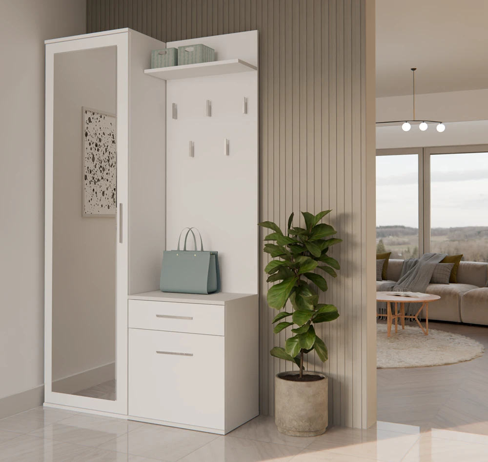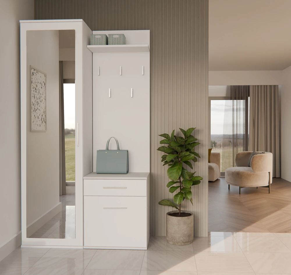 Předsíňová sestava Topaz v moderním stylu a trendy barvách splní očekávání všech, kteří ocení kombinaci jednoduchosti a elegance. Skládá se ze zrcadlové šatní skříně a předsíňové stěny s praktickou zásuvkou a menší skříňkou s možností montáže dvířek na levou nebo pravou stranu. Je vyrobena ze snadno udržovatelného lamina, hrany jsou zakončené vysoce odolným ABS materiálem.