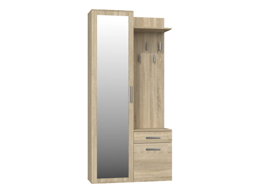 Předsíňová sestava Topaz v moderním stylu a trendy barvách splní očekávání všech, kteří ocení kombinaci jednoduchosti a elegance. Skládá se ze zrcadlové šatní skříně a předsíňové stěny s praktickou zásuvkou a menší skříňkou s možností montáže dvířek na levou nebo pravou stranu. Je vyrobena ze snadno udržovatelného lamina, hrany jsou zakončené vysoce odolným ABS materiálem.