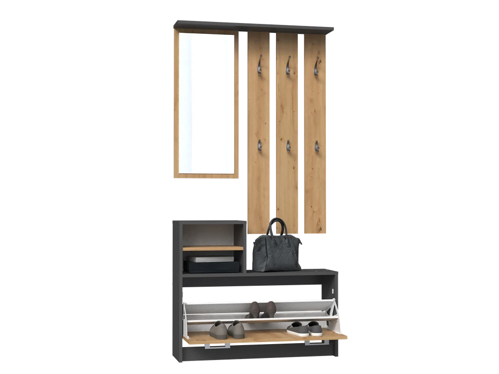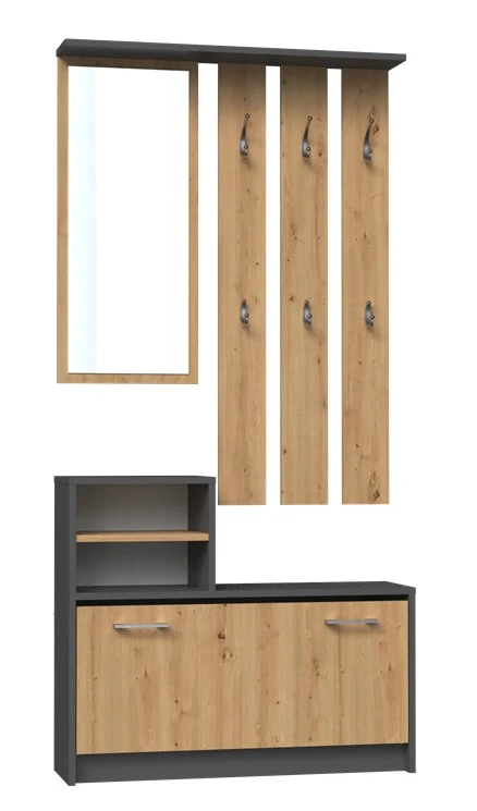 Praktická předsíňová stěna Jantar zútulní každý vstupní prostor vašeho bytu či domu. Je vybavená dostatečným množstvím háčků na oděv, zrcadlem, policemi i funkčním úložným prostorem na boty. Stěna je vyrobena ze snadno udržovatelného lamina, hrany jsou zakončené vysoce odolným ABS materiálem.