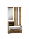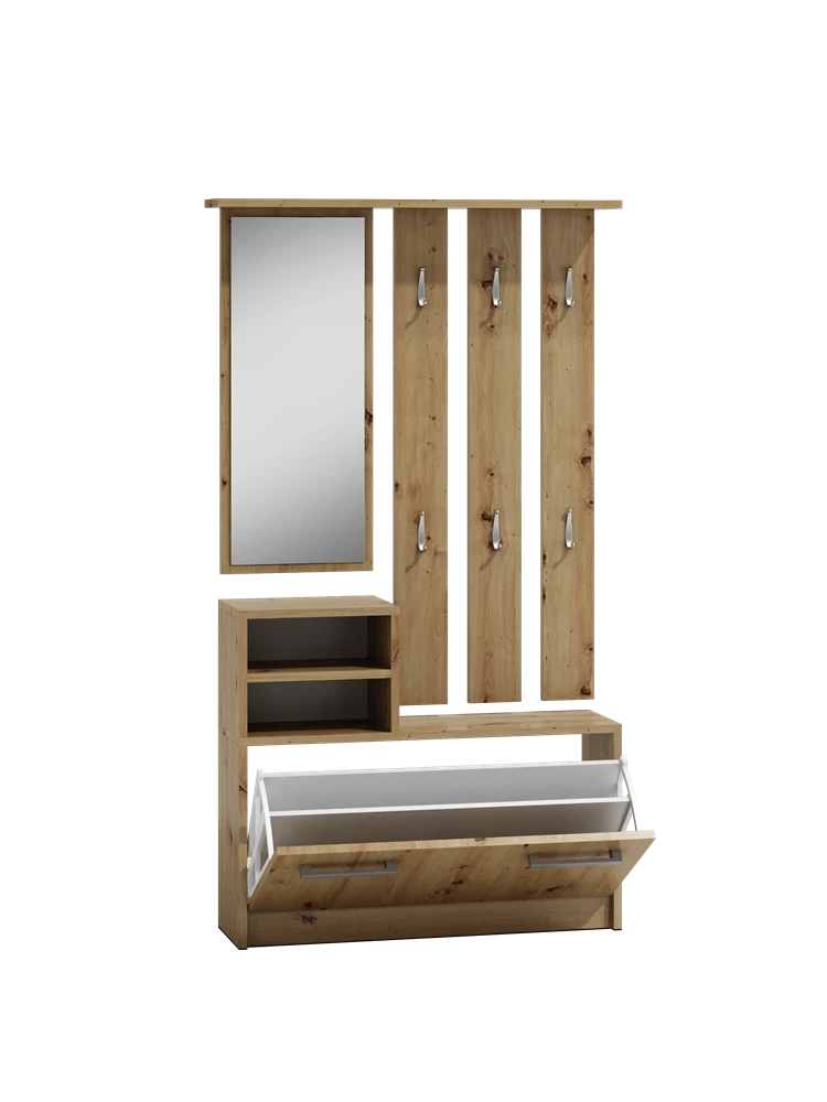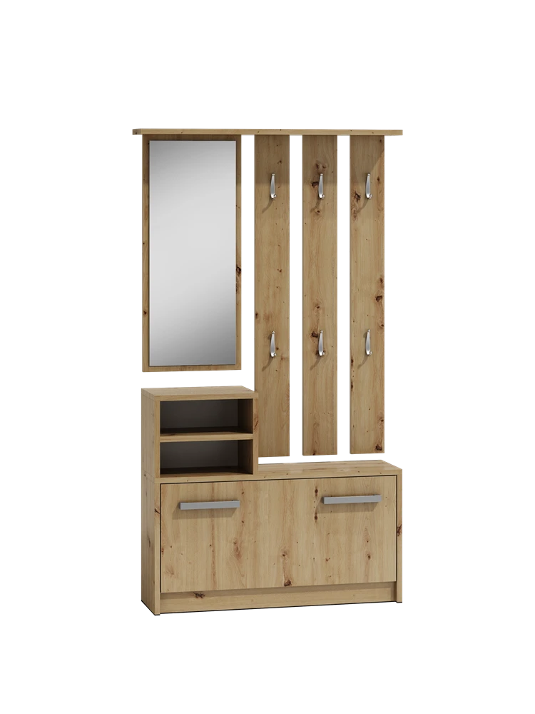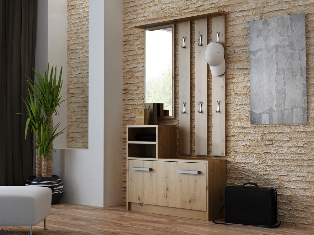 Praktická předsíňová stěna Jantar zútulní každý vstupní prostor vašeho bytu či domu. Je vybavená dostatečným množstvím háčků na oděv, zrcadlem, policemi i funkčním úložným prostorem na boty. Stěna je vyrobena ze snadno udržovatelného lamina, hrany jsou zakončené vysoce odolným ABS materiálem.