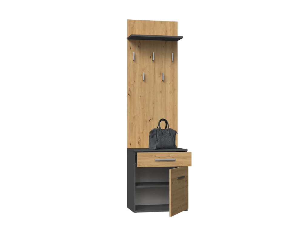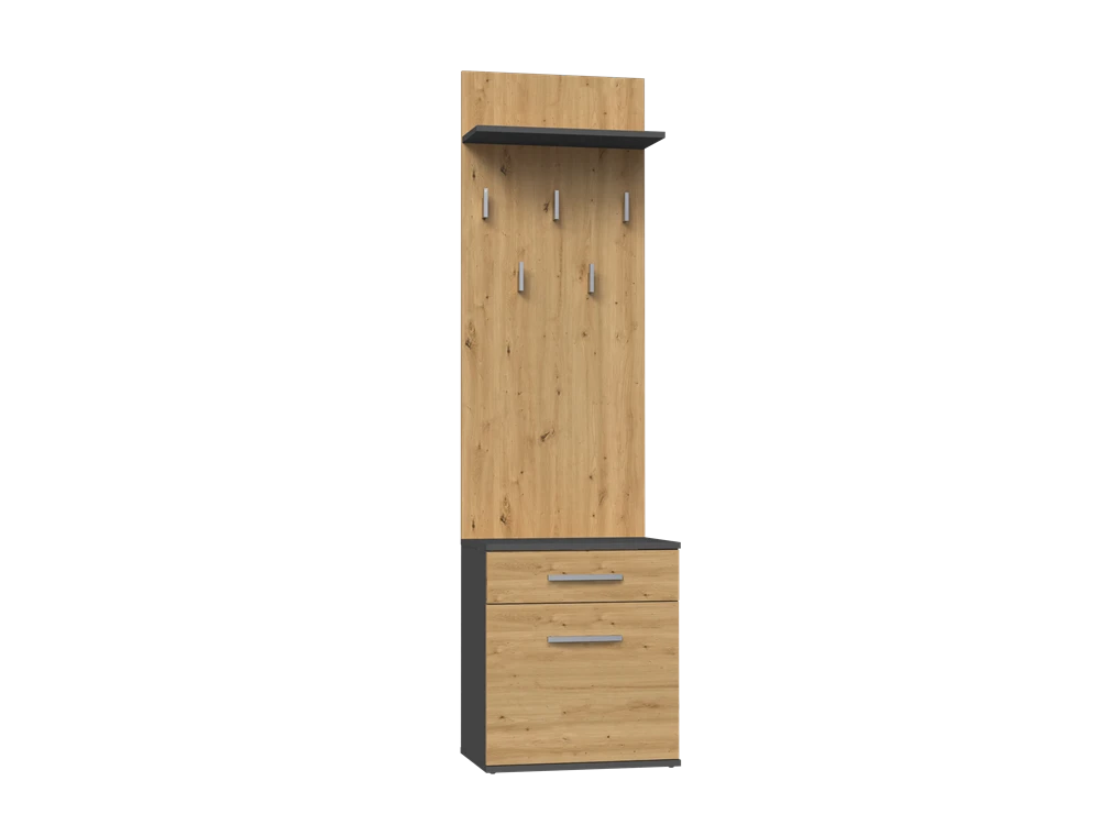 Předsíňová stěna Topaz v moderním stylu a trendy barvách splní očekávání všech, kteří ocení kombinaci jednoduchosti a elegance. Stěna obsahuje praktickou zásuvku a menší skříňku s možností montáže dvířek na levou nebo pravou stranu. Je vyrobena ze snadno udržovatelného lamina, hrany jsou zakončené vysoce odolným ABS materiálem.