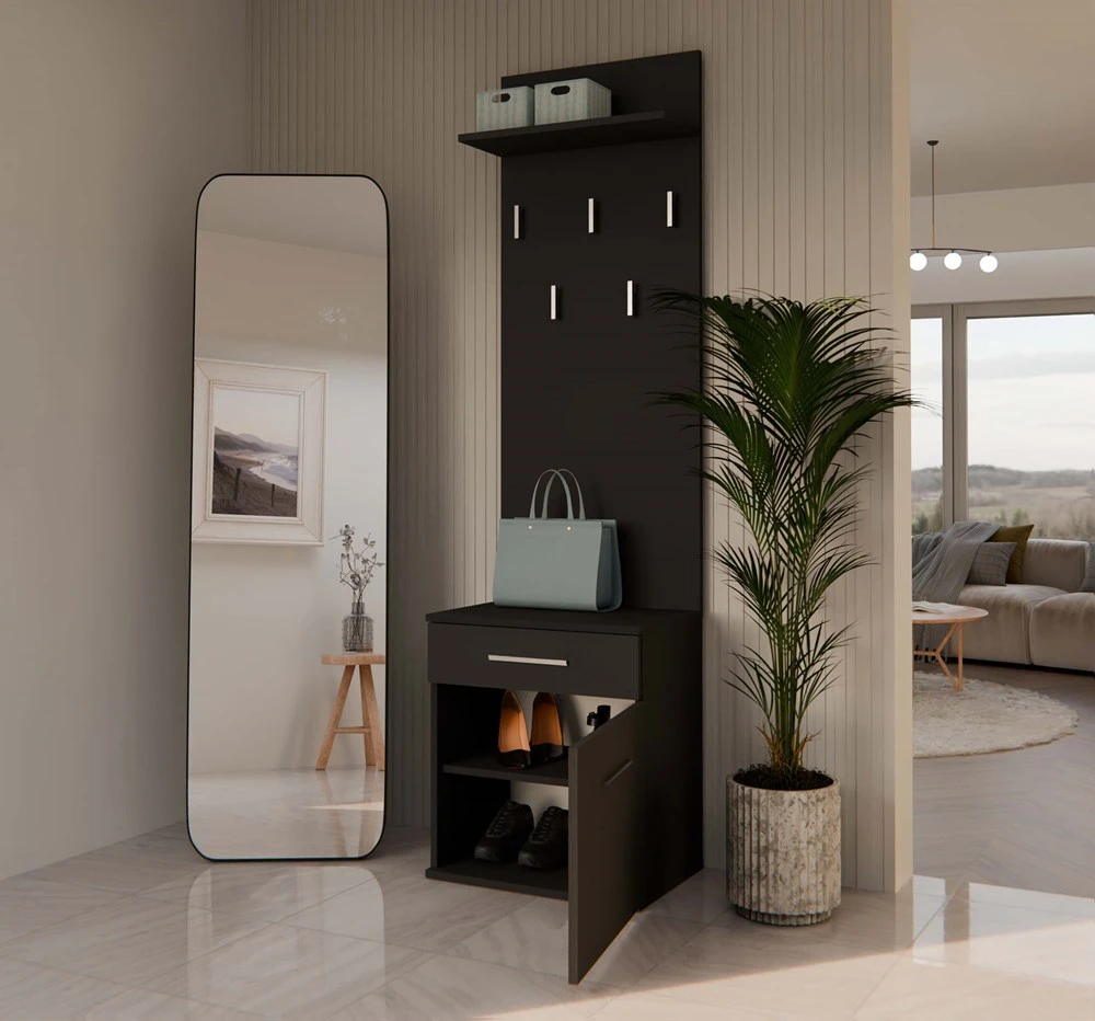 Předsíňová stěna Topaz v moderním stylu a trendy barvách splní očekávání všech, kteří ocení kombinaci jednoduchosti a elegance. Stěna obsahuje praktickou zásuvku a menší skříňku s možností montáže dvířek na levou nebo pravou stranu. Je vyrobena ze snadno udržovatelného lamina, hrany jsou zakončené vysoce odolným ABS materiálem.