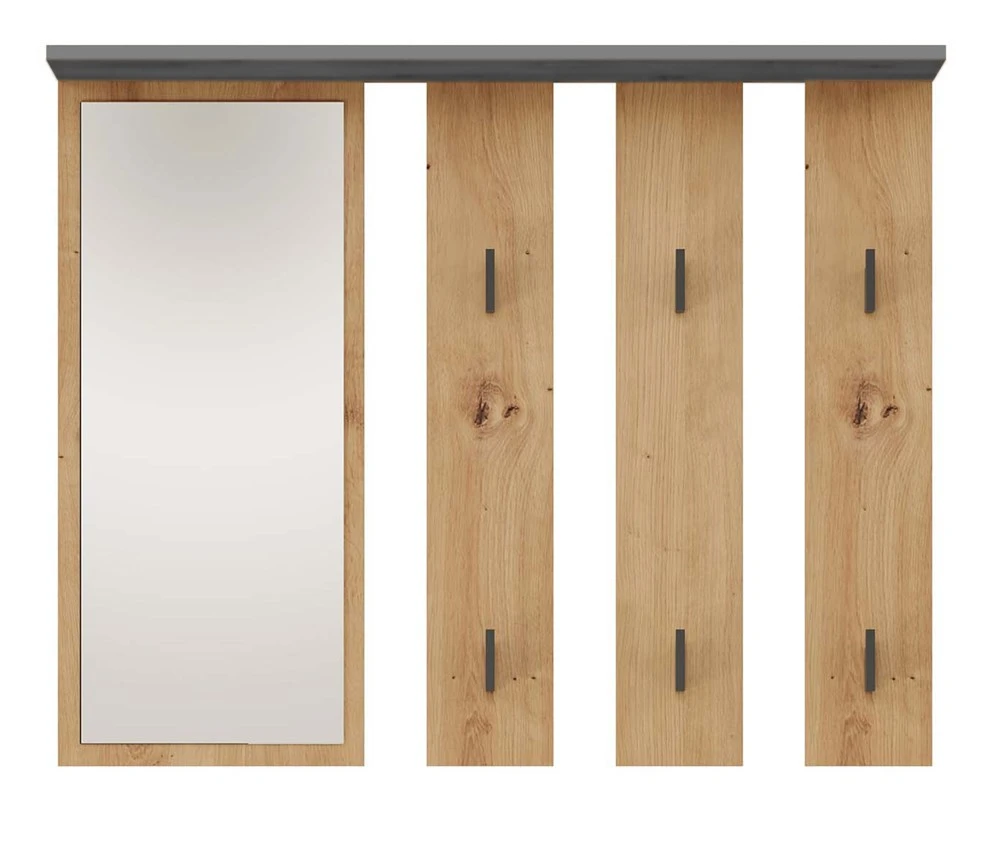 Nástěnný věšák se zrcadlem a policí Pargas splní očekávání všech, kteří oceňují kombinaci elegance a praktičnosti. Je ideálním řešením pro každou předsíň – ať už malou, nebo prostornou. Nábytek je vyroben z kvalitního lamina, které je snadno udržovatelné a odolné proti oděru, dlouhou životnost nábytku zajišťují hrany zakončené odolným ABS materiálem.