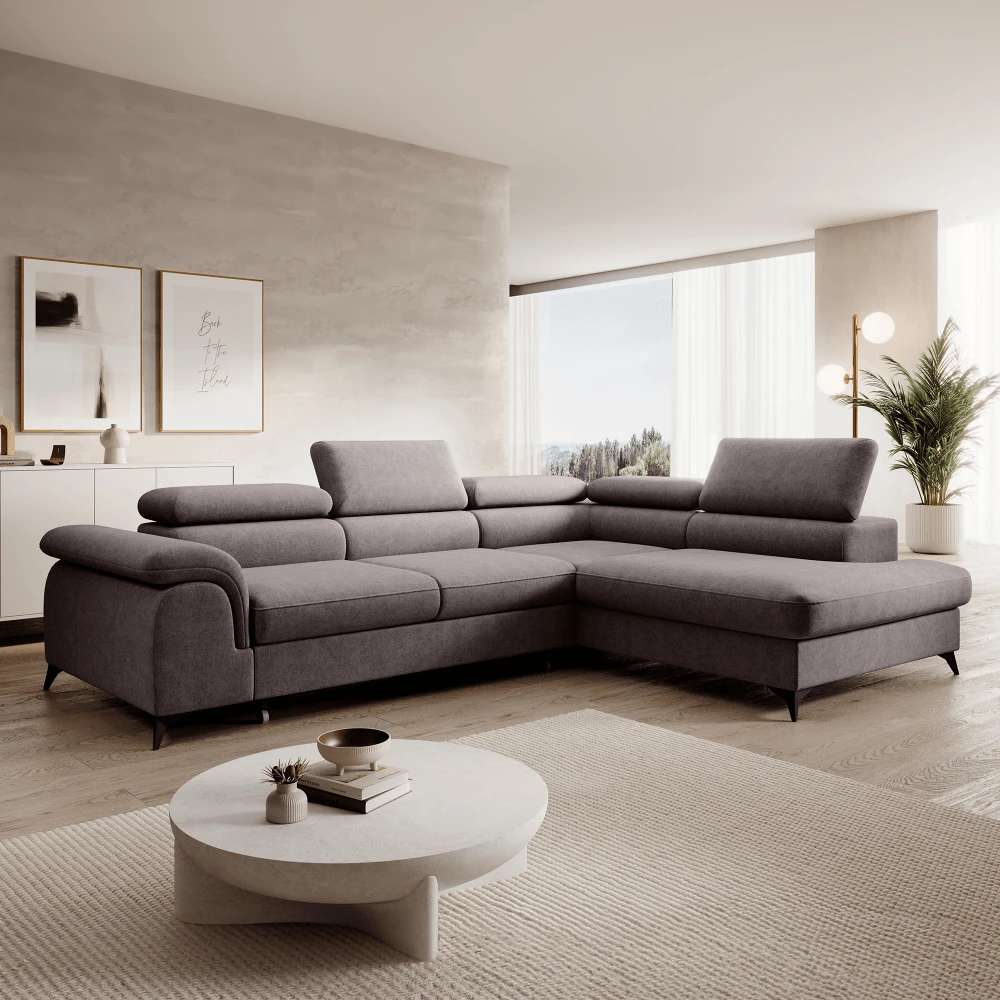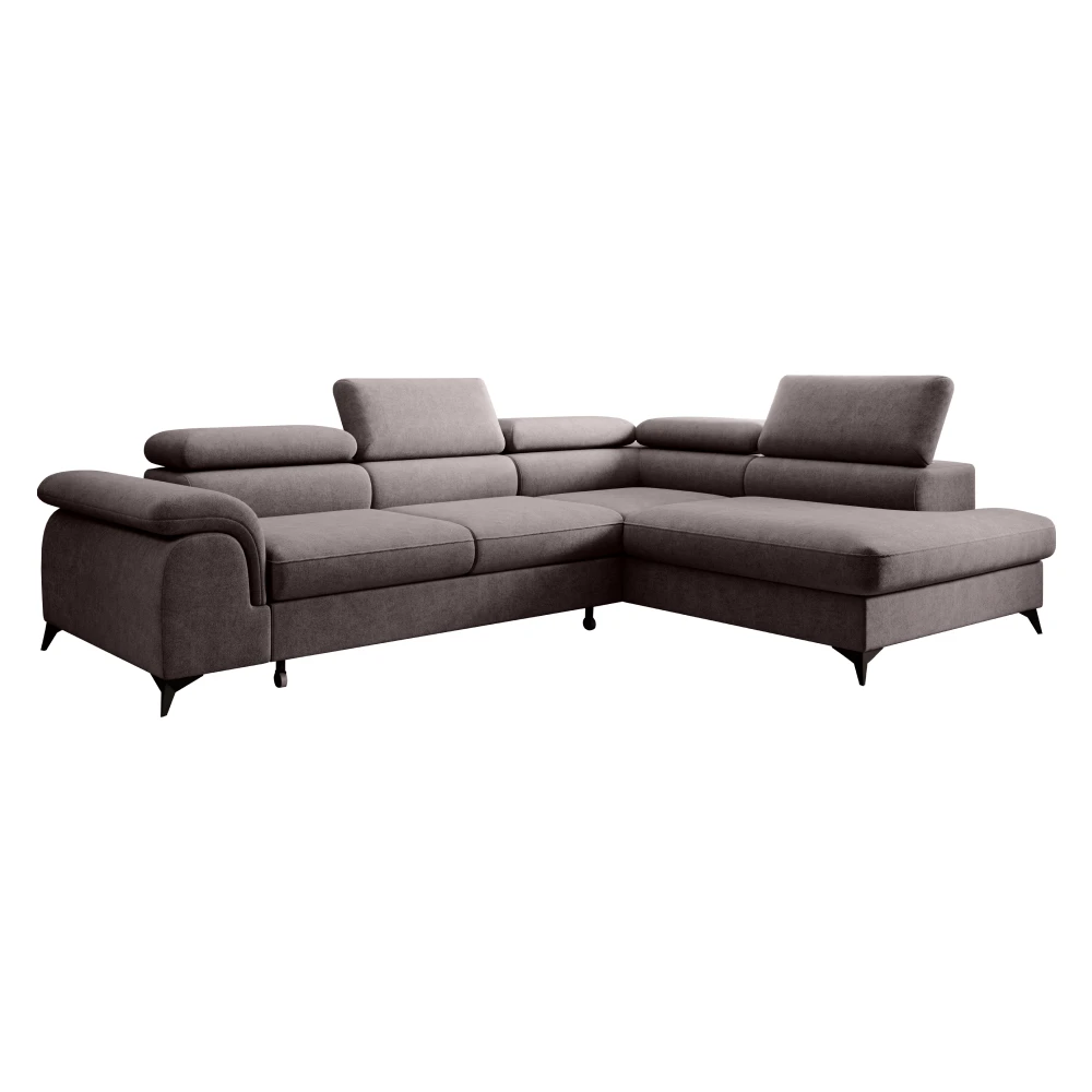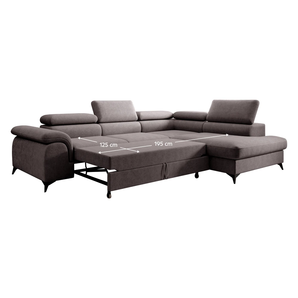 Tato moderní rohová sedací souprava v nadčasovém šedo-hnědém provedení představuje ideální kombinaci stylu, funkčnosti a pohodlí. Díky svému čistému designu, vzdušným kovovým nožičkám a preciznímu čalounění se stane dominantou každého interiéru – od minimalistických až po moderní či skandinávsky laděné.