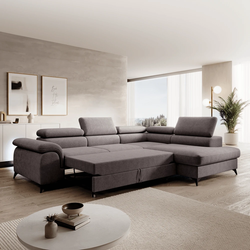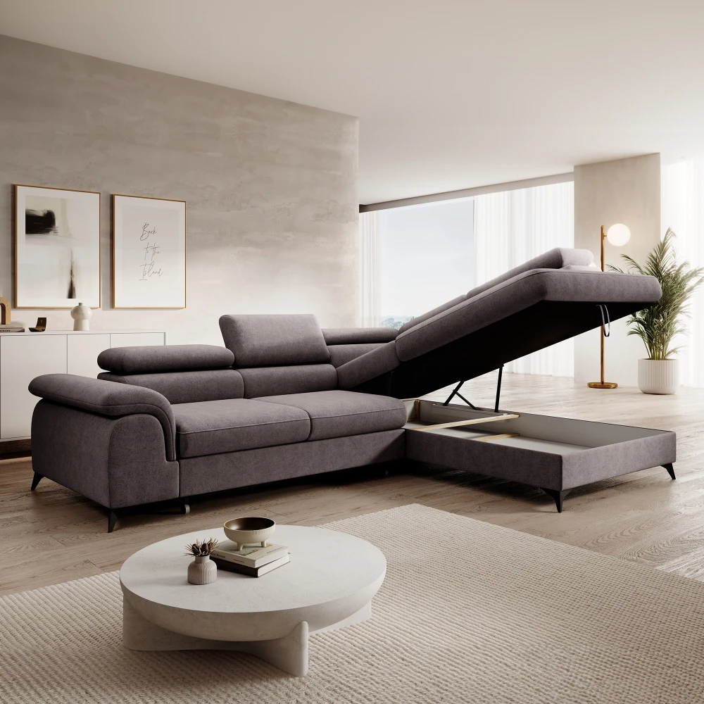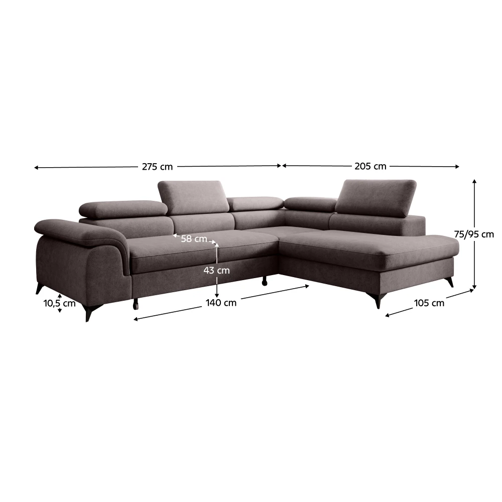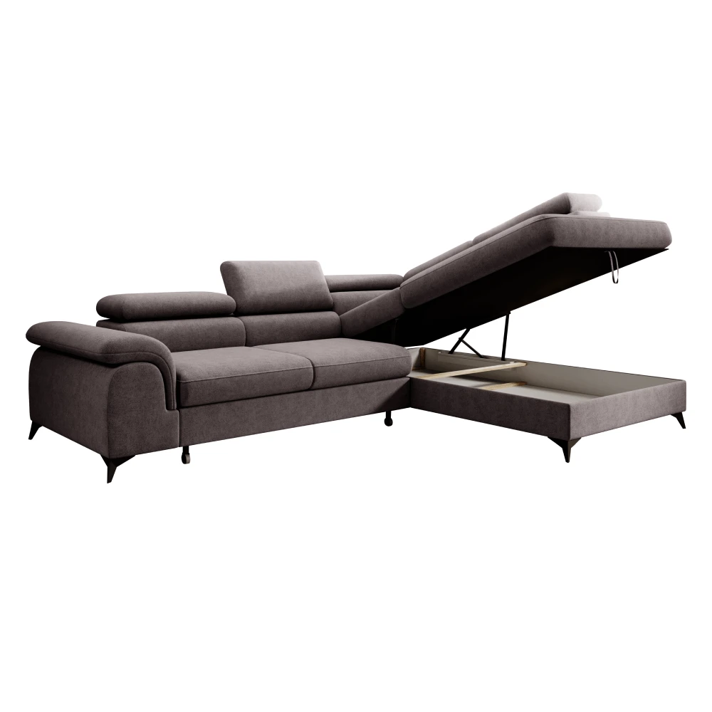 Tato moderní rohová sedací souprava v nadčasovém šedo-hnědém provedení představuje ideální kombinaci stylu, funkčnosti a pohodlí. Díky svému čistému designu, vzdušným kovovým nožičkám a preciznímu čalounění se stane dominantou každého interiéru – od minimalistických až po moderní či skandinávsky laděné.